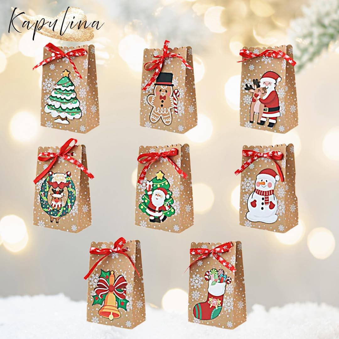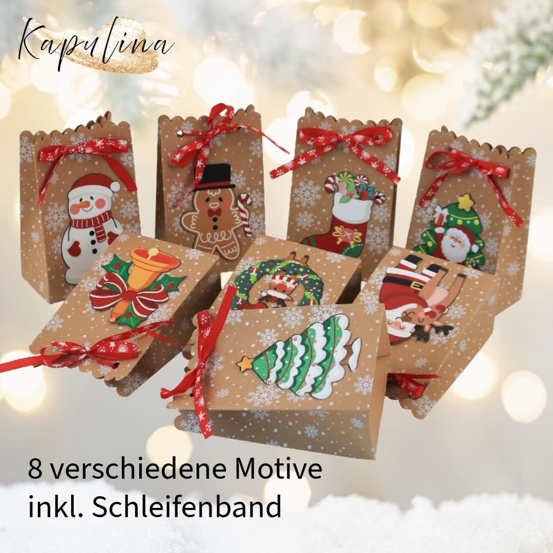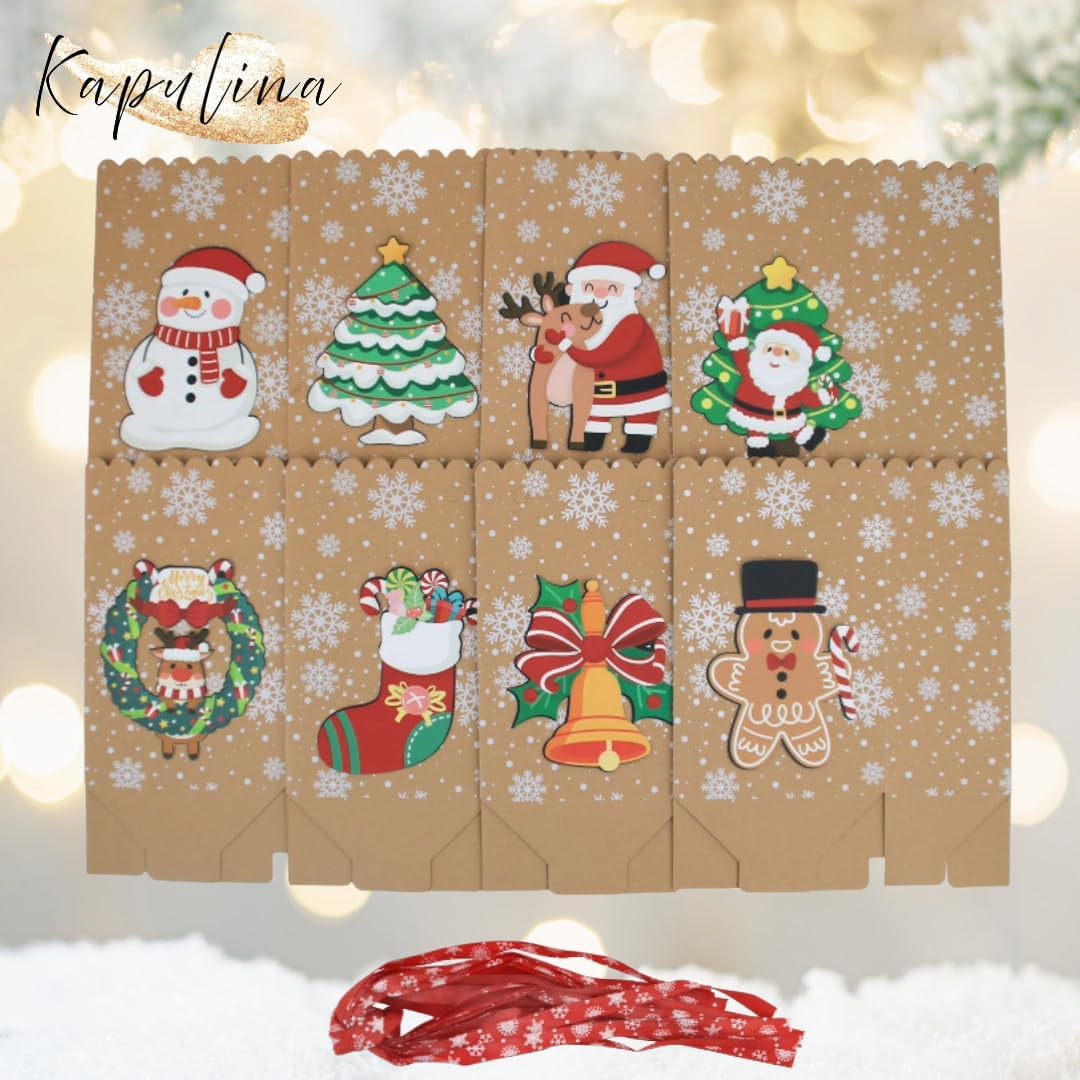 8 sacchetti regalo con motivi natalizi - Ideale per bambini, colleghi, famiglia o ospiti Aspetto carta kraft di alta qualità con motivi 3D - Progettato con cura e decorato a festa Incl. IVA. nastro rosso - Ogni borsa viene fornita con un fiocco coordinato per la chiusura Dimensioni per borsa: ca. 18,3 x 11,7 x 7,4 cm - Tanto spazio per piccoli regali, biscotti o souvenir Versatile e riutilizzabile - Perfetto per Babbo Natale, Natale, calendario dell'Avvento o come regalo per le feste