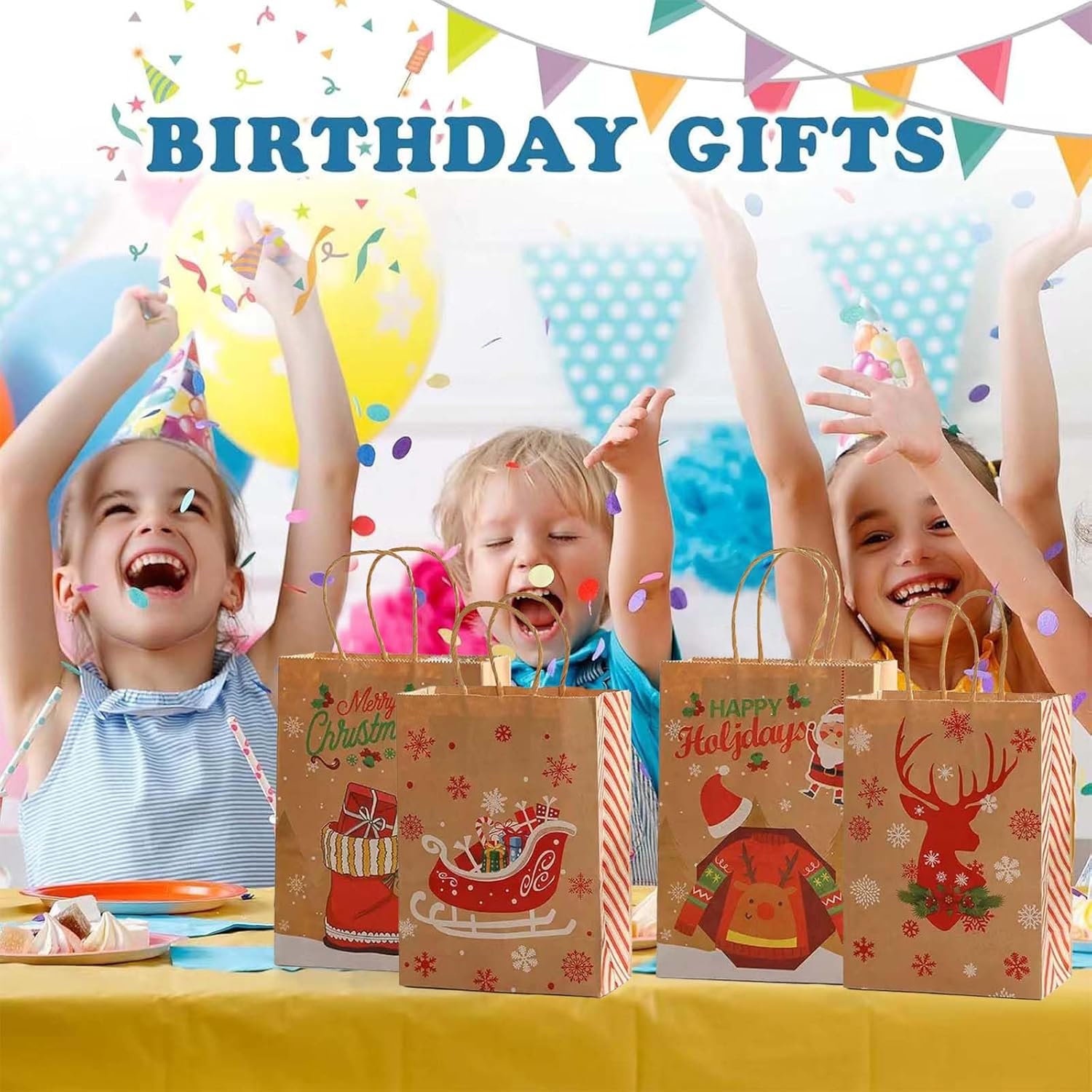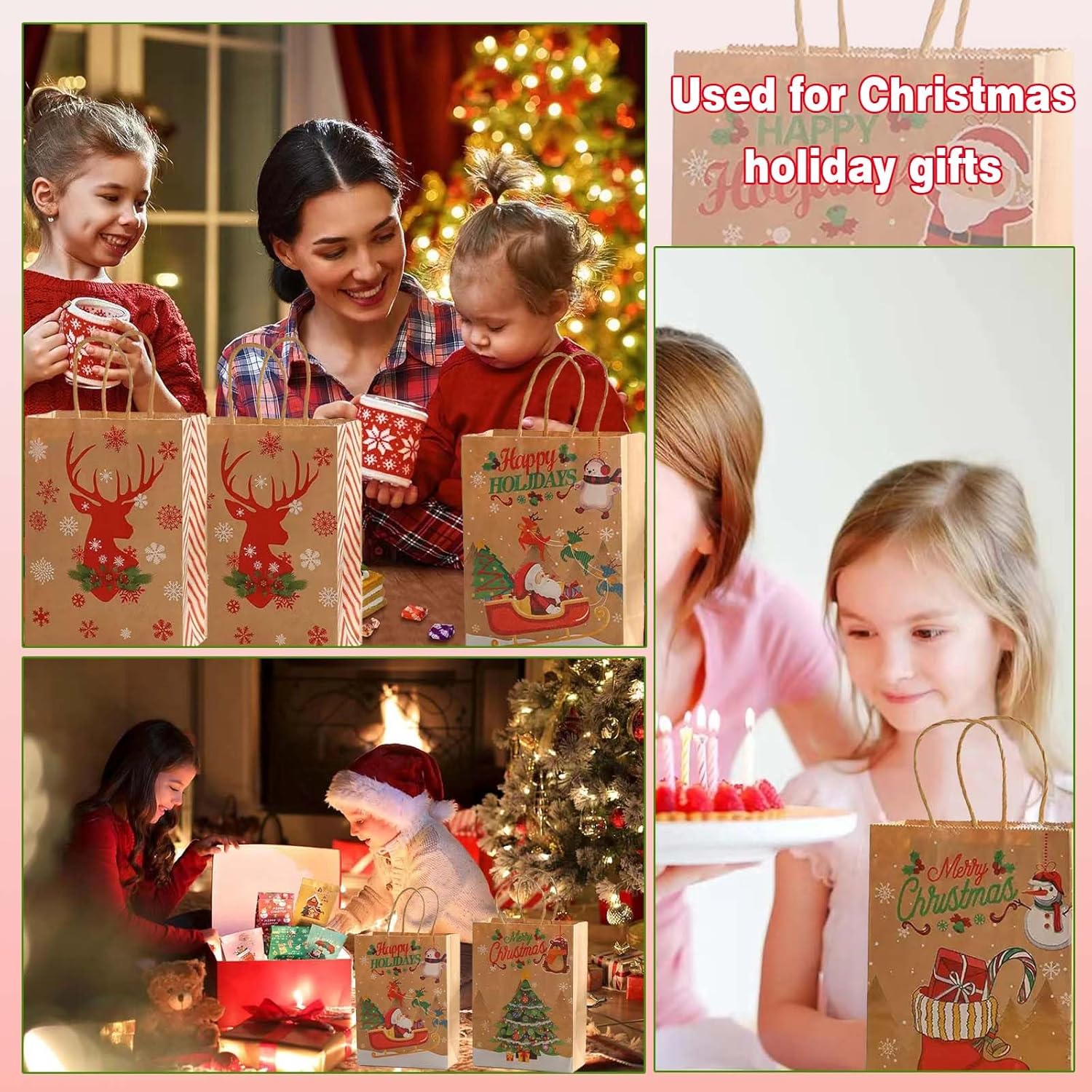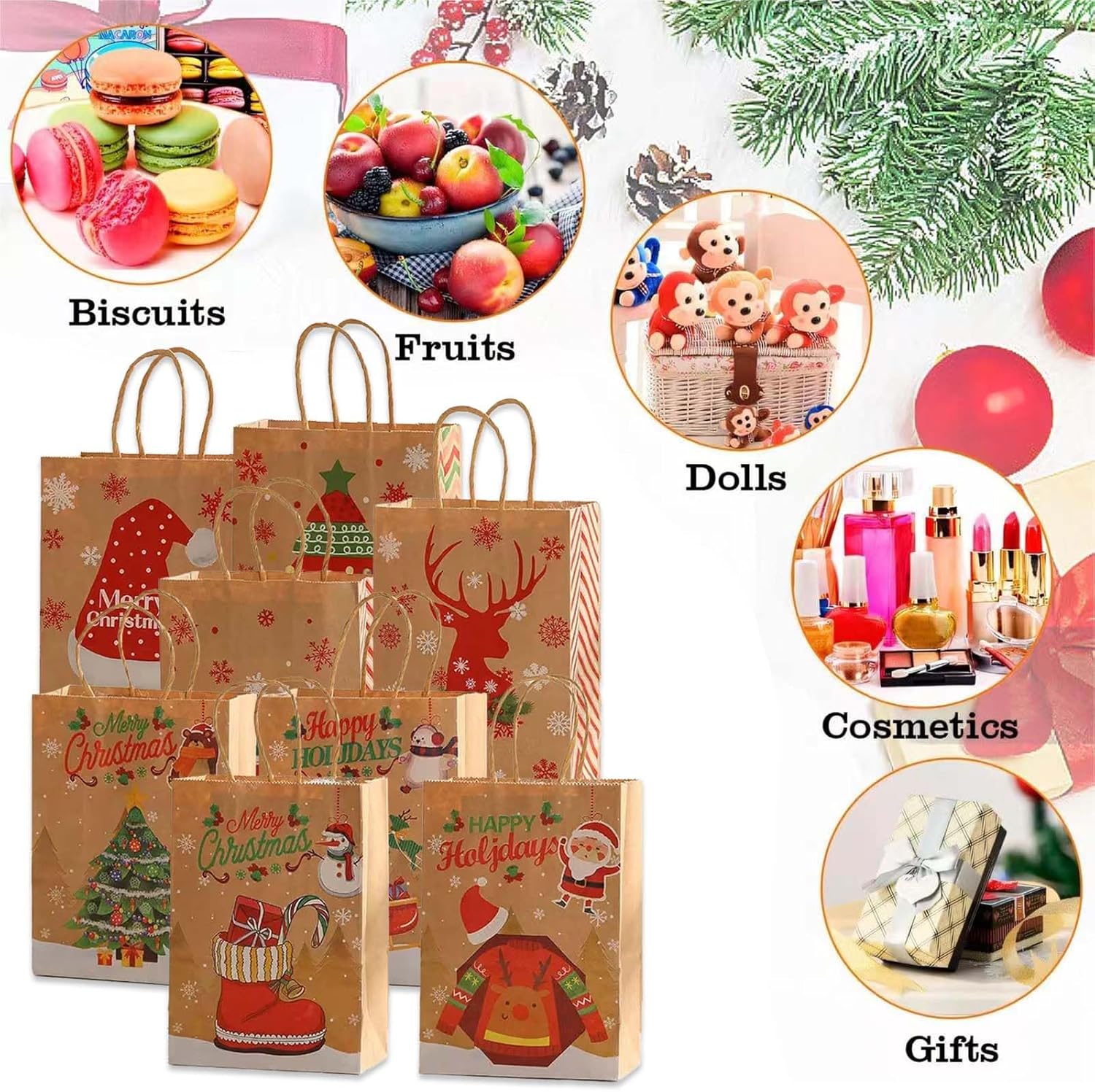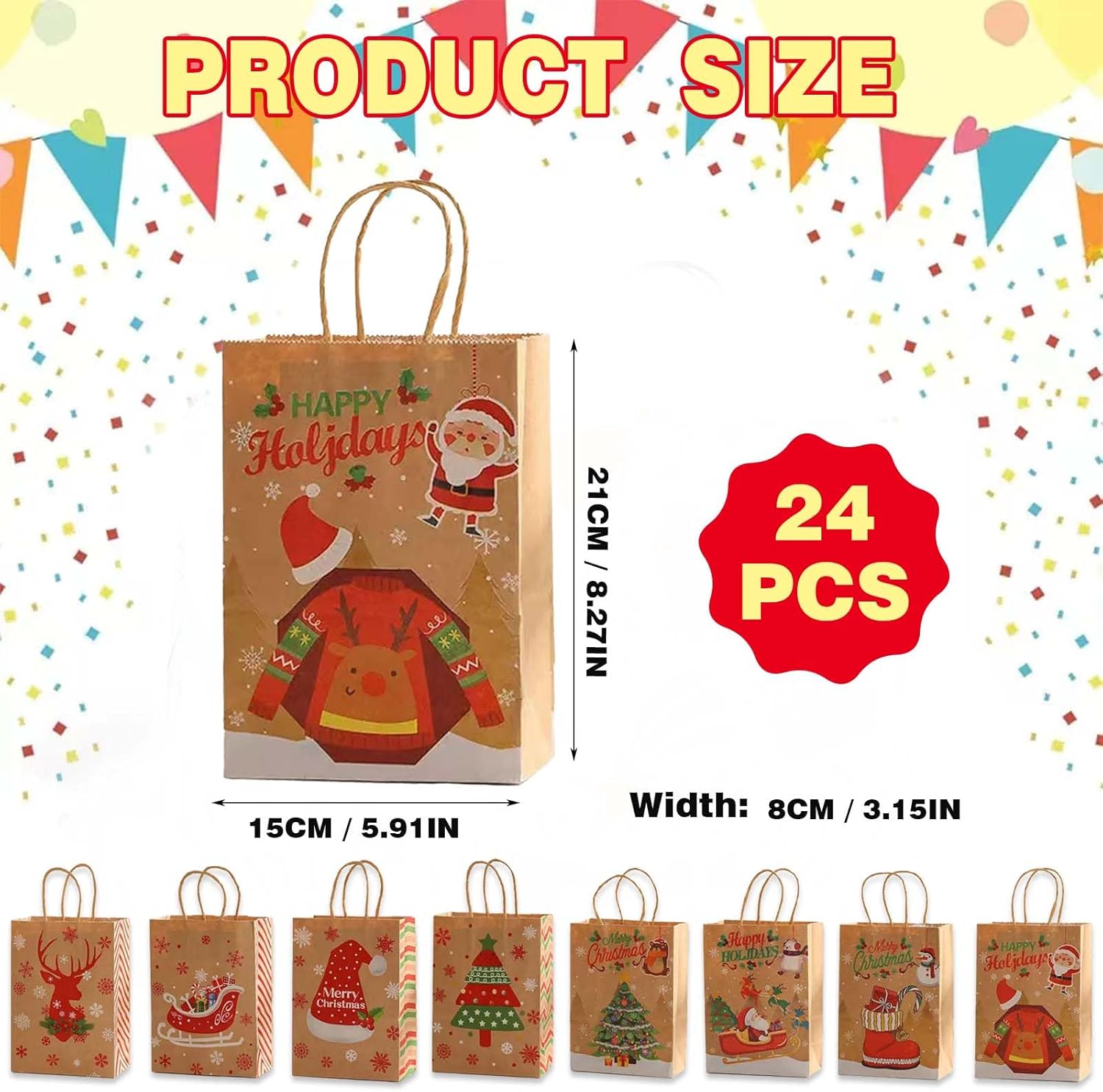 SET VERSATILE: Il nostro set contiene 24 sacchetti regalo di Natale di alta qualità con 8 diversi design natalizi, ciascuno rappresentato 3 volte, ideali per le tue esigenze di confezione regalo. DIMENSIONE PERFETTA: Misurando 15 x 8 x 21 cm (manici esclusi), queste borse natalizie offrono molto spazio per tutti i tipi di regali. Sono disponibili in una confezione da 24 e misurano 29.158 cm una volta piegati. Materiale di qualità: realizzati in carta kraft ecologica, inodore e sicura, questi sacchetti di Babbo Natale sono facili da piegare e aprire e sono sicuri anche per il contatto diretto con il cibo. Design a tema natalizio: con accattivanti motivi natalizi come albero di Natale, Babbo Natale, dolci, regali di Natale, soprammobili natalizi e renne, queste borse esprimono l'atmosfera festosa. Applicazione versatile: queste borse sono ideali per uomini e donne, perfette per confezionare regali di Natale e adatte a molte occasioni come feste di Natale, feste di Capodanno, vacanze, festival e banchetti.