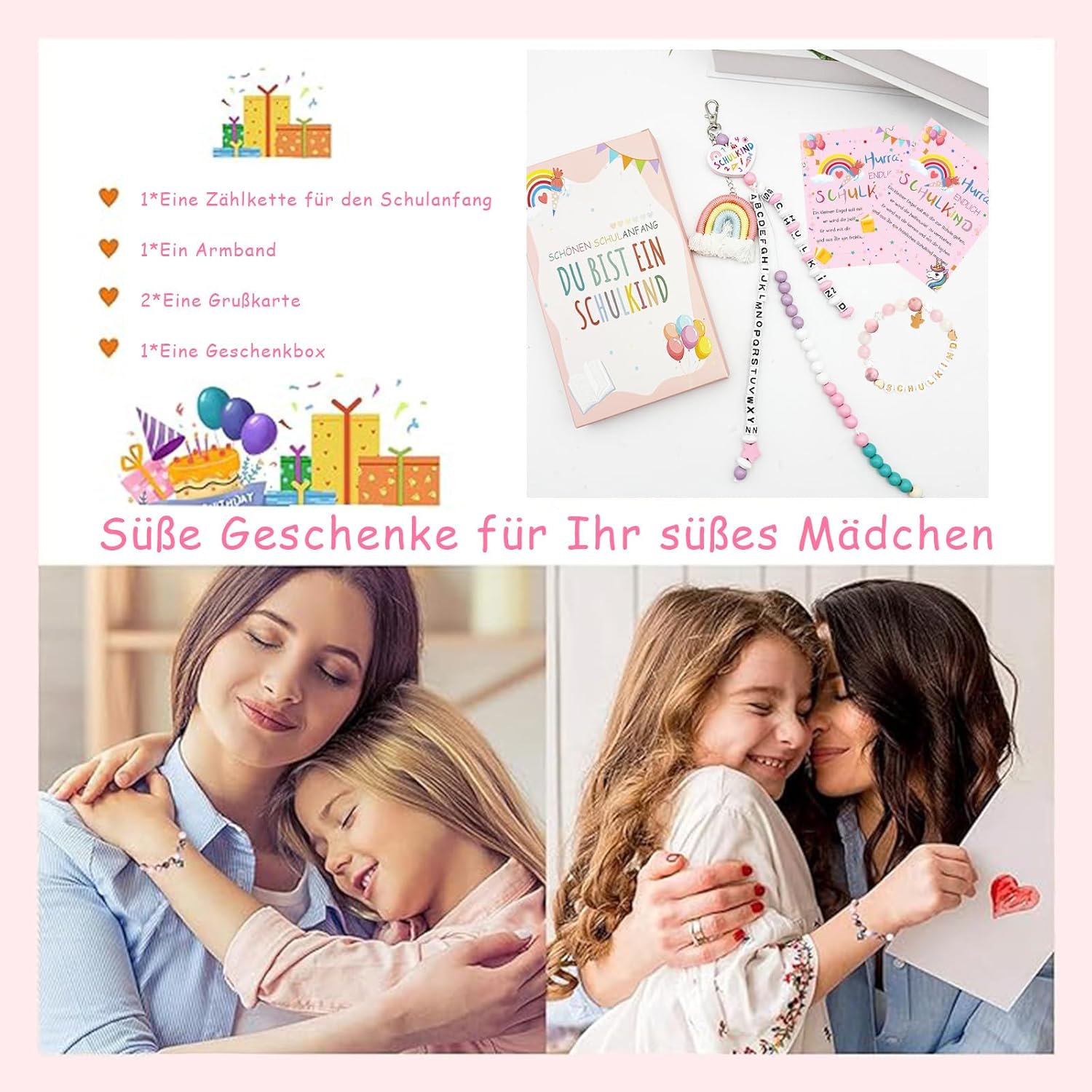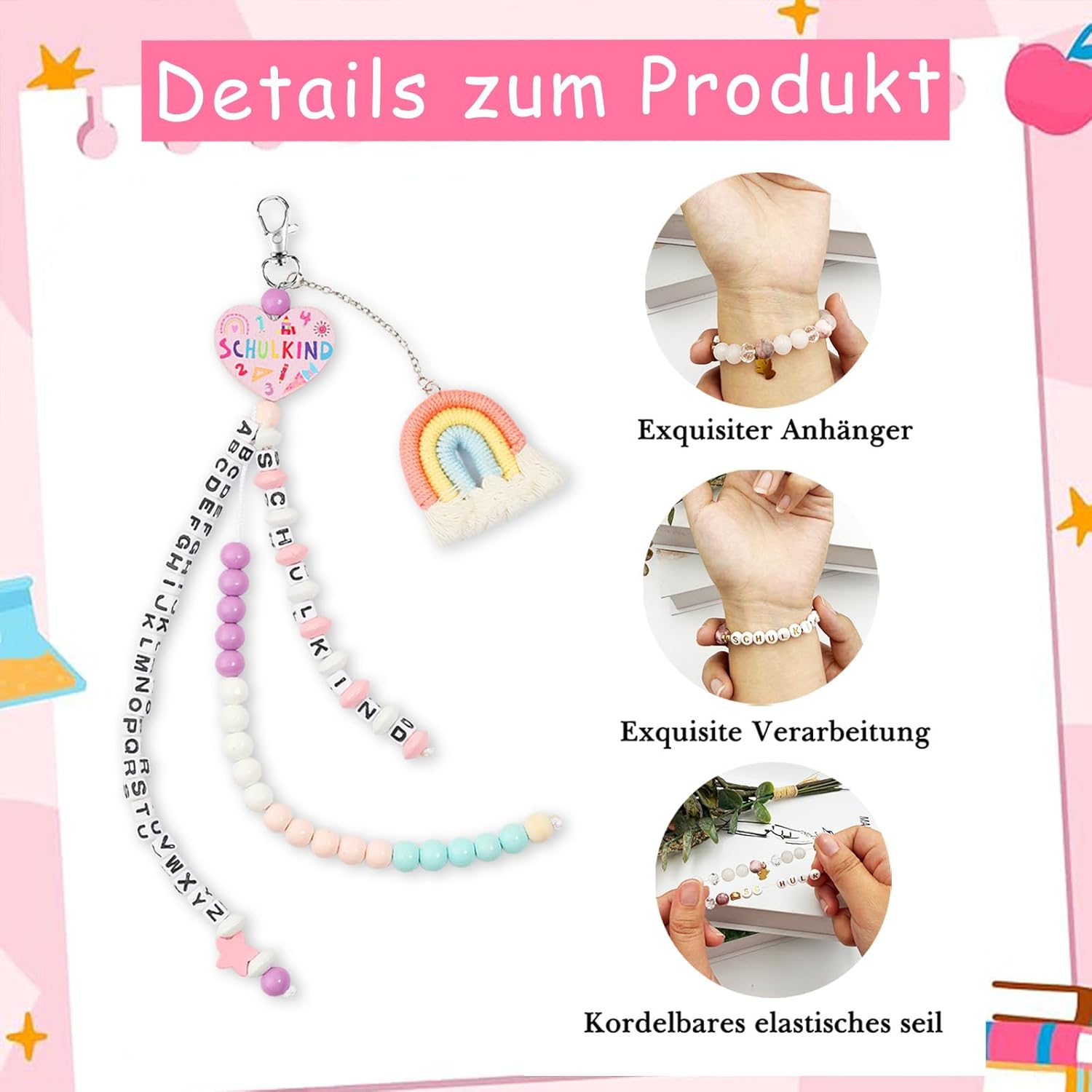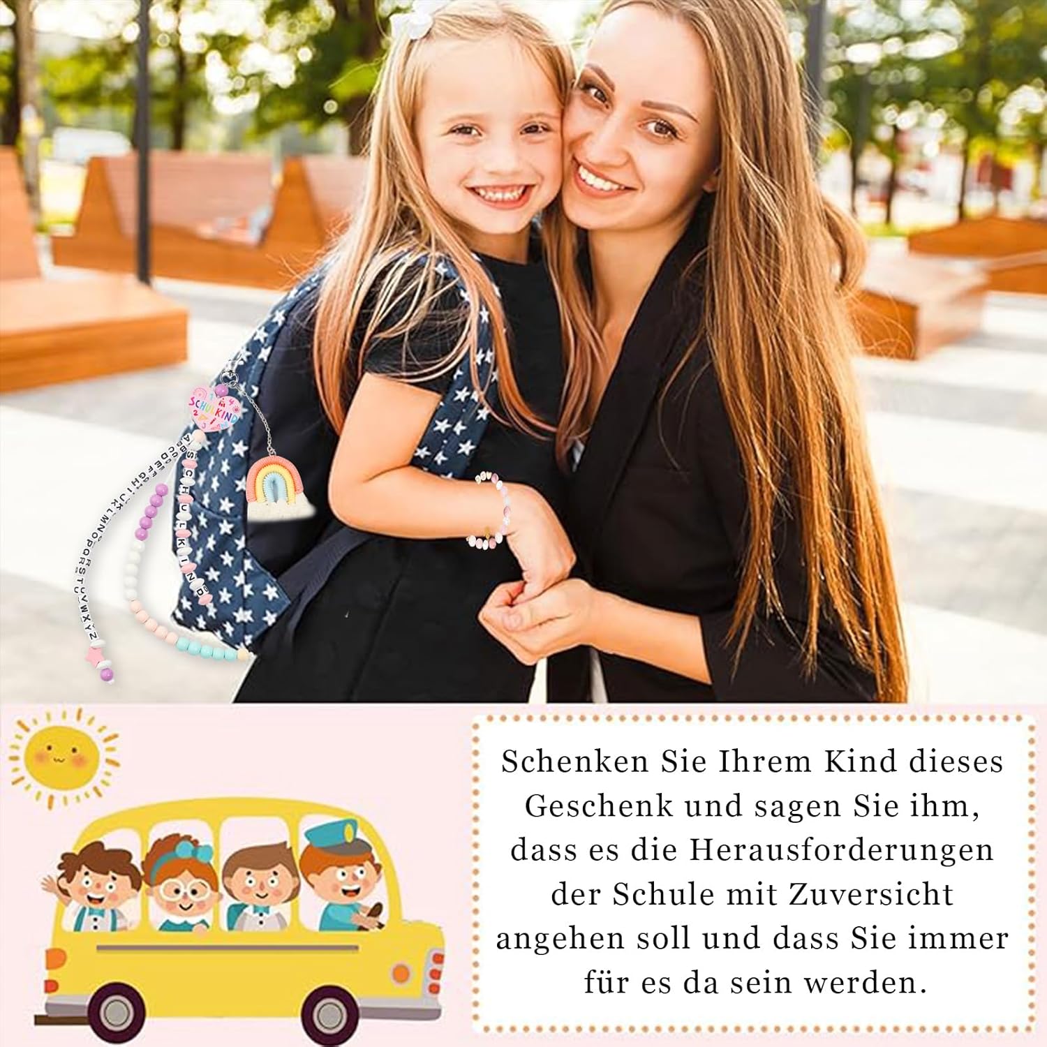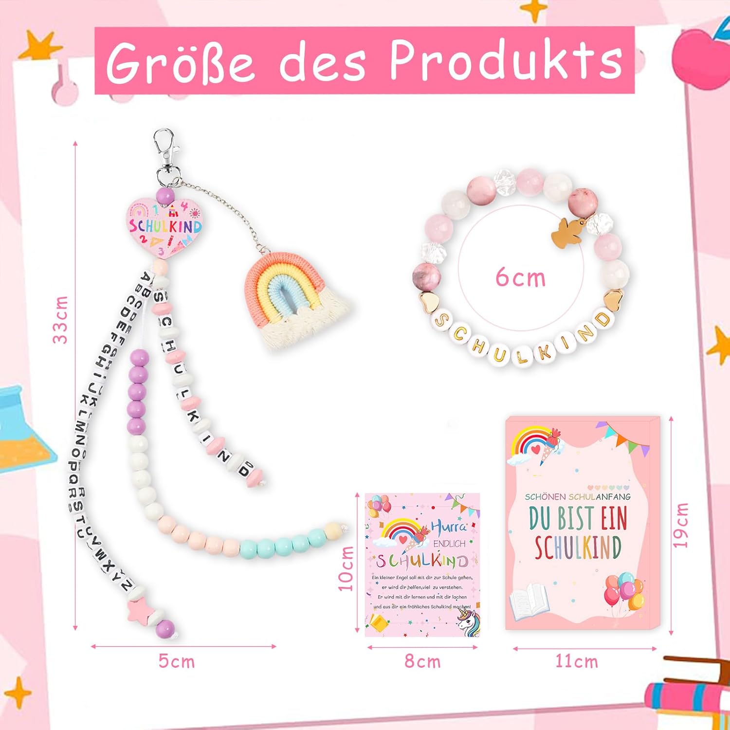 Regalo per la scuola: i bambini sono comprensibilmente ansiosi il primo giorno di scuola, e questo cono per la scuola per il primo giorno di scuola è il modo perfetto per confortare i vostri bambini mentre portano il loro amore da casa a scuola. Fai questo regalo a tuo figlio e digli che dovrebbe affrontare le sfide della scuola con fiducia e che sarai sempre lì per esso. Sacchetto per la scuola in tessuto per bambini 2025: questo set include una catena contabile per l'ingresso a scuola, un braccialetto, un biglietto di auguri e una confezione regalo. Ideale come regalo per l'inizio della scuola. Porta portafortuna unici con messaggi positivi e stimolanti e protezione e buona fortuna a ragazze e ragazzi che vanno a scuola nel 2025. Così la festa di scuola sarà sicuramente più divertente! Regalo ideale per sacchetti scolastici: i braccialetti per studenti sono progettati in modo unico e trasmettono un messaggio positivo e stimolante. Il ciondolo a forma di angelo custode simboleggia la benedizione e la protezione di una nuova ragazza. La collana Schoolbag Counts viene fornita con 3 nastri, uno con il segno dello studente e un altro con le 26 lettere dell'alfabeto, in modo che gli studenti possano imparare facilmente le 26 lettere dell'alfabeto. L'altro cordino ha 20 perline per aiutare gli studenti delle scuole elementari a imparare lo spazio dei numeri fino a 20 e l'aggiunta e la sottrazione. Materiale fine: lega e perle di alta qualità selezionate, accuratamente lucidate per garantire che il bracciale sia lucido e durevole. La catena del bracciale è flessibile e comoda da indossare. Multiuso: porta con sé la matematica scolastica e il braccialetto, appenderlo allo zaino o alla borsa della scuola e lasciarlo accompagnare in qualsiasi momento. Che si tratti di voi stessi o dei figli dei vostri amici e familiari, questo simpatico set è un'ottima scelta.