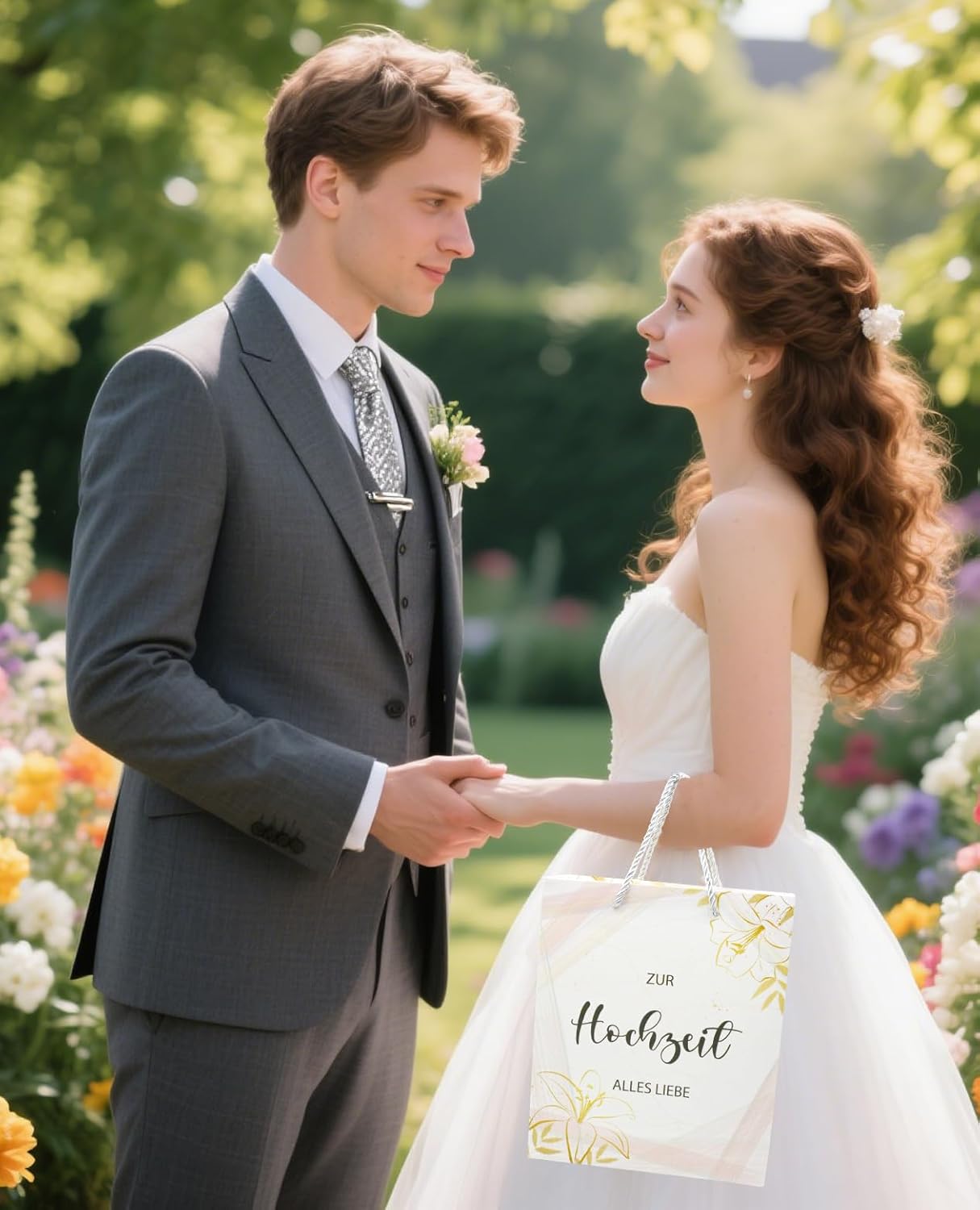 Offerta speciale: 1x sacchetto regalo di nozze con manico (stampato con "ALL THE WEDDING") + 2x fogli di carta velina bianca. 𝑴𝒂ß𝒆: sacchetto regalo: ca. 22 cm (larghezza) x 10 cm (profondità) x 26 cm (altezza); carta velina: ca. 50 x 70 cm (per foglio); Possibili applicazioni: la carta velina è adatta sia per decorare il sacchetto regalo che per confezionare piccoli regali. Eccellente: le nostre borse da matrimonio sono realizzate in cartone speciale extra spesso, idrorepellente ed estremamente robusto. Grazie alla sua elevata stabilità, la borsa non si rompe né si strappa facilmente e può essere utilizzata più e più volte. Grande capacità: questi sacchetti regalo di nozze di alta qualità offrono spazio sufficiente per regali in denaro, dolci, torte o piccole bomboniere. Grazie alle robuste maniglie in corda, sono facili da trasportare. Eccellente: gli eleganti sacchetti da imballaggio servono come accessorio decorativo e pratica confezione regalo per matrimoni e addii al celibato - perfetti per gli sposi, lo sposo o la sposa.