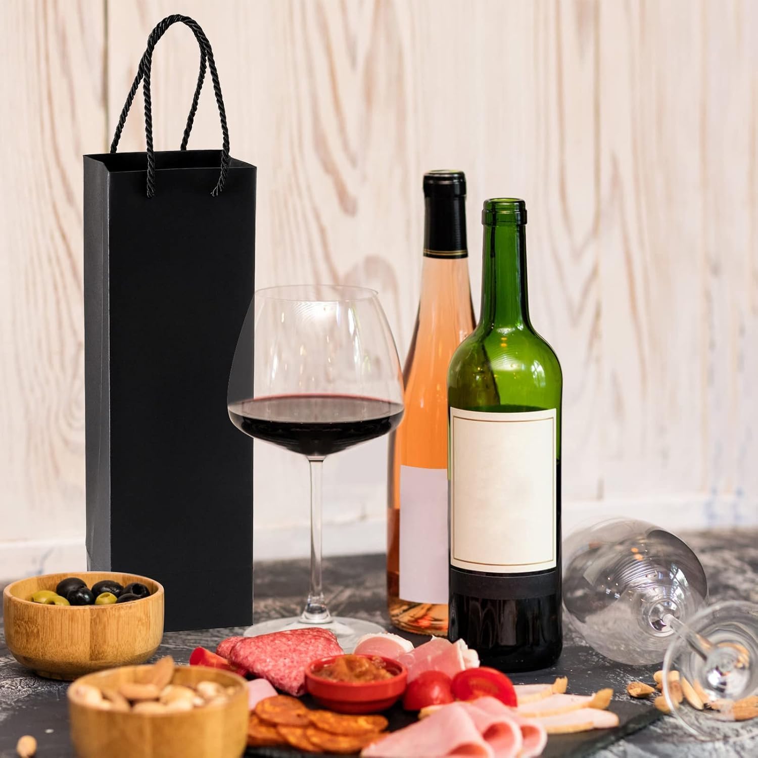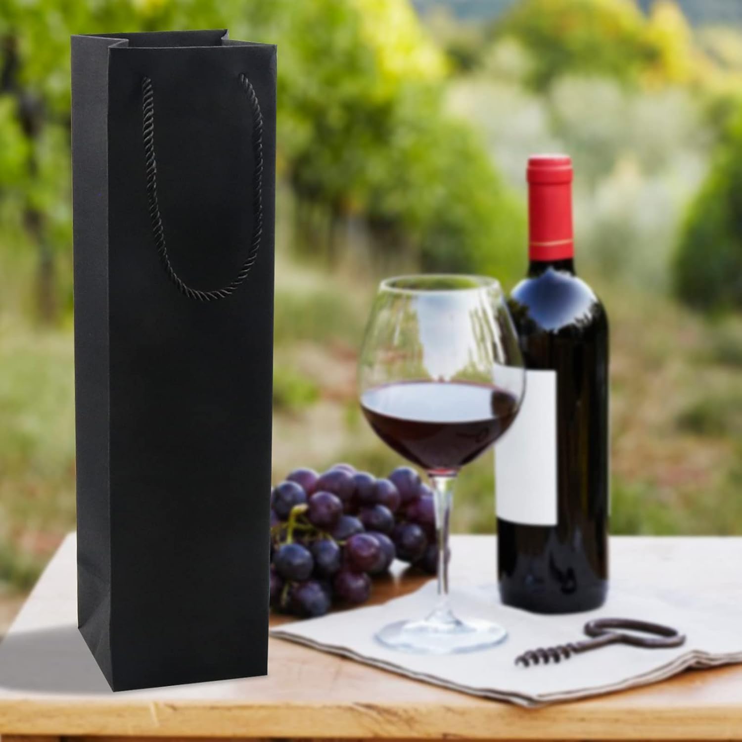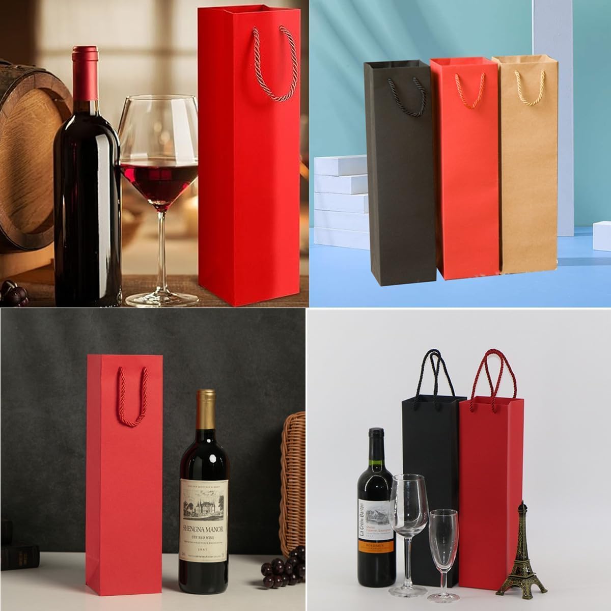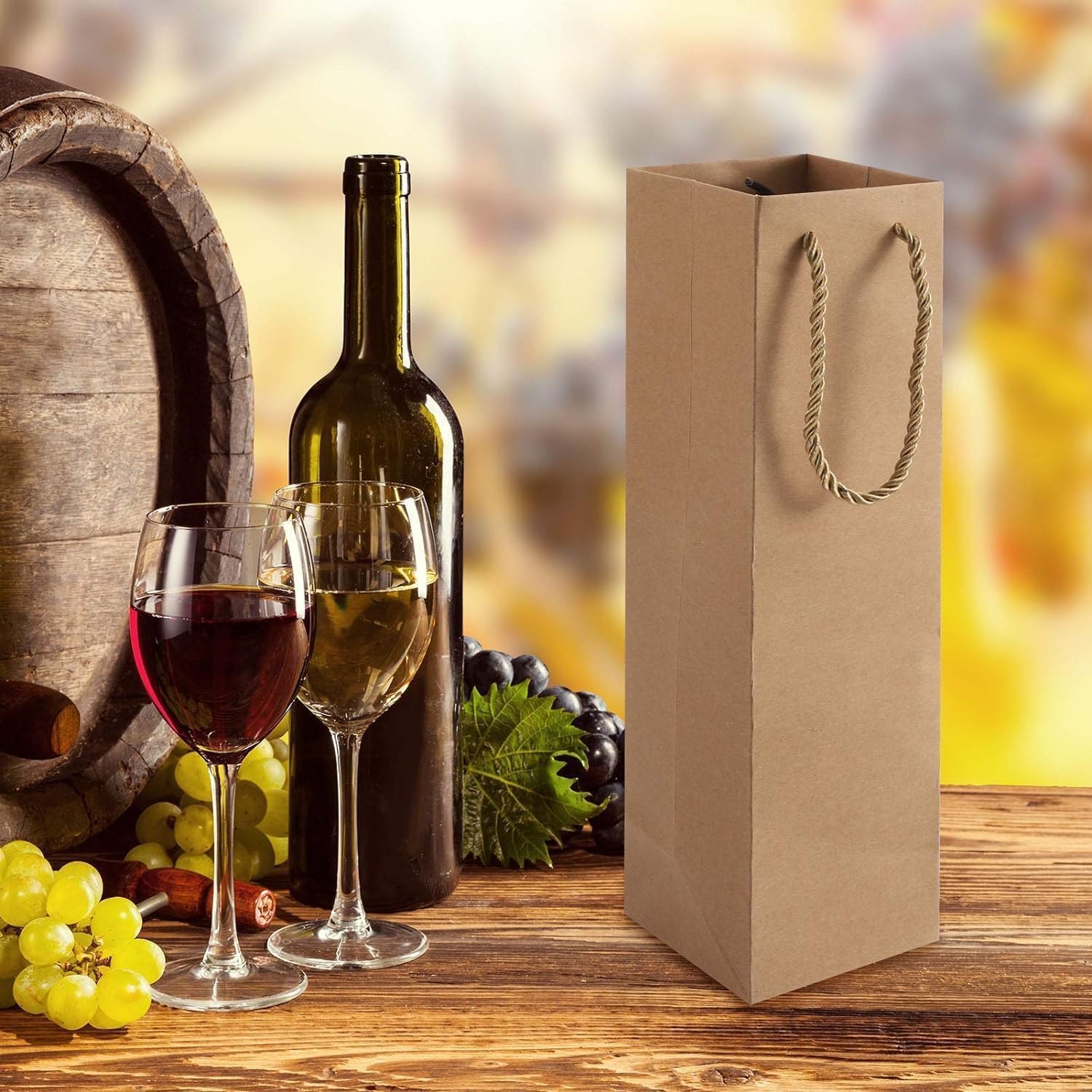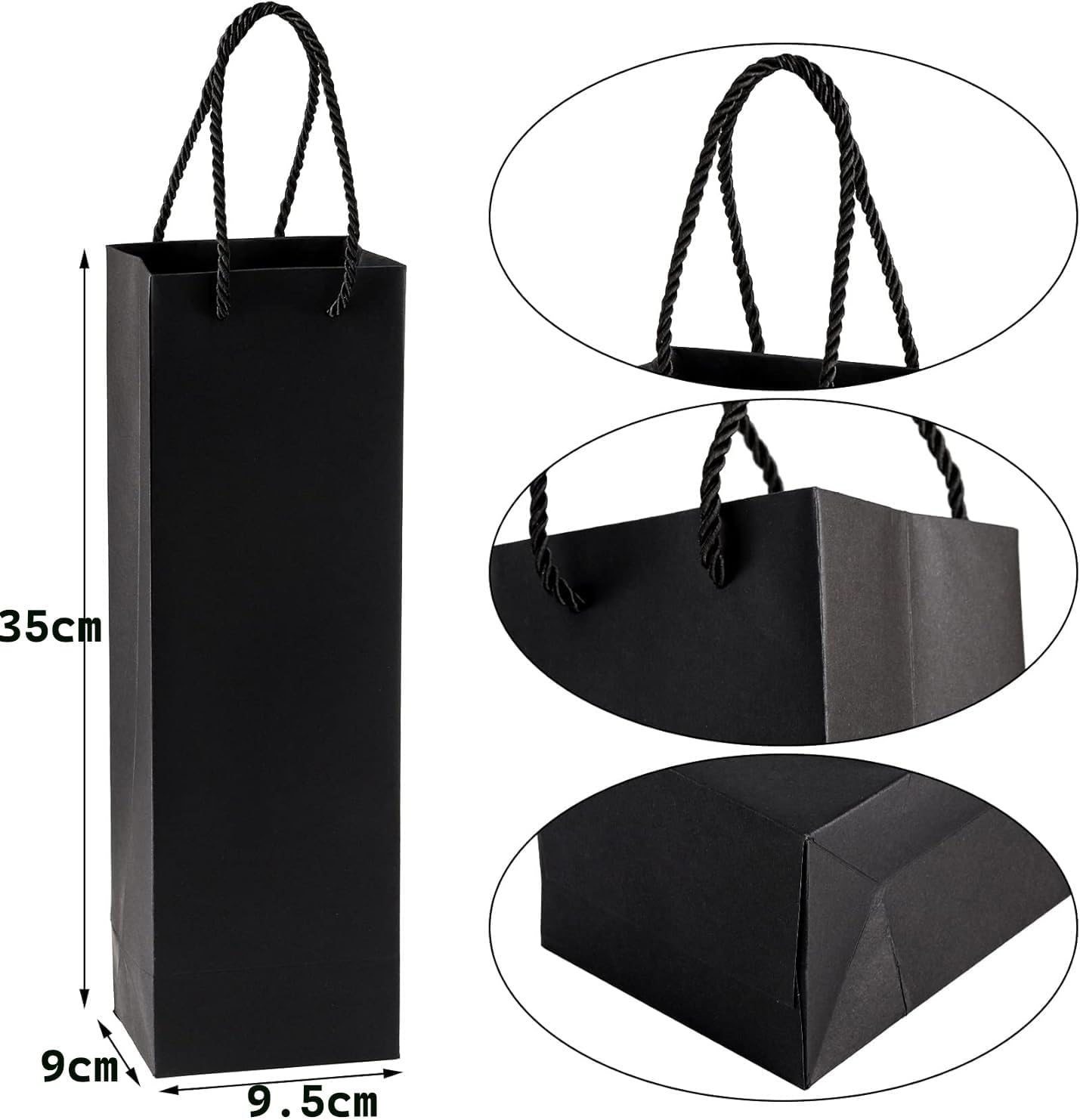 Materiale di alta qualità: i sacchetti regalo per bottiglie di vino sono realizzati in materiale kraft resistente, quindi la borsa non si strapperà o si romperà facilmente. La qualità del materiale consente un utilizzo affidabile e duraturo e protegge ogni bottiglia di vino durante il trasporto e la consegna. Bella presentazione: il sacchetto di carta per bottiglia di vino è dotato di un fondo rinforzato e di una maniglia per una presa stabile. Questi sacchetti per bottiglia singola rendono il tuo vino più delicato e attraente e sono adatti per confezioni regalo. Le scatole regalo per vino nere sono molto eleganti e di classe per ogni occasione. Dimensioni della borsa per vino in carta: la nostra borsa per vino in carta kraft misura 35 x 9,5 x 9 cm ed è adatta per una bottiglia di vino standard da 750 ml. Buon consiglio: progettato per una bottiglia di vino standard o una fiaschetta, adatto solo per il peso di una bottiglia di vino. Si prega di non caricarlo troppo pesantemente, altrimenti potrebbe cadere e rompersi. MULTIUSO - Il sacchetto regalo per bottiglia da uomo è ottimo per trasportare vino pregiato, champagne, liquori e qualsiasi tipo di liquore. I sacchetti regalo per vino possono essere utilizzati come sacchetti per la spesa, sacchetti per caramelle, sacchetti regalo e sacchetti per dolcetti, adatti a varie occasioni festive come inaugurazione della casa, compleanni, Natale e Capodanno. Fai da te: i sacchetti regalo in carta kraft non possono essere utilizzati solo per imballare e decorare, ma puoi anche scrivere e disegnare sopra il tuo marchio, logo e idee per renderlo speciale.
