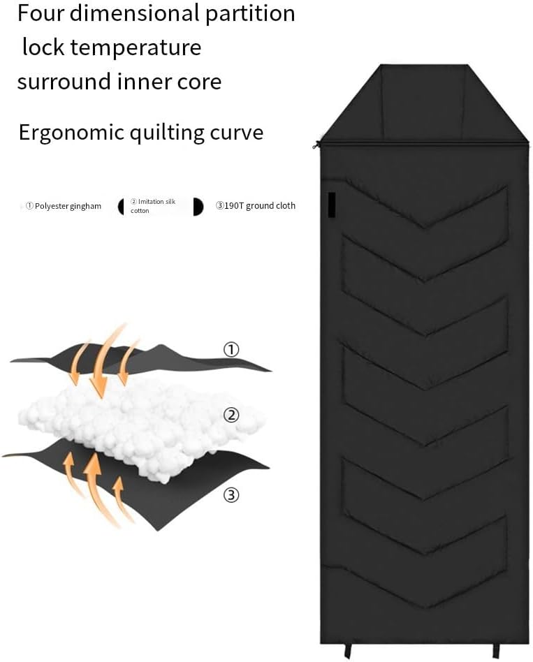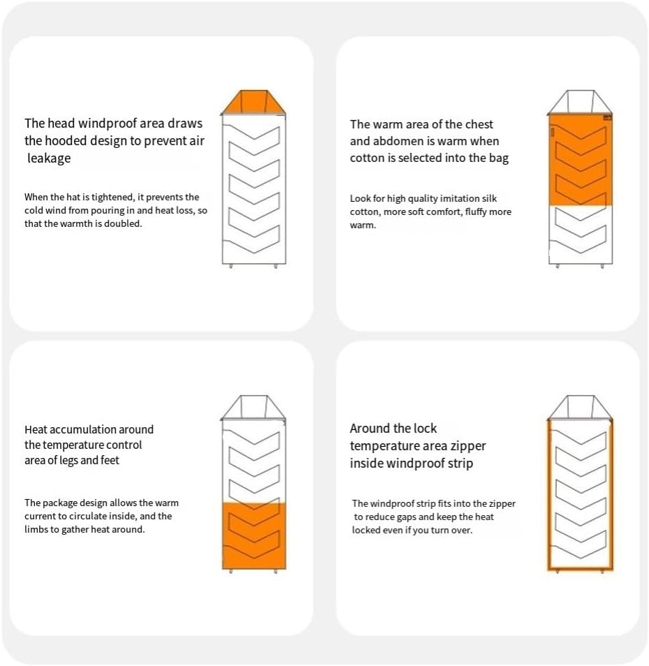 [Zona notte spaziosa] Goditi una generosa zona notte da 220 x 80 cm che consente libertà di movimento, ideale per chi preferisce dormire comodamente senza restrizioni. [INNOVATIVA RITENZIONE DEL CALO] La tecnologia di blocco termico a quattro zone combinata con cuciture ergonomiche ti assicura di rimanere caldo e accogliente anche a basse temperature. Materiali interni confortevoli: i materiali morbidi al tatto utilizzati nella fodera offrono una sensazione di lusso sulla pelle mantenendoti aderente tutta la notte. Design facile da usare: regola il cappuccio con coulisse senza sforzo per creare una barriera contro le correnti fredde, migliorando il calore generale durante il sonno. [Leggero e facile da imballare] Progettato per la portabilità, questo sacco a pelo include una comoda borsa portaoggetti, che lo rende facile da trasportare in campeggio o escursioni all'aperto.