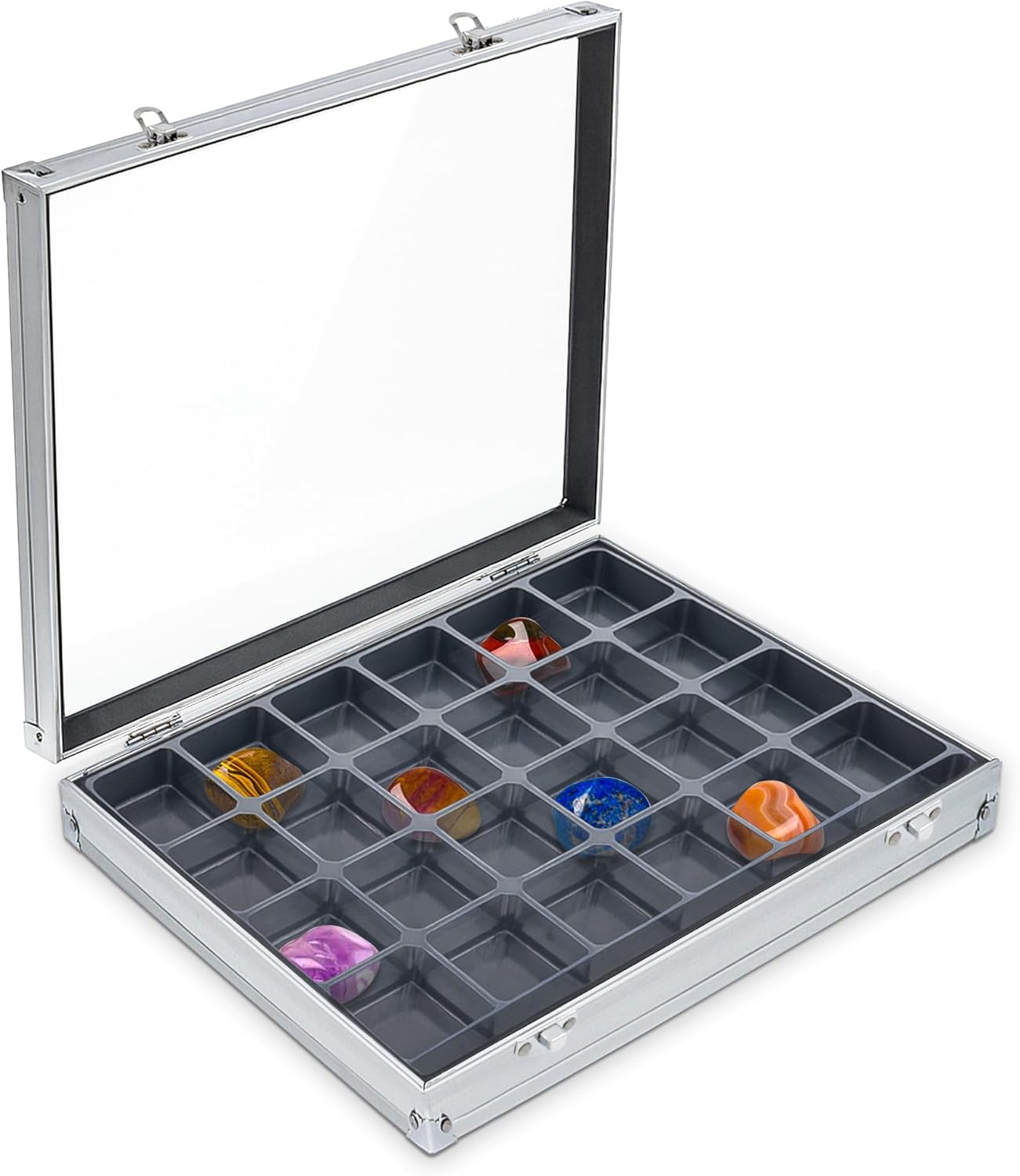 ✅ Robusta vetrina in alluminio con 24 scomparti da 65 x 58 mm – ideale per minerali, figurine, Lego ✅ Coperchio trasparente e 2 robuste chiusure a ribalta per una conservazione sicura ✅ Doppie cerniere consentono una comoda apertura del coperchio a più di 90° ✅ Inserto rimovibile – adattabile a diversi oggetti da collezione ✅ Possibilità di montaggio a parete verticale o orizzontale – flessibilità di presentazione