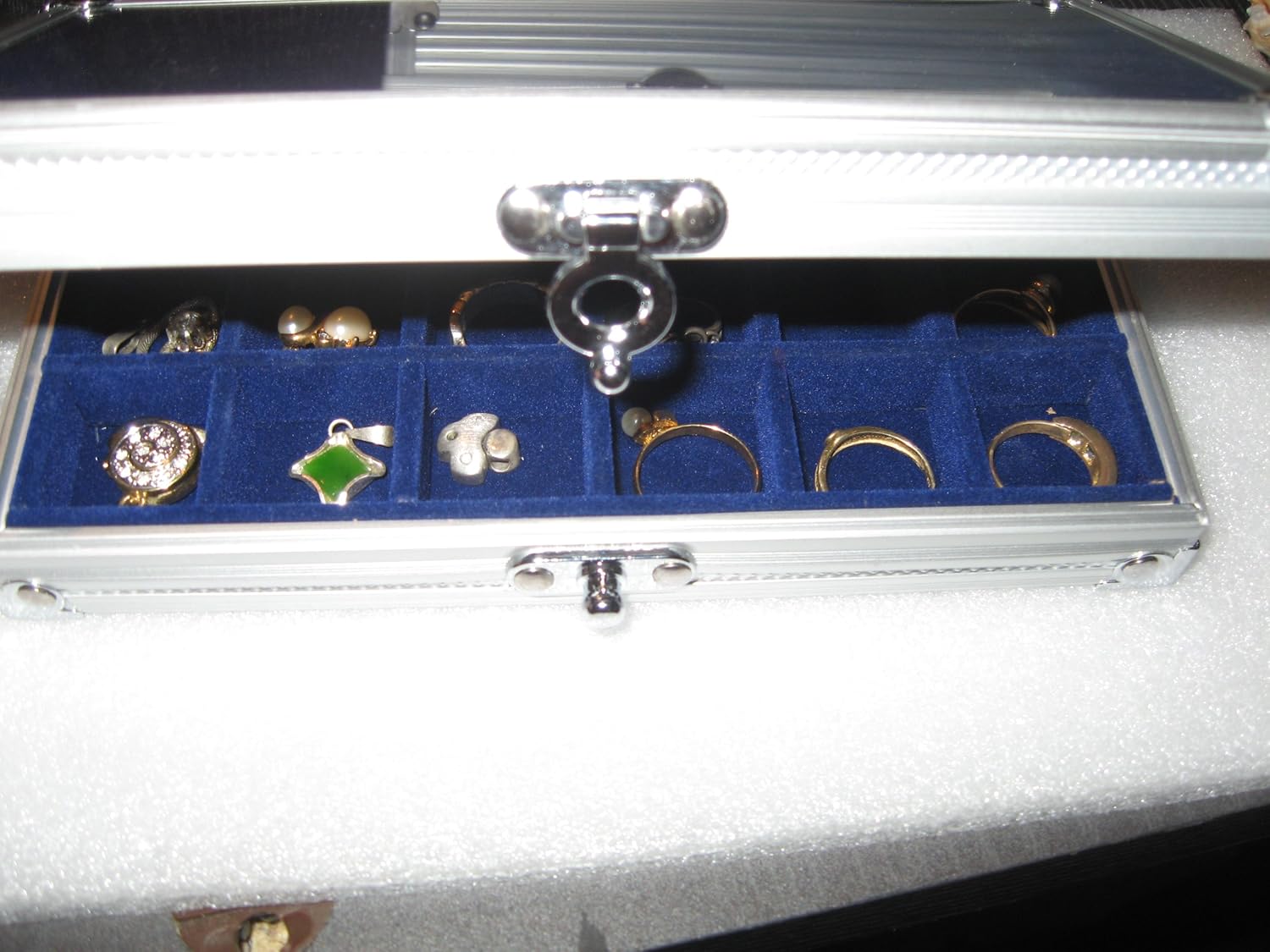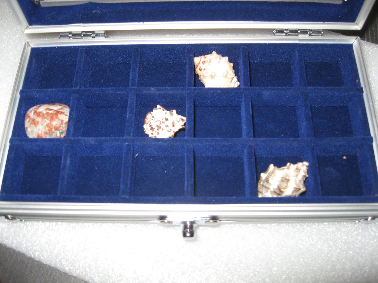 Scatola in alluminio con coperchio trasparente. Fondo in velluto blu comprensivo di 18 alloggiamenti 30 x 30 x Altezza 35 mm. Angoli esterni rinforzati. Chiusura. Dimensioni: 195 x 110 x 40 mm. Per piccoli oggetti: minerali, gioielli, ecc.