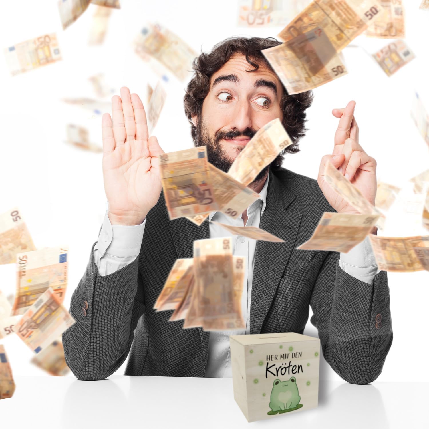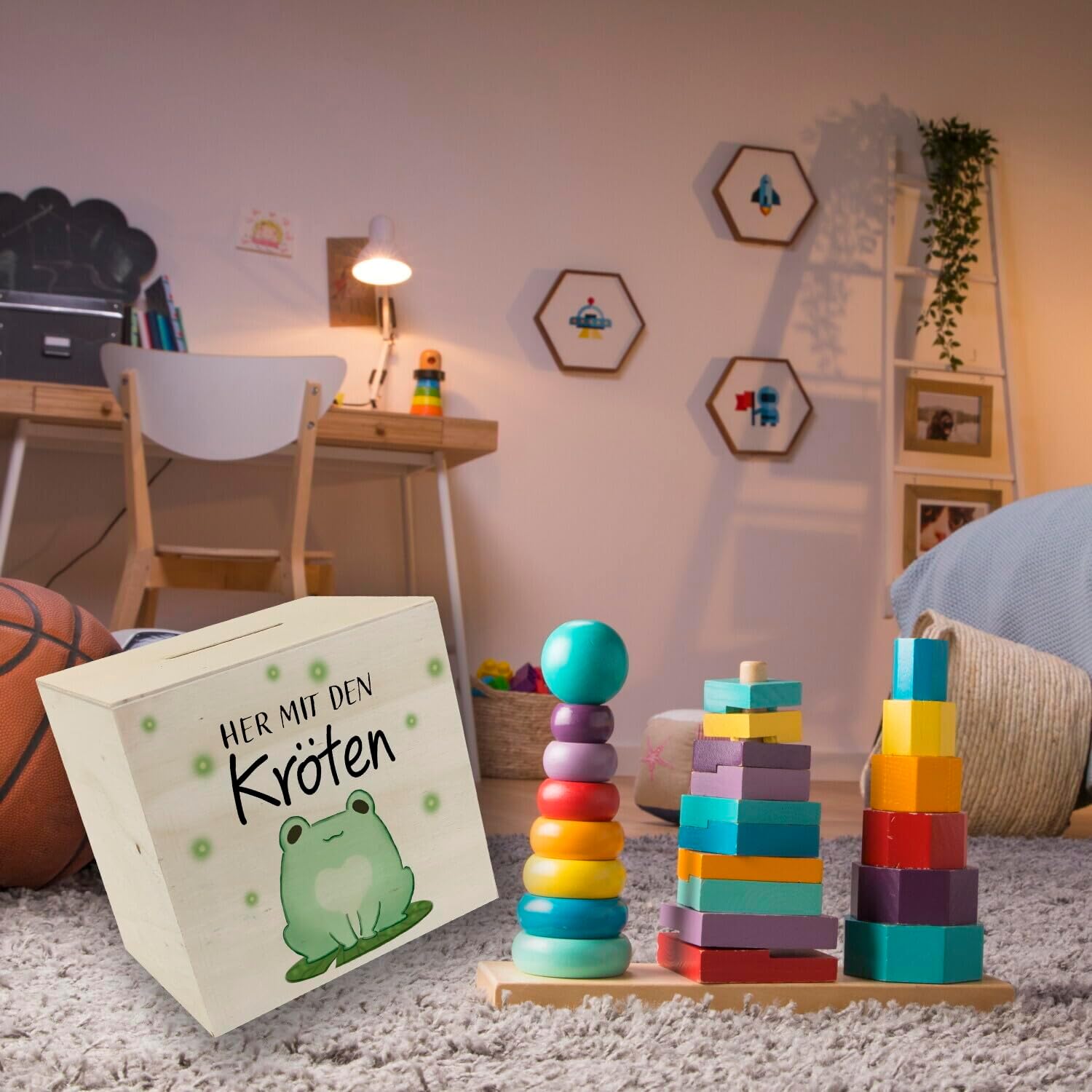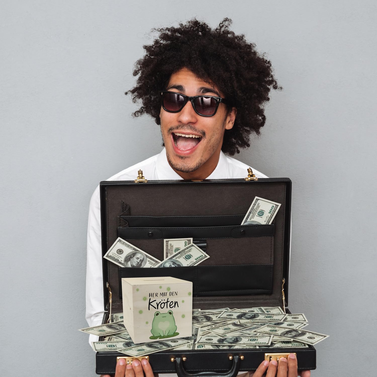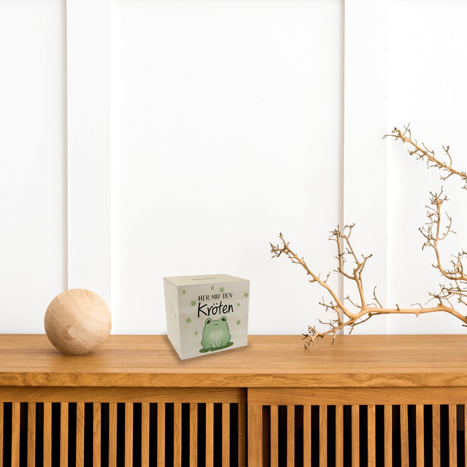 Fornitura: 1x salvadanaio in legno con rana con la scritta Bring on the rospi. Il salvadanaio è decorato con una simpatica rana sorridente che tiene al sicuro le tue monete e banconote. Questo design a fumetti kawaii porta un tocco allegro nella stanza di ogni bambino. I salvadanai sono ideali per insegnare a bambini e ragazzi il valore del denaro e del risparmio. Il detto Portate i rospi è un divertente gioco di parole che riprende il motivo della rana. Rospo in gergo significa denaro, quindi la rana incoraggia indirettamente le persone a mettere più soldi nel salvadanaio. È un piccolo incentivo per non dimenticare di risparmiare. Stai cercando un regalo carino e divertente per il compleanno di un adolescente? Questo salvadanaio è perfetto! Puoi anche riempirlo con un piccolo capitale iniziale. È anche un ottimo regalo per ogni occasione in cui un po' di umorismo e un suggerimento salvifico non farebbero male. Salvadanaio in legno di alta qualità con stampa colorata sulla parte anteriore. Con tappo in plastica per prelevare denaro sul fondo. Altezza ca. 9,8 cm, larghezza ca. 10,1 cm e profondità ca. 8 cm. Peso ca. 74 g.