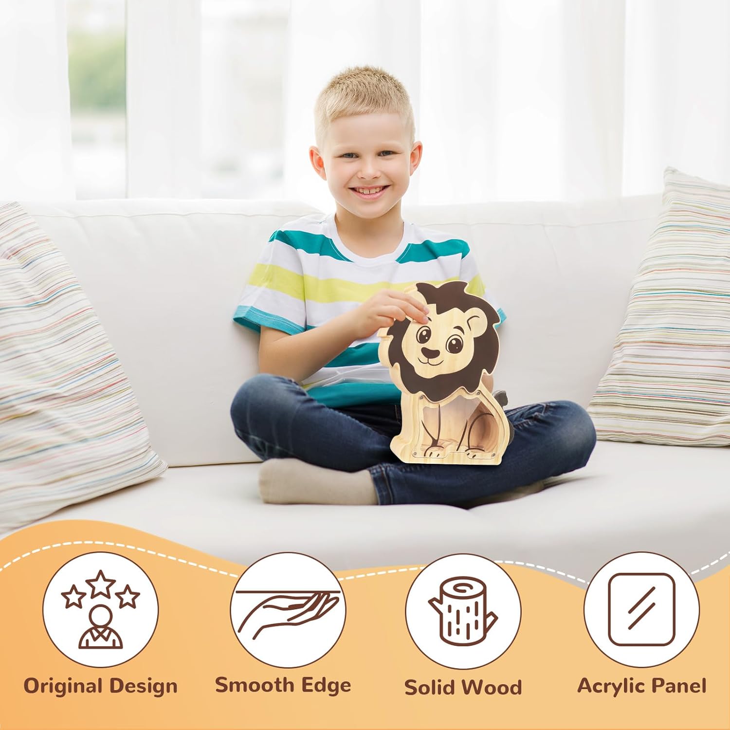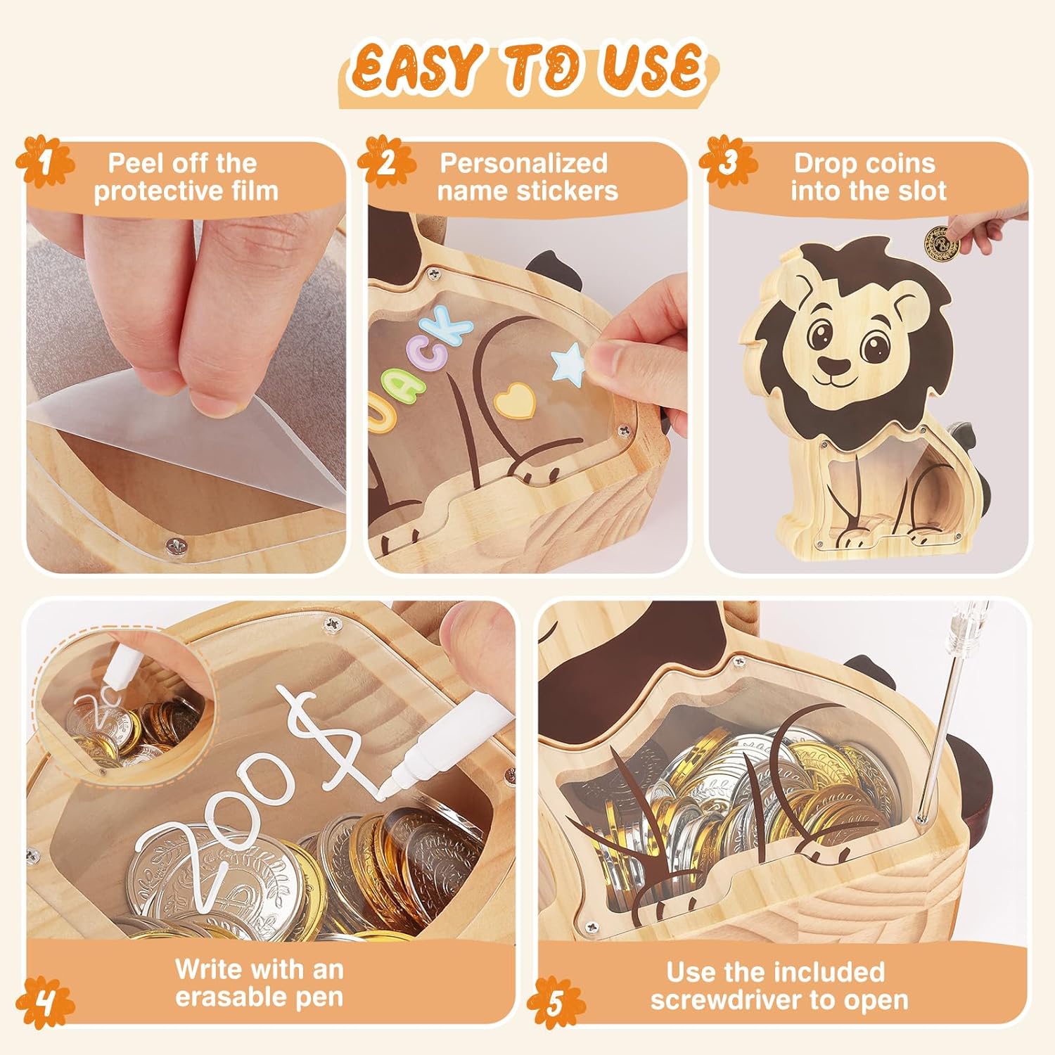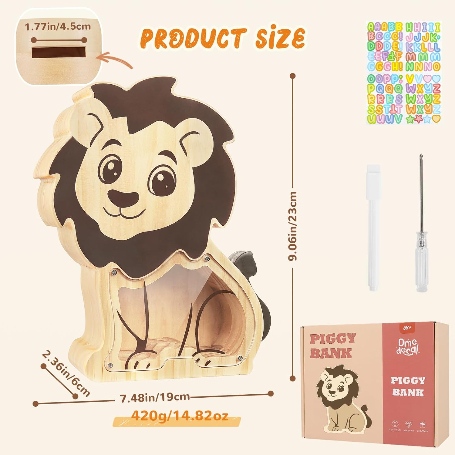 【Legno Massello con Bordi Arrotondati】- Realizzato in robusto legno di pino, questo salvadanaio presenta angoli arrotondati per bordi lisci, garantendo sicurezza e comfort. 【Design Originali】- I salvadanai in legno per bambini sono disponibili in adorabili forme di animali o veicoli da cantiere. Oltre a conservare le monete, fungono da ornamenti decorativi o regali premurosi. 【Finestra Trasparente】- Il pannello in acrilico trasparente permette ai bambini di vedere i propri risparmi all'interno, dando loro un senso di soddisfazione. 【Decorazione Fai da Te】- Include 1 foglio di adesivi con lettere colorate e una matita bianca, che consentono di scrivere nomi o messaggi incoraggianti sul salvadanaio. 【Suggerimento Utile】- Fissare il pannello in acrilico alla base in legno con piccole viti, basta svitarle per accedere alle monete. Compatibile con la maggior parte delle monete e delle banconote.