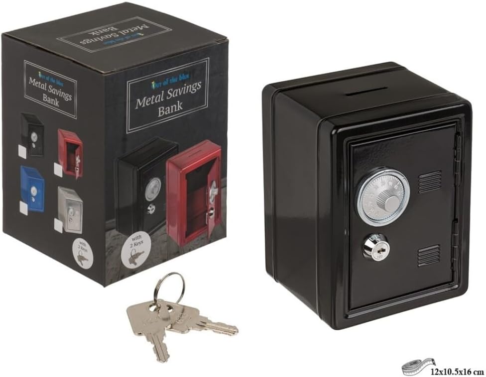 1. Risparmia in modo sicuro e divertente con questo salvadanaio nero ideale per i bambini. Realizzata in metallo resistente, misura 12 x 10,5 x 16 cm e offre doppia sicurezza con serratura a combinazione e chiave. Il regalo perfetto per incoraggiare il risparmio! ?. Salvadanaio a forma di scatola forte. Realizzato in metallo colore nero. Con serratura a combinazione e chiave. Confezionato in una scatola regalo colorata. Dimensioni (CM): 12 x 10,5 x 16 cm Presentato in un'elegante confezione regalo, pronto per essere regalato in qualsiasi occasione speciale. ? Design sicuro che amerete i più piccoli, trasformando il risparmio in un gioco. ? Doppio sistema di sicurezza: combinazione e chiave, per proteggere i soldi risparmiati. ? Perfetto per la casa, aiuta i bambini a sviluppare l'abitudine di risparmiare in modo divertente e sicuro.