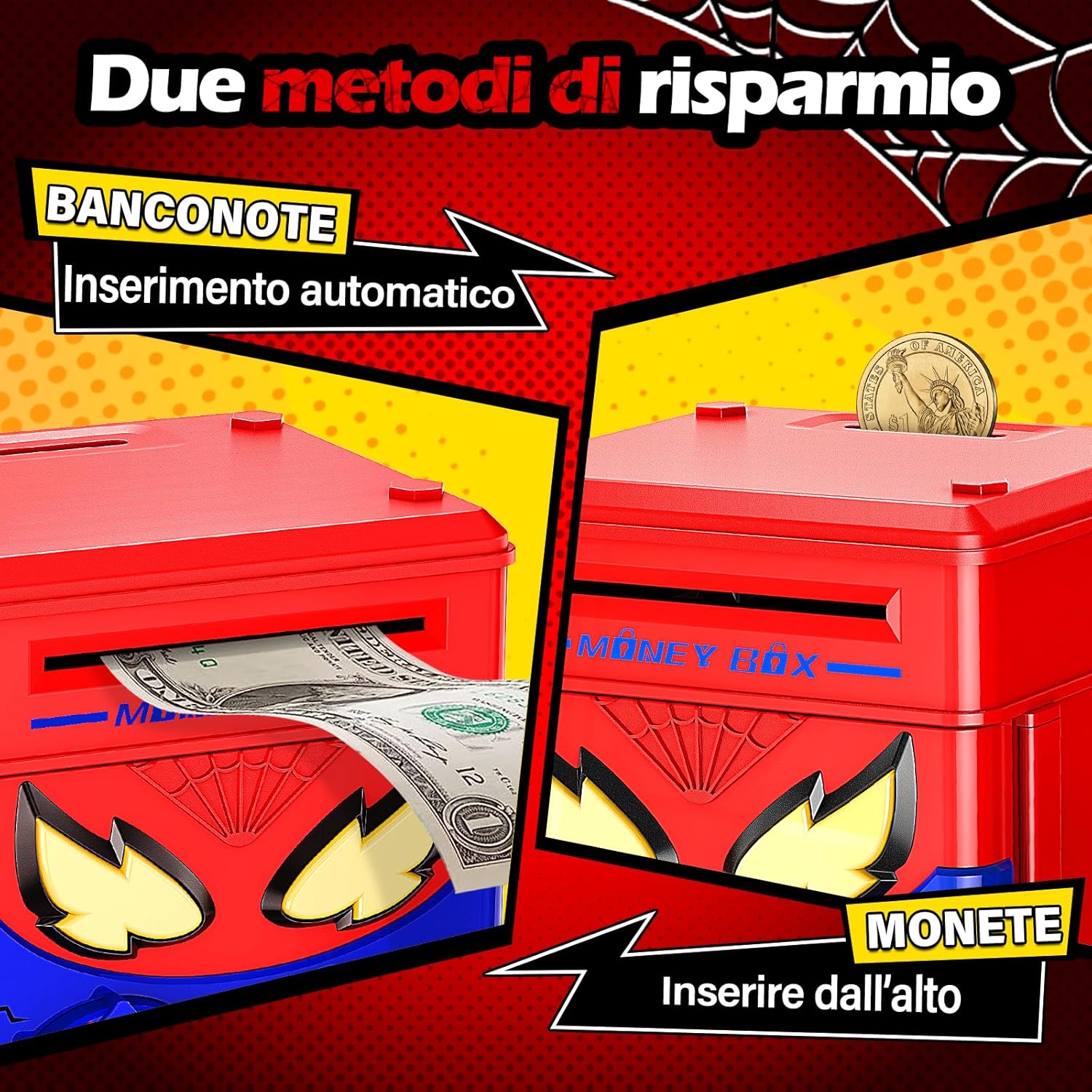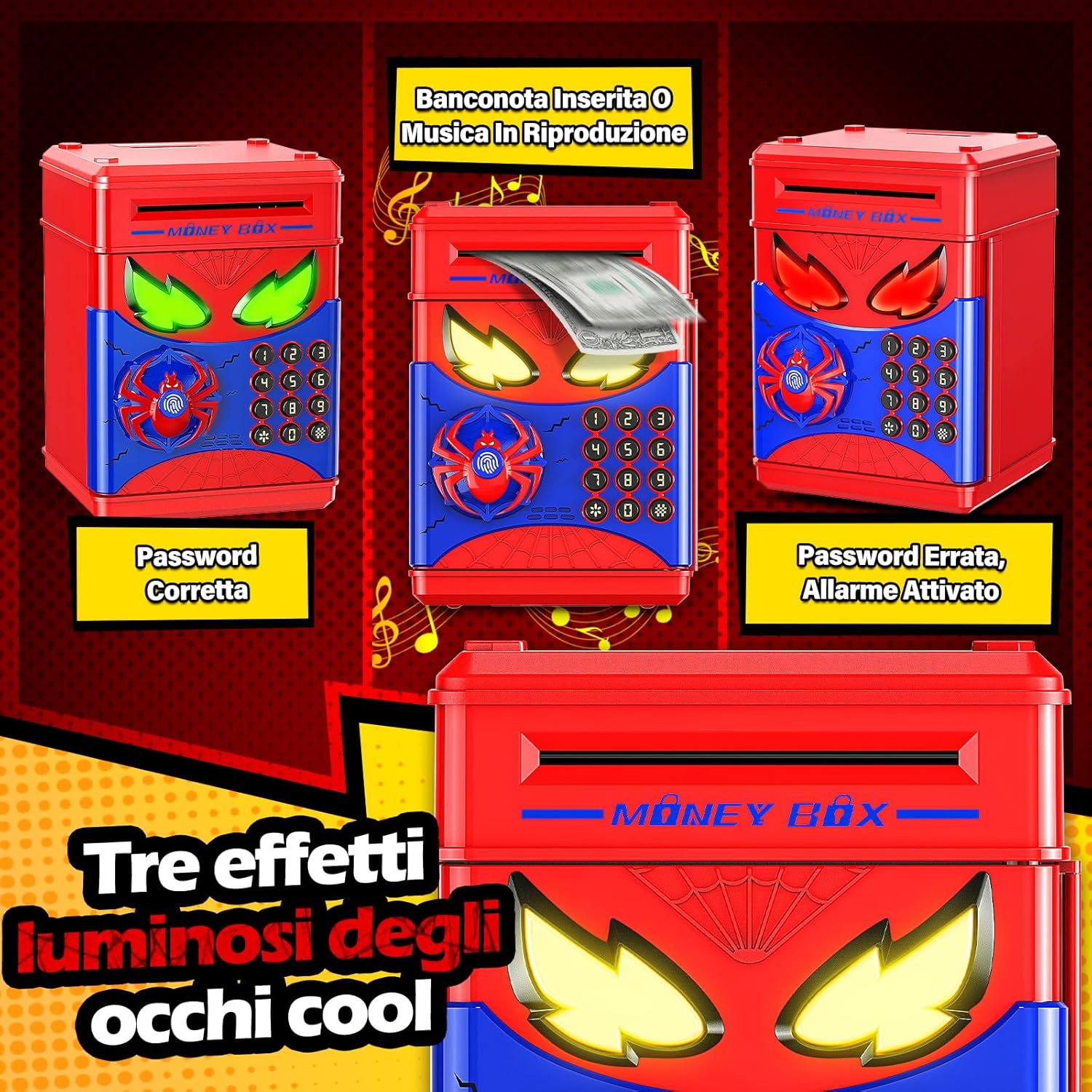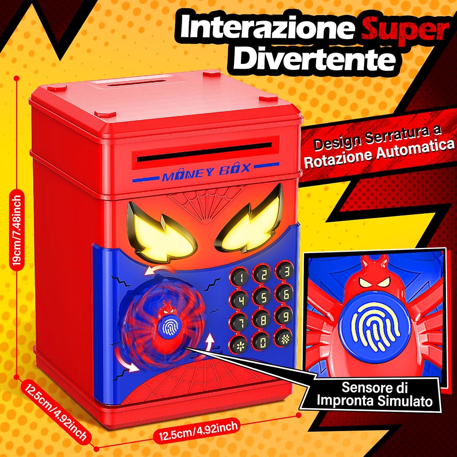 💖【Materiale di alta qualità】Il salvadanaio bambini è realizzato in plastica ABS ecologica, atossica e resistente agli urti, garantendo sicurezza durante il gioco quotidiano. Il materiale robusto sopporta cadute e colpi, permettendo ai bambini di esplorare e interagire liberamente. Nota: richiede 3 batterie AA (non incluse). ✨【Salvadanaio con password】Dotato di salvadanaio digitale con blocco a 4 cifre (default 0000, modificabile). Inserendo il codice corretto, si accende la luce verde e un messaggio vocale guida il bambino a premere il pulsante impronta digitale. Codice errato? Luce rossa e segnale vocale ricordano di riprovare, aiutando i bambini a sviluppare sicurezza e responsabilità. 💰【Ampio spazio di archiviazione】Il design a grande capacità consente di contenere circa 600 monete o 100 banconote, oltre a piccoli oggetti come gioielli, medaglie o biglie. Perfetto per aiutare i bambini a organizzare risparmi e piccoli tesori, sviluppando pianificazione e capacità di ordine. 🥇【Design interattivo a tema Spider】La forma tridimensionale a ragno si muove su un disco rotante, rendendo il salvadanaio elettronico divertente e coinvolgente. Con il codice corretto, gli “occhi dello Spider Hero” si illuminano di verde e un messaggio vocale guida il tocco del pulsante impronta digitale. Il ragno e il disco ruotano, sbloccando il salvadanaio, mentre le banconote vengono automaticamente arrotolate, aumentando l’interattività e il senso di realismo. 🎁【Regalo perfetto per bambini】Il tema Spider unico e le funzioni interattive rendono il risparmio divertente ed educativo. Ideale come regalo di compleanno, Natale o premio per bambini dai 3 ai 12 anni. Aiuta a sviluppare abitudini di risparmio, concentrazione e abilità manuali in modo ludico.