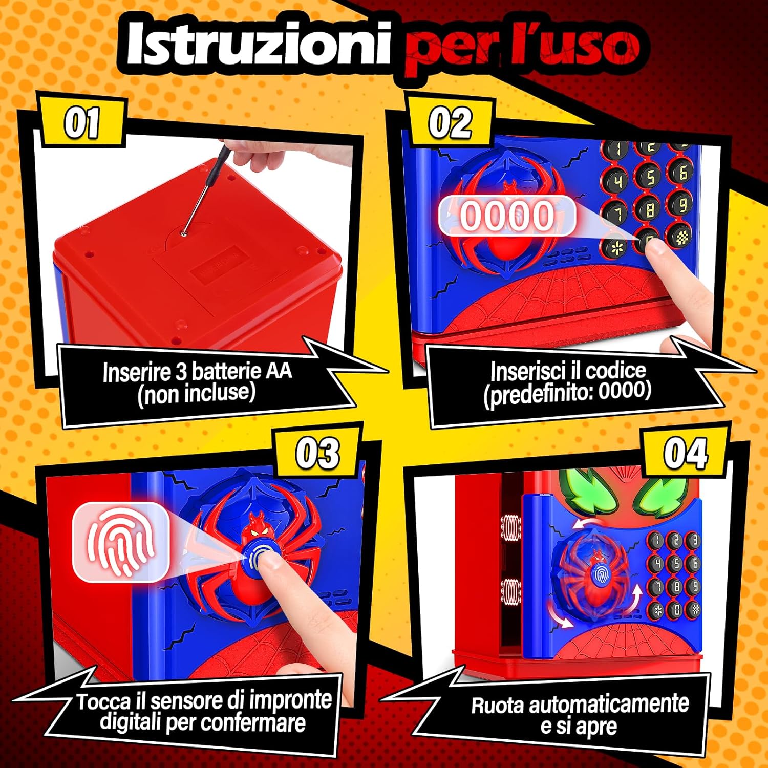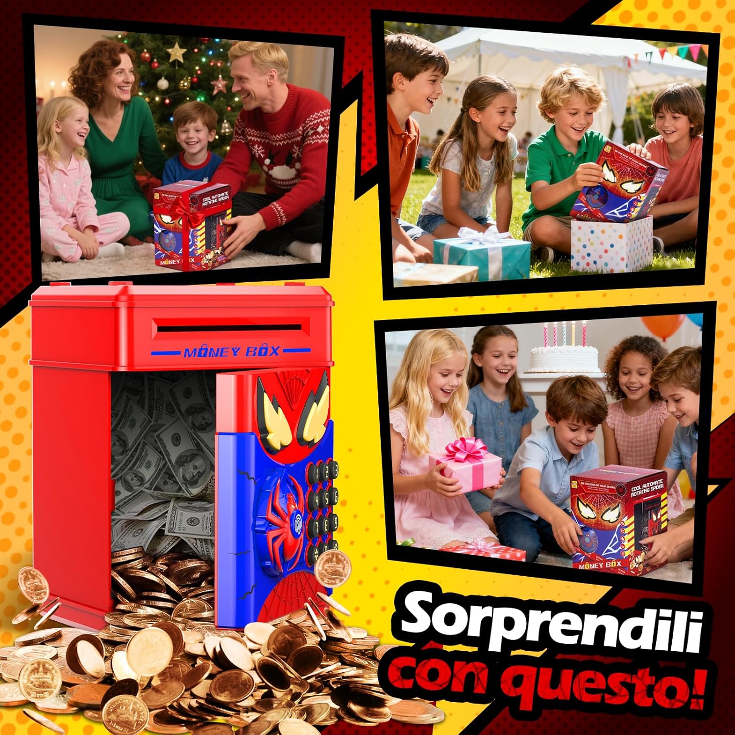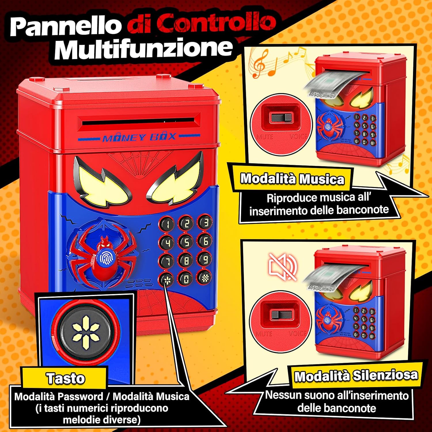 💖【Materiale di alta qualità】Il salvadanaio bambini è realizzato in plastica ABS ecologica, atossica e resistente agli urti, garantendo sicurezza durante il gioco quotidiano. Il materiale robusto sopporta cadute e colpi, permettendo ai bambini di esplorare e interagire liberamente. Nota: richiede 3 batterie AA (non incluse). ✨【Salvadanaio con password】Dotato di salvadanaio digitale con blocco a 4 cifre (default 0000, modificabile). Inserendo il codice corretto, si accende la luce verde e un messaggio vocale guida il bambino a premere il pulsante impronta digitale. Codice errato? Luce rossa e segnale vocale ricordano di riprovare, aiutando i bambini a sviluppare sicurezza e responsabilità. 💰【Ampio spazio di archiviazione】Il design a grande capacità consente di contenere circa 600 monete o 100 banconote, oltre a piccoli oggetti come gioielli, medaglie o biglie. Perfetto per aiutare i bambini a organizzare risparmi e piccoli tesori, sviluppando pianificazione e capacità di ordine. 🥇【Design interattivo a tema Spider】La forma tridimensionale a ragno si muove su un disco rotante, rendendo il salvadanaio elettronico divertente e coinvolgente. Con il codice corretto, gli “occhi dello Spider Hero” si illuminano di verde e un messaggio vocale guida il tocco del pulsante impronta digitale. Il ragno e il disco ruotano, sbloccando il salvadanaio, mentre le banconote vengono automaticamente arrotolate, aumentando l’interattività e il senso di realismo. 🎁【Regalo perfetto per bambini】Il tema Spider unico e le funzioni interattive rendono il risparmio divertente ed educativo. Ideale come regalo di compleanno, Natale o premio per bambini dai 3 ai 12 anni. Aiuta a sviluppare abitudini di risparmio, concentrazione e abilità manuali in modo ludico.