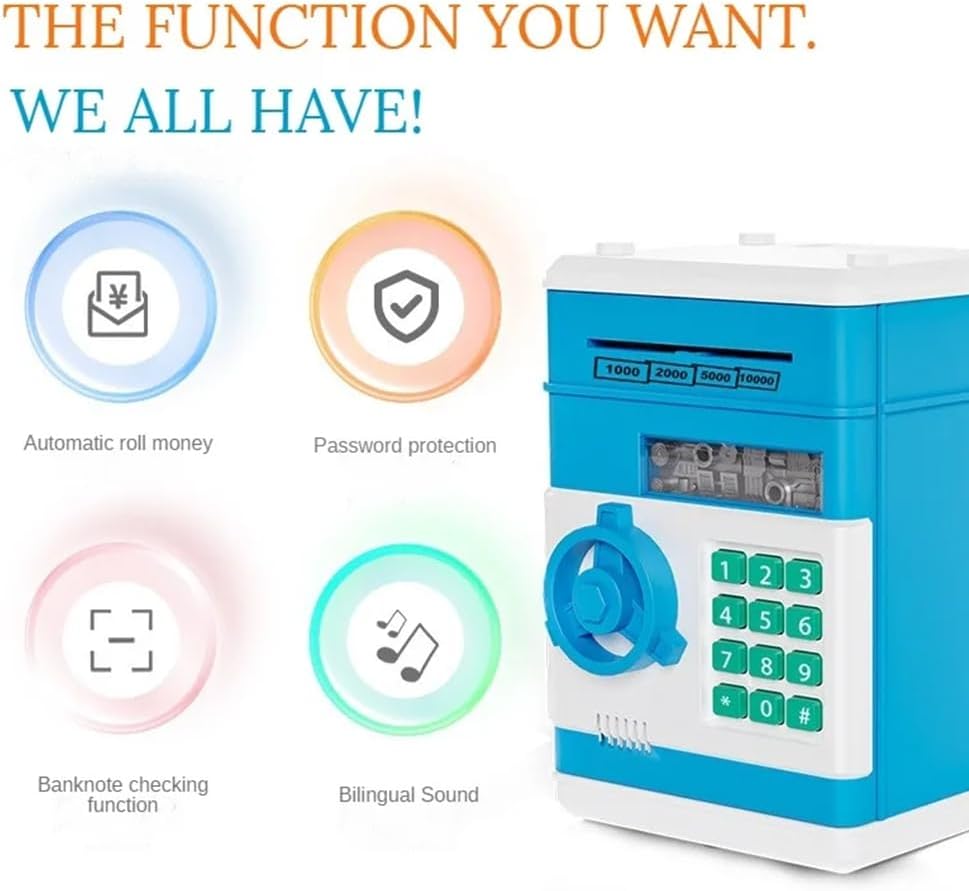 Il salvadanaio multiuso può depositare denaro e monete. Non solo un salvadanaio, ma una cassaforte con password. I salvadanai esistono da così tanto tempo: non c'è modo più divertente per risparmiare denaro! [Il giocattolo per bambini] Questo è un salvadanaio elettronico premium per risparmiare denaro e monete. È scelta migliore per i regali compleanno e per feste dei bambini, come Natale e Capodanno. Offre un modo positivo per i bambini imparare virtù risparmio denaro e sviluppare buone abitudini gestione finanziaria. I bambini possono risparmiare resto per i loro piani, come l'acquisto regali per i loro genitori, amici e familiari. Davvero un eccellente assistente finanziario per bambini! [Mini ATM] la carta è rivolta all'ingresso del denaro, può assorbire automaticamente denaro come un mini ATM. Un salvadanaio per bambini è parte del giocattolo, parte 'ATM, parte della decorazione della stanza del bambino! Questo è un modo divertente per insegnare ai tuoi bambini l'importanza del risparmio e della responsabilità finanziaria. [Protezione tramite password] protezioni tramite password elettroniche, se si preme la password sbagliata, verrà emessa. Basta rimuovere la batteria per più di 30 minuti e la password verrà reimpostata. Questa cassa di risparmio ATM è la migliore banca didattica per bambini! [Sicurezza e servizio] Il salvadanaio è realizzato con materiali ecocompatibili e simula la di sicurezza. (Nota: il salvadanaio richiede 3 batterie AA, ma non sono incluse)