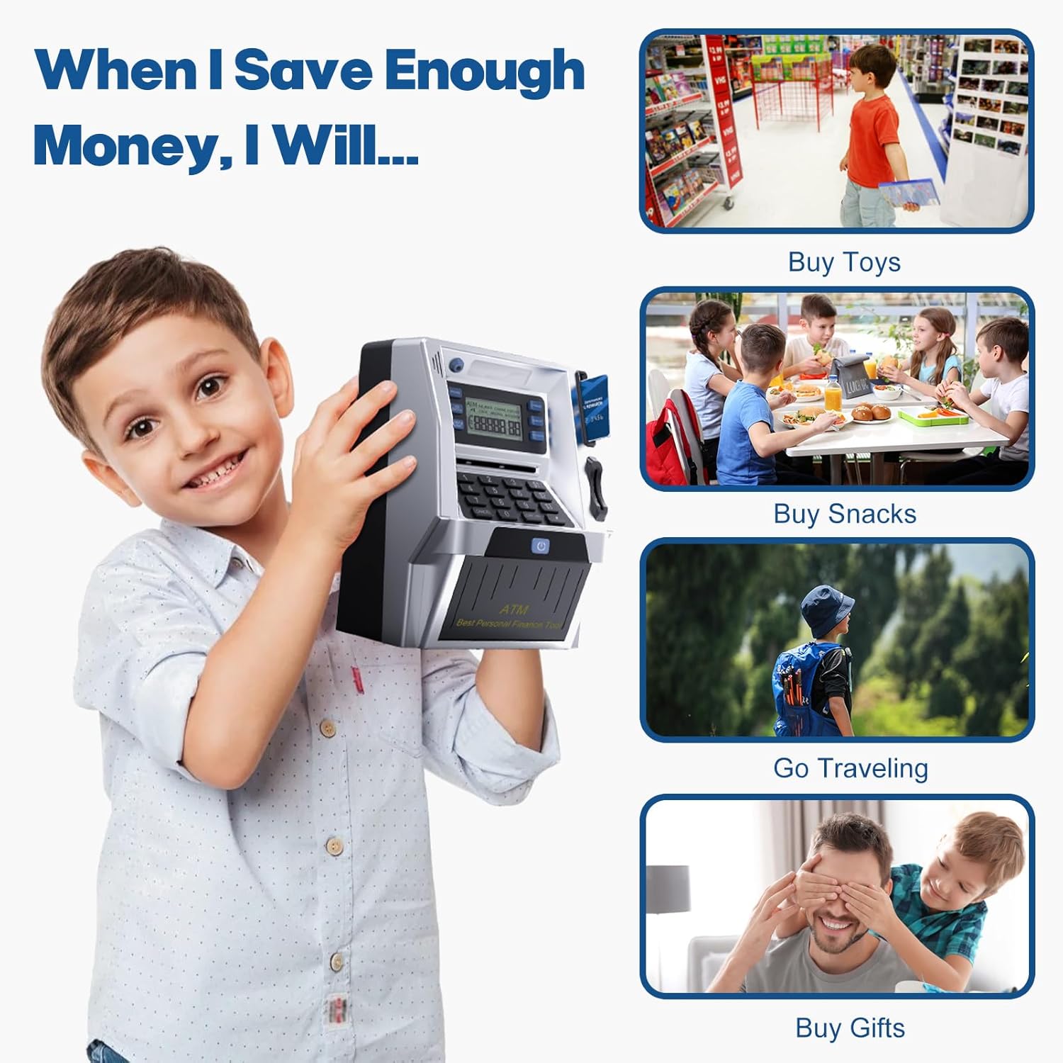 💴🎁 【Funzione di archiviazione di spegnimento migliorata, sicura e senza preoccupazioni】 Il salvadanaio ATM ha una funzione di archiviazione di spegnimento integrata, che può facilmente salvare codici e bilanciare i dati anche quando la batteria è scarica o deve essere sostituita. I tuoi dati di risparmio non andranno mai persi. Allo stesso tempo, premendo a lungo il pulsante SALDO in modalità Ora puoi spegnere rapidamente il telefono per proteggere in sicurezza le tue informazioni finanziarie. 💴🎁【Carta di debito + Accesso PIN a 4 cifre, facile da usare】Il salvadanaio ATM ha un alto grado di simulazione e fornisce protezione per carta di debito e PIN a 4 cifre, rendendo i tuoi risparmi più sicuri. Lo schermo LCD mostra i tuoi depositi e le modifiche del saldo in tempo reale e fornisce feedback tramite comandi vocali ad ogni passaggio. L'esperienza non è diversa da quella di un vero bancomat. 💴🎁Rileva automaticamente le monete, monitora il saldo in modo intelligente: la fessura per le monete può rilevare automaticamente il valore nominale delle monete e l'importo di ciascuna moneta viene accuratamente incluso nel saldo del conto. Anche se si tratta solo di un piccolo cambiamento, puoi gestire saggiamente i tuoi risparmi. Questo è un regalo divertente ed educativo per i bambini che li aiuterà a conoscere la gestione del denaro. 💴🎁【Avvolgimento automatico delle banconote, semplice ed efficiente】Dopo aver premuto il pulsante NOTA, inserisci la banconota nel rotolo e si arrotolerà automaticamente nella macchina, molto adatta ai bambini. Depositi e prelievi sono controllati tramite una semplice tastiera, facilitando la regolazione dei saldi dei conti e migliorando notevolmente l'esperienza dell'utente. 💴🎁【Obiettivi di risparmio personalizzabili, promozione della consapevolezza della pianificazione finanziaria】Il salvadanaio ATM supporta l'impostazione di obiettivi di risparmio fino a 9999,99, consentendo ai bambini di capire come pianificare e monitorare i progressi dei propri risparmi. Non è solo un giocattolo interessante, ma anche uno strumento educativo e divertente che sviluppa le capacità di gestione finanziaria dei bambini e rafforza il loro senso di autodisciplina.