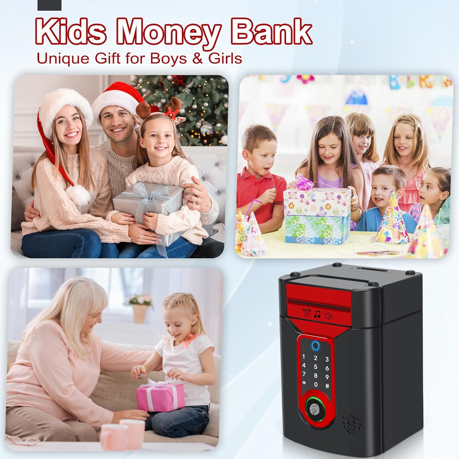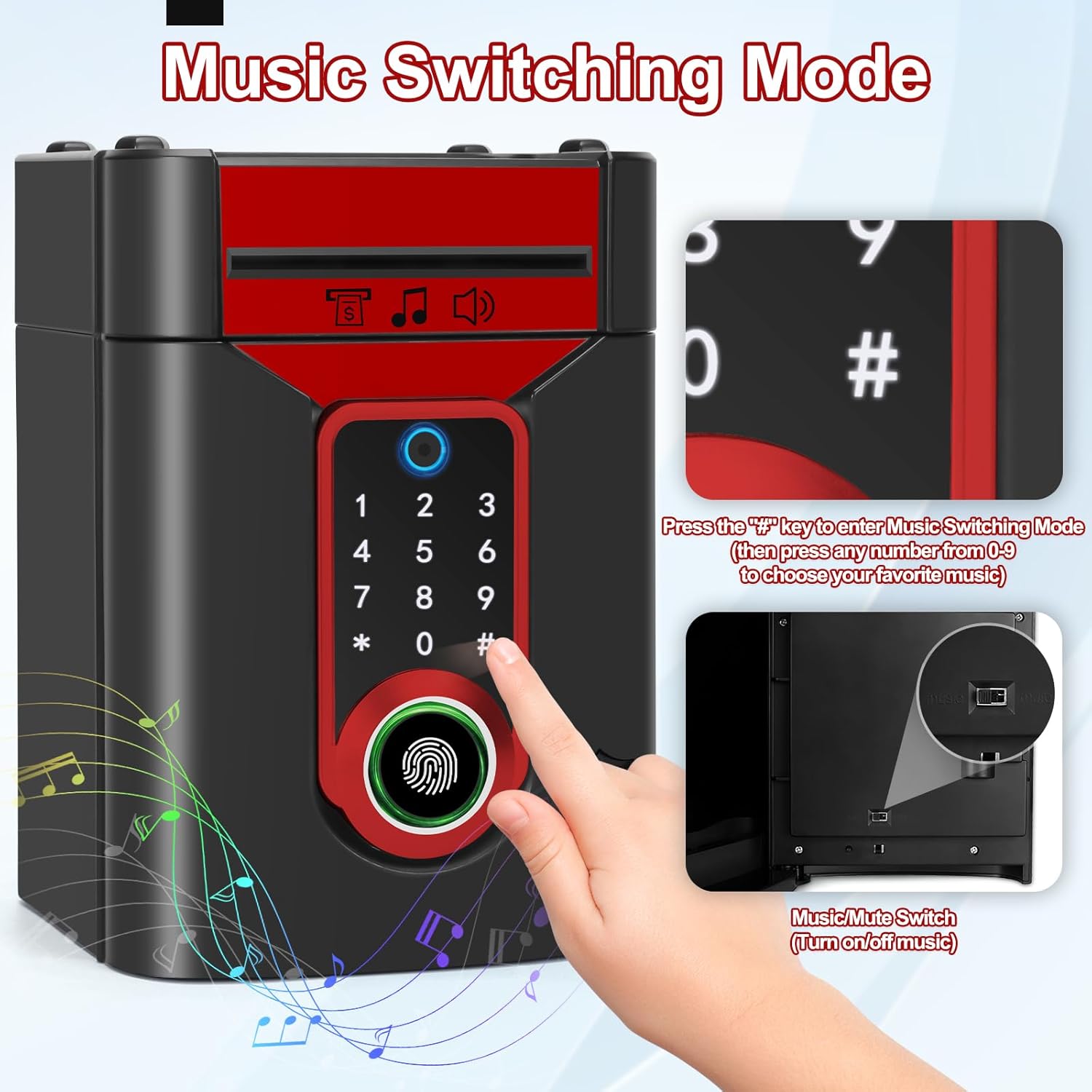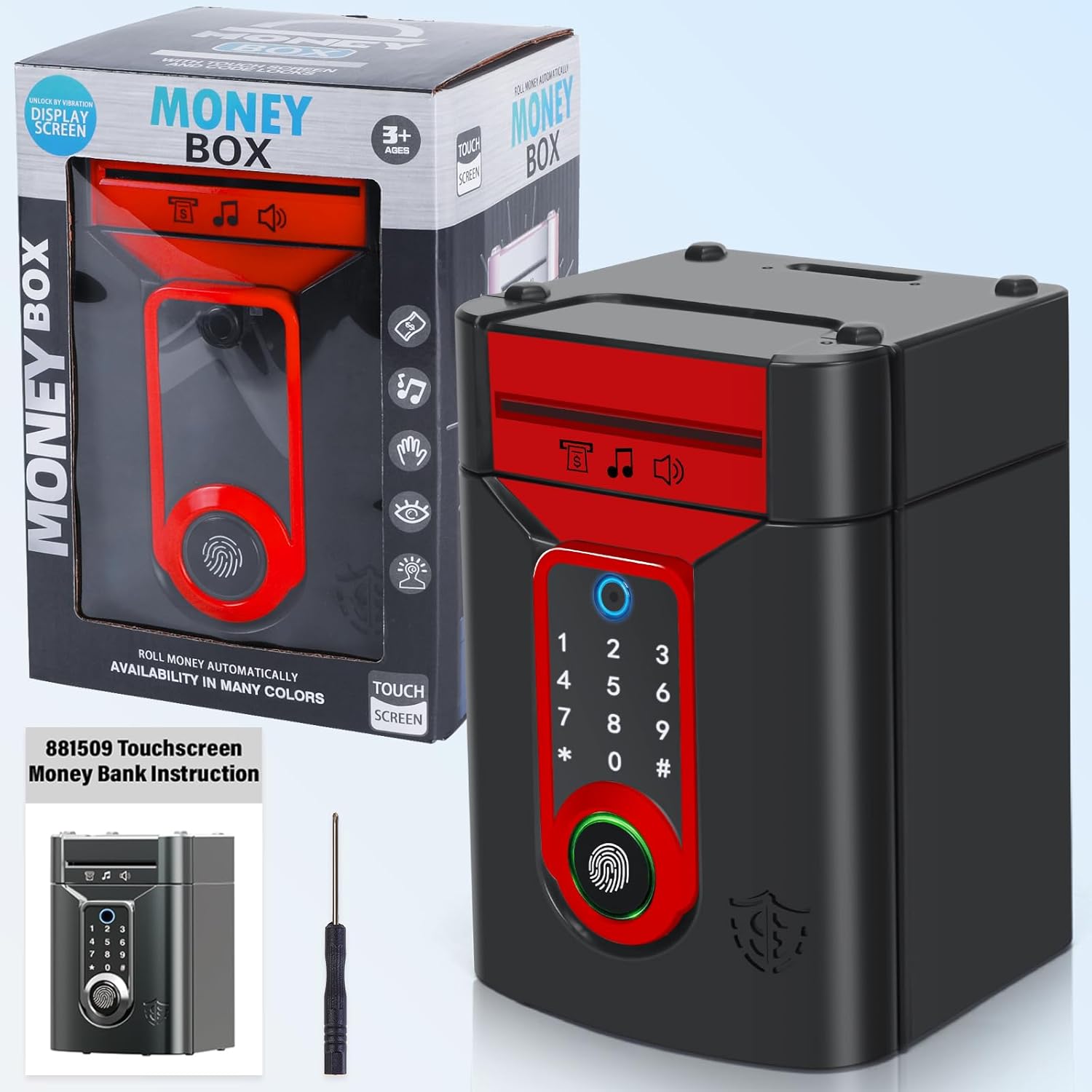 【Materiali di alta qualità】Plastica ABS resistente, inodore, robusta e che non si rompe facilmente, un'interessante cassaforte appositamente studiata per i bambini. 【Salvadanaio password a schermo tattile e blocco delle impronte digitali】Grazie all'innovativo design con touchscreen e sblocco tramite impronta digitale, è sufficiente inserire un codice a 4 cifre e confermarlo con l'impronta digitale; la luce verde si accenderà e la porta si aprirà automaticamente(default: “0000” password modificabile a piacere). 【Alimentatore automatico di note e modalità Musica】Quando si depositano le banconote, le monete vengono inserite automaticamente nel salvadanaio del bancomat. Inoltre, ha la funzione di commutazione musicale per un maggiore divertimento: premere il tasto “#” per passare alla modalità musicale, quindi premere qualsiasi numero da 0 a 9 per scegliere la filastrocca musicale preferita. 【Elevata capacità di stoccaggio】Il salvadanaio ATM per bambini può contenere 600 monete o 100 pezzi di carta moneta. Per far sì che i bambini pianifichino la conservazione della paghetta, aiutandoli a sviluppare una buona abitudine al risparmio. 【Un regalo perfetto】I bambini adoreranno ricevere questo simpatico schermo tattile salvadanaio. Divertente ed educativo, insegna l'importanza del risparmio. È ideale come regalo di compleanno, regalo di Natale, premio per un buon comportamento o altro.