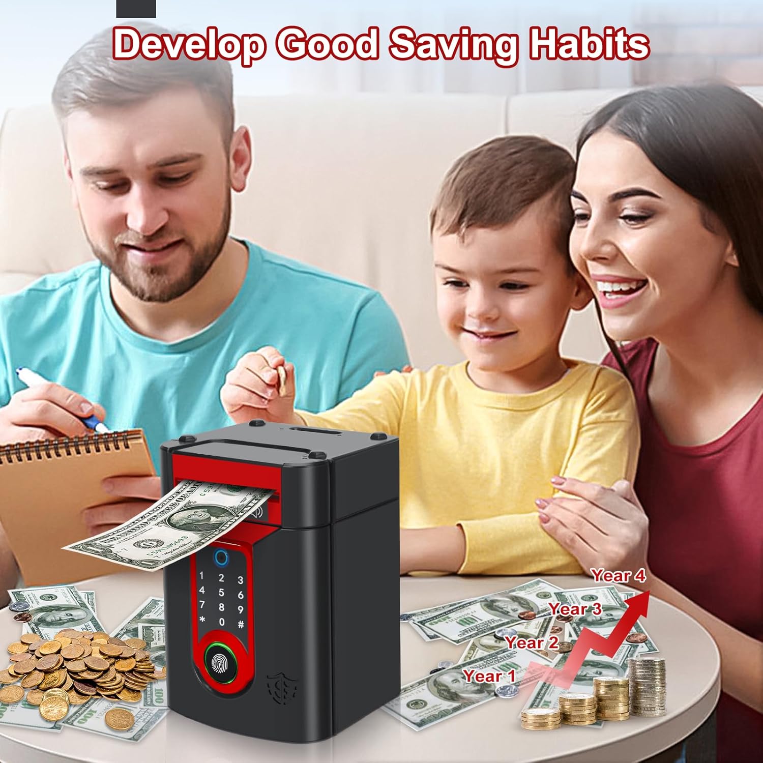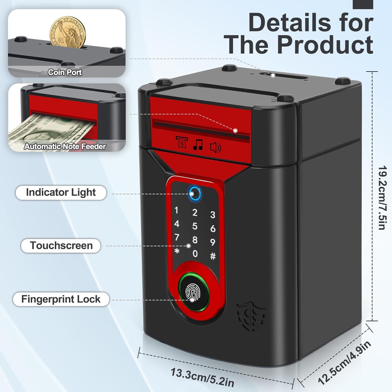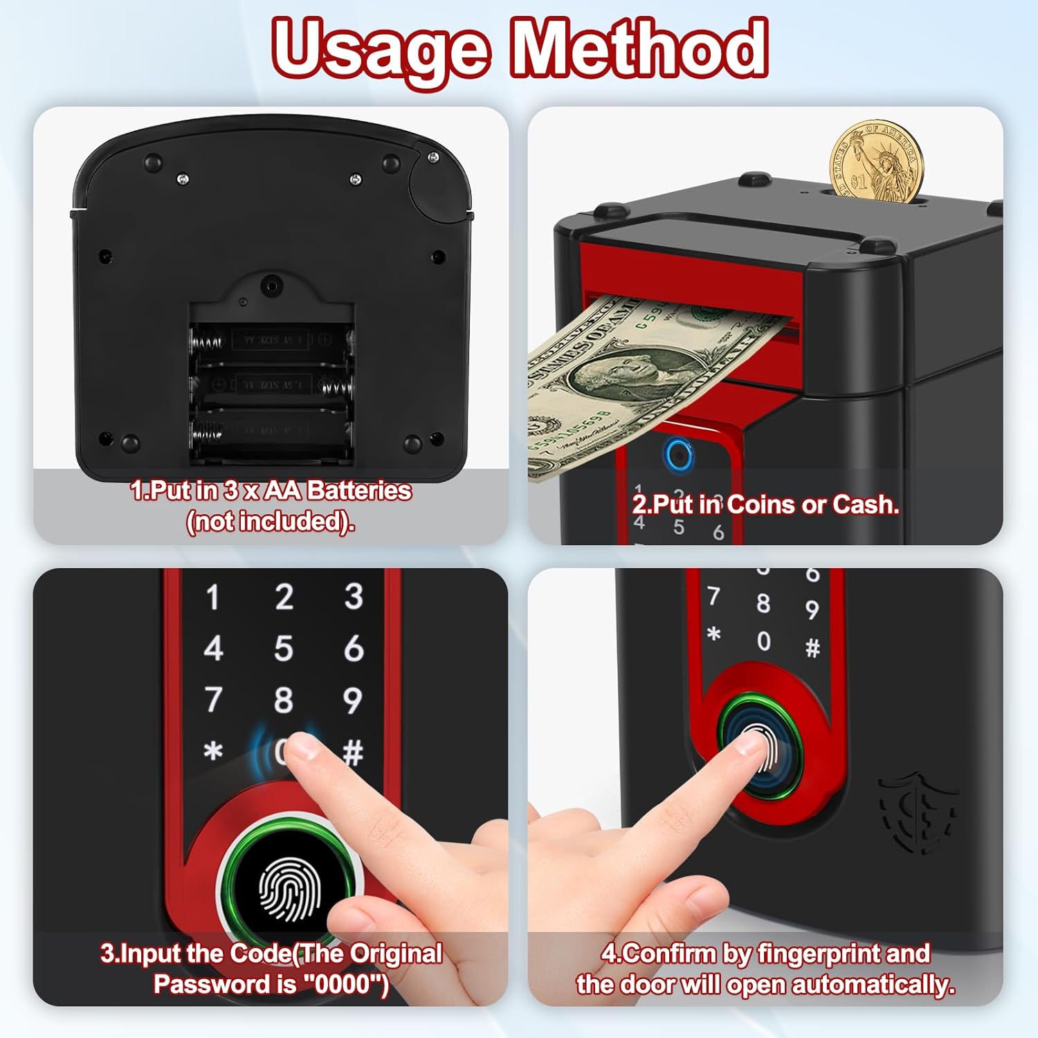 【Materiali di alta qualità】Plastica ABS resistente, inodore, robusta e che non si rompe facilmente, un'interessante cassaforte appositamente studiata per i bambini. 【Salvadanaio password a schermo tattile e blocco delle impronte digitali】Grazie all'innovativo design con touchscreen e sblocco tramite impronta digitale, è sufficiente inserire un codice a 4 cifre e confermarlo con l'impronta digitale; la luce verde si accenderà e la porta si aprirà automaticamente(default: “0000” password modificabile a piacere). 【Alimentatore automatico di note e modalità Musica】Quando si depositano le banconote, le monete vengono inserite automaticamente nel salvadanaio del bancomat. Inoltre, ha la funzione di commutazione musicale per un maggiore divertimento: premere il tasto “#” per passare alla modalità musicale, quindi premere qualsiasi numero da 0 a 9 per scegliere la filastrocca musicale preferita. 【Elevata capacità di stoccaggio】Il salvadanaio ATM per bambini può contenere 600 monete o 100 pezzi di carta moneta. Per far sì che i bambini pianifichino la conservazione della paghetta, aiutandoli a sviluppare una buona abitudine al risparmio. 【Un regalo perfetto】I bambini adoreranno ricevere questo simpatico schermo tattile salvadanaio. Divertente ed educativo, insegna l'importanza del risparmio. È ideale come regalo di compleanno, regalo di Natale, premio per un buon comportamento o altro.