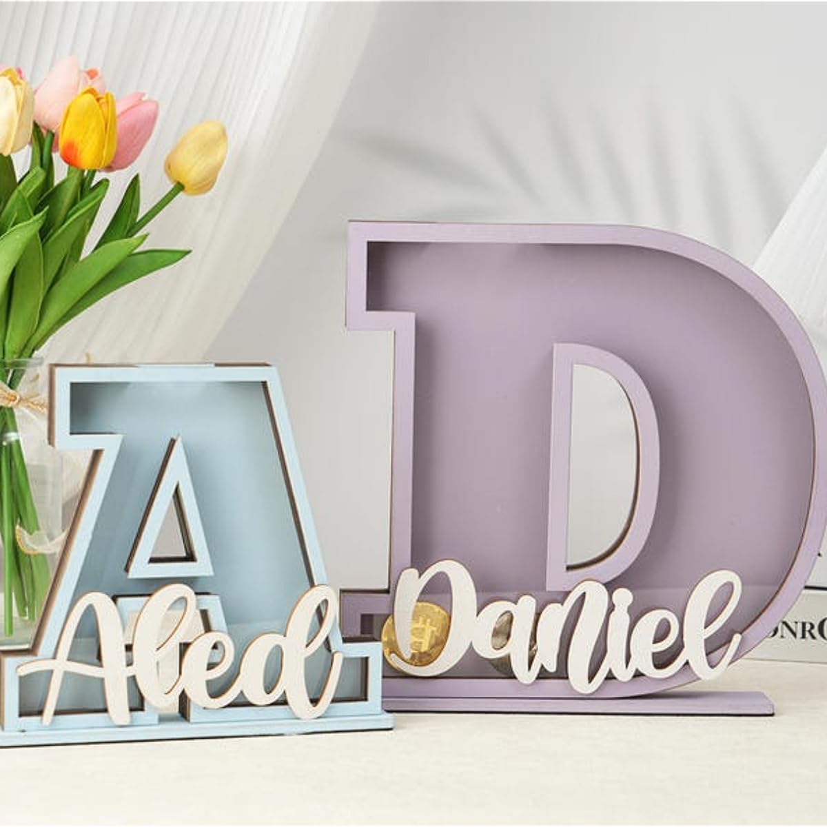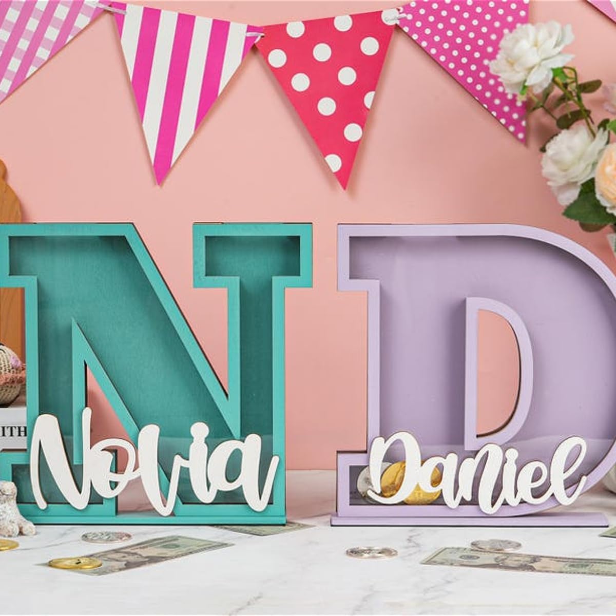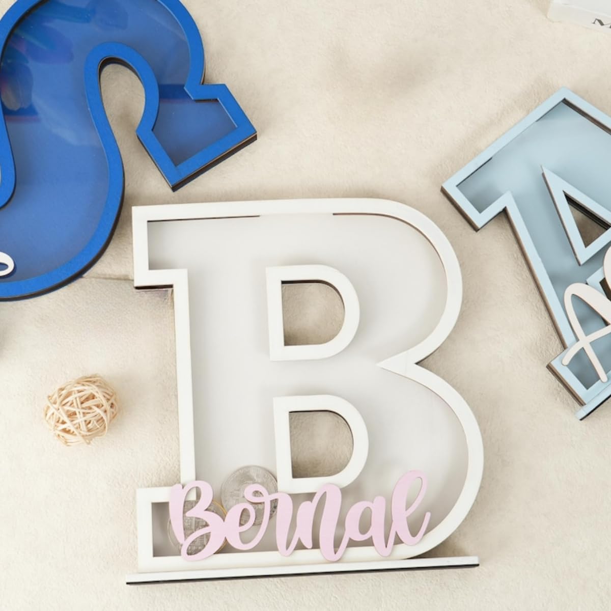 Salvadanaio in legno personalizzato: il nostro salvadanaio in legno personalizzato è la perfetta combinazione di design giocoso e risparmio pratico. A forma di lettera dell'alfabeto 3D audace, questo salvadanaio presenta un nome personalizzato sulla parte anteriore, rendendolo un'aggiunta affascinante a qualsiasi asilo nido, camera da letto o stanza dei giochi. Per neonati/bambini/ragazzi/adolescenti, diventa un prezioso ricordo, un regalo unico dai propri cari. Che si tratti di una camera da letto, uno studio o una stanza dei bambini, il salvadanaio a forma di lettera può diventare un paesaggio unico. Ogni salvadanaio iniziale può essere inciso con il nome del bambino. Puoi personalizzarlo con iniziali A-Z, nome o colore preferito. Il salvadanaio è perfetto per le mani piccole, con uno slot per monete e banconote sulla parte superiore e un guscio in acrilico trasparente nella parte anteriore. Il salvadanaio trasparente è ottimo per aiutare a tenere traccia dei loro risparmi, ed è così divertente. Salvadanaio in legno personalizzato con nome personalizzato per i bambini per risparmiare monete. Il design unico a forma di lettera è un regalo perfetto per compleanni e vacanze. Regalo perfetto per occasioni speciali: che si tratti di un compleanno, baby shower, Natale o qualsiasi altra occasione speciale, questo salvadanaio con alfabeto personalizzato è un regalo premuroso e significativo che combina divertimento e istruzione. È un ricordo che può essere apprezzato per gli anni a venire.