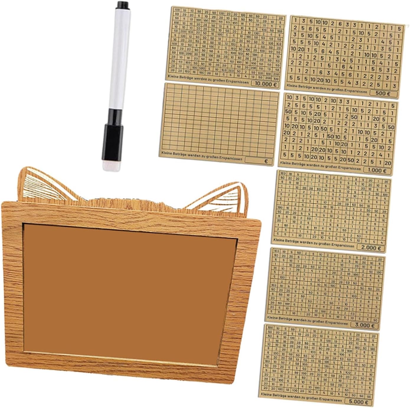 Materiale di alta qualità: il salvadanaio con bancone è realizzato in materiale di legno, squisita fattura, retrò ed elegante, molto adatto per ornamenti decorativi per la casa. Contenuto della confezione: 1 salvadanaio in legno, 8 fogli sostituibili per obiettivi di risparmio, 1 pennarello. [Regalo pratico]: il salvadanaio è un ottimo regalo per il Ringraziamento, compleanno, anniversario per famiglia, bambini, fidanzate, adulti. Aiuto al risparmio: i soldi in legno ti aiutano a sviluppare l'abitudine di risparmiare denaro regolarmente risparmiando denaro, rendendo facile risparmiare denaro. Molto adatto per adulti e bambini. [Pratico] : Con 8 carte sostituibili, è possibile contrassegnare i numeri sul bancone dopo ogni deposito per vedere quando il piano di deposito può essere completato.