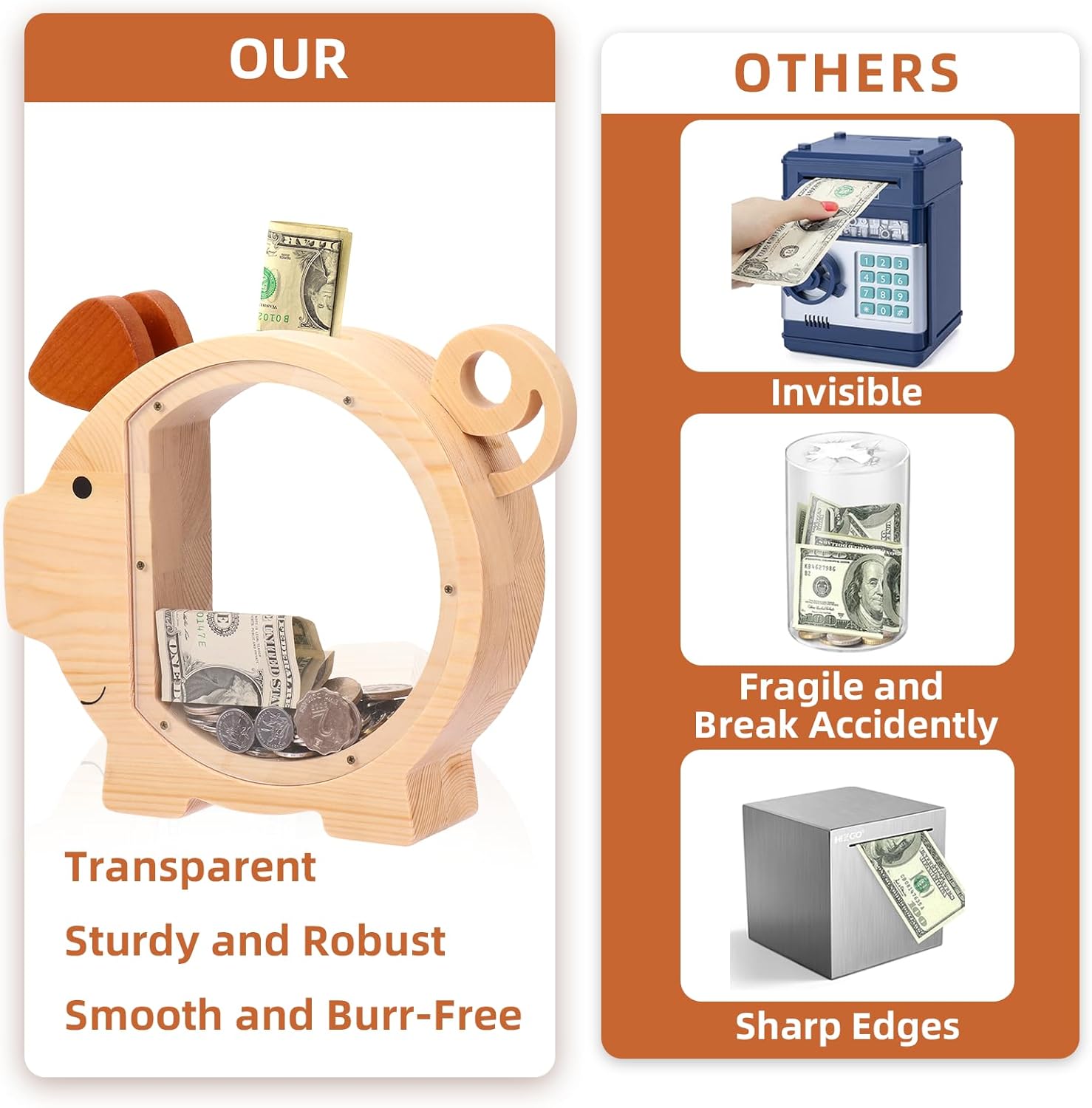 Facile da smontare: basta svitare le viti per prelevare risparmi, progettato per un facile accesso senza cacciavite incluso. Acrilico migliorato: realizzato con legno naturale spesso 6 cm e acrilico resistente, garantendo un salvadanaio robusto e robusto. 【Grandi dimensioni】: misura 25 x 22 x 6 cm, adatto per bambini di età superiore ai 3 anni per conservare monete e banconote. Finestra trasparente: offre una visione chiara per monitorare i progressi del risparmio, migliorando la gioia di risparmiare denaro per i bambini. 【Sicurezza certificata】: certificazione CPC superata con bordi lisci e senza sbavature, garantendo la sicurezza per i bambini di età superiore ai 3 anni.