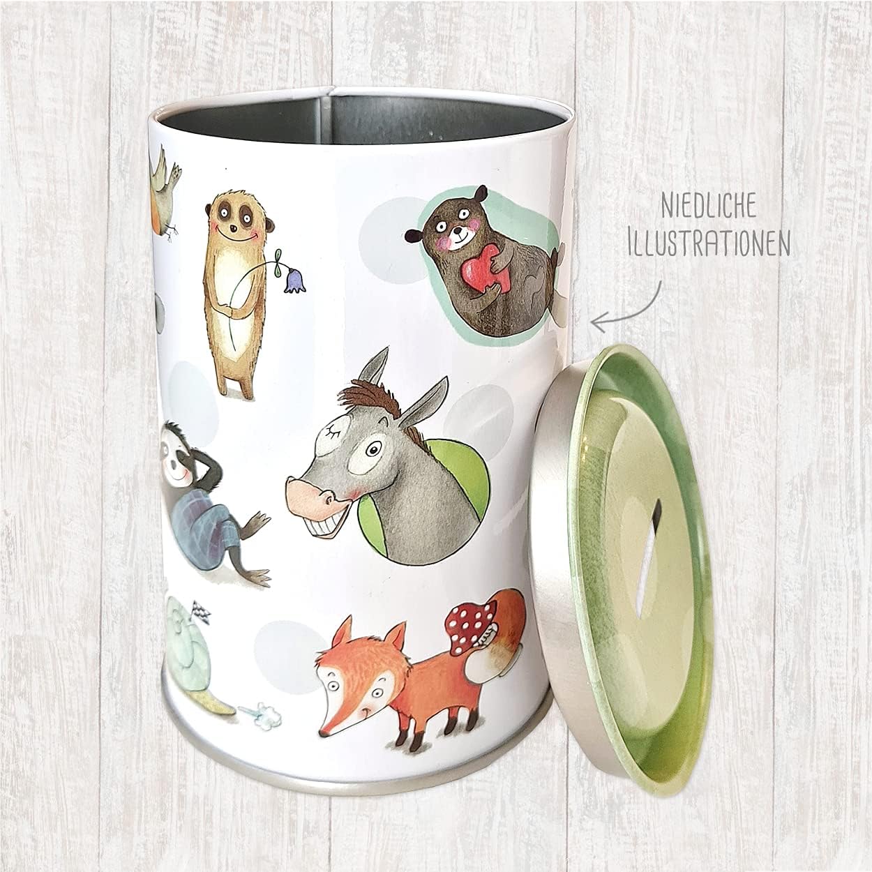 RISPARMIARE: Risparmiare è divertente! I salvadanai o i salvadanai sono un buon modo per mettere da parte i contanti per piccoli e grandi desideri. E come tutti sappiamo, non puoi iniziare abbastanza presto. COME DECORAZIONE: Il simpatico design di asini, volpi, ecc. si adatta meravigliosamente alle moderne camerette dei bambini. Con i simpatici motivi degli animali i ragazzi e le ragazze imparano già da piccoli a maneggiare il denaro. DESIGN ALLA MODA: Il design carino e unico di questo salvadanaio di latta è stato progettato con amore e a misura di bambino dalla famosa illustratrice Katja Jäger. PER REGALO: questo salvadanaio è un'ottima idea regalo e un fantastico regalo o souvenir, ad esempio. B. all'inizio della scuola così come per la comunione o la cresima. Fantastico anche come confezione regalo. DETTAGLI: Salvadanaio per bambini, 8,3 x 12,5 x 8,3 cm, in lamiera stagnata. Motivo di animali cattivi. Dalla tradizionale casa editrice Grätz. Qualità dalla Germania.