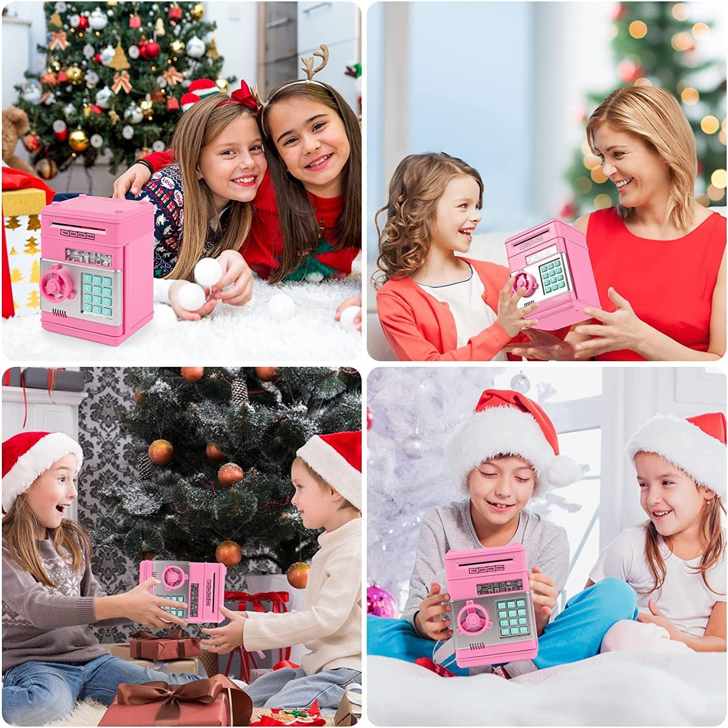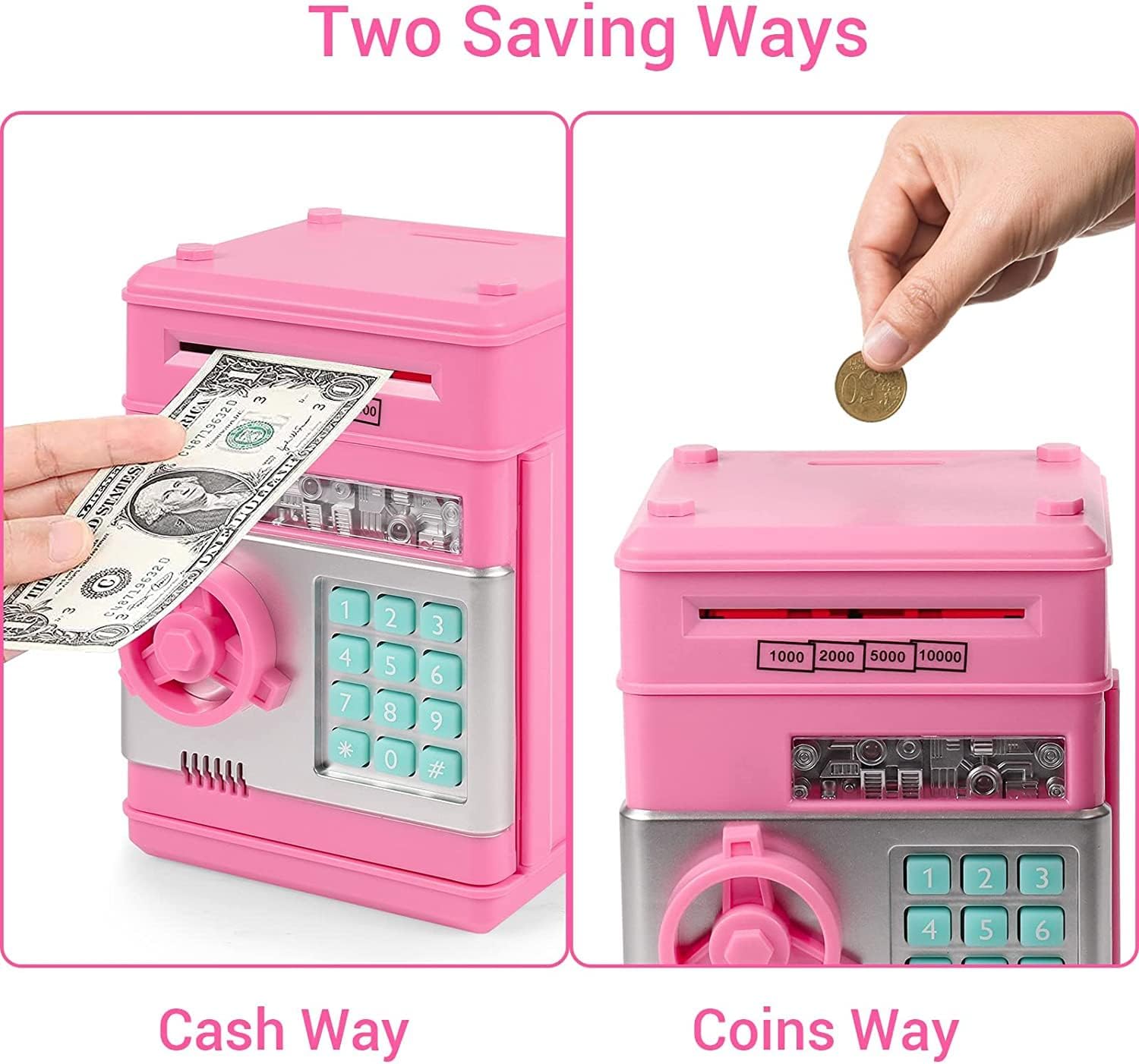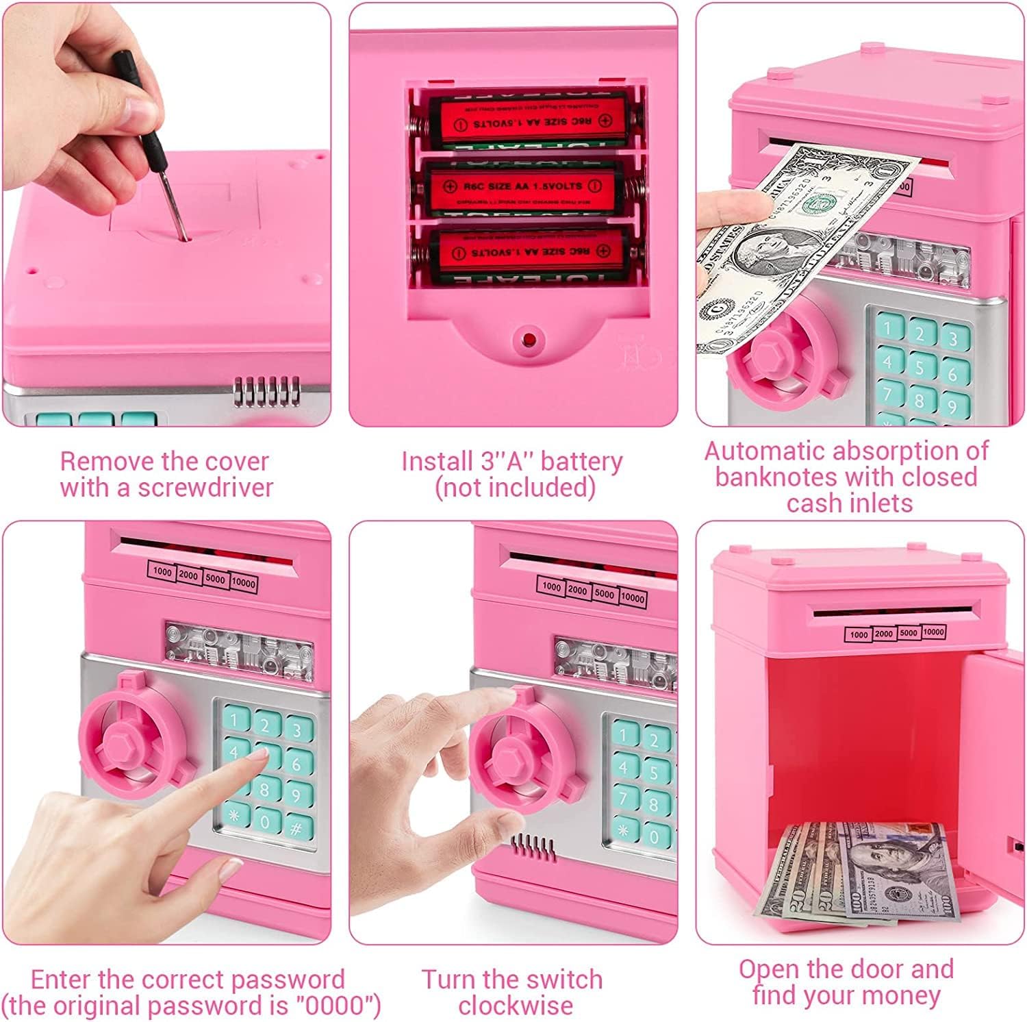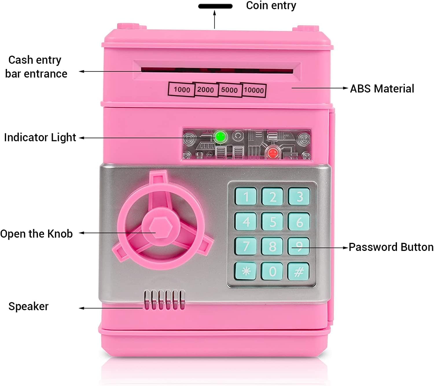 [MATERIALE SICURO E RESISTENTE] Il salvadanaio è realizzato in plastica ABS ecologica di alta qualità, anti-invecchiamento e durevole. La banca di monete elettronica è il miglior regalo di compleanno per ragazzi e ragazze. Questa panca aiuterà i tuoi bambini a imparare a proteggere i loro effetti personali. (Nota: le banconote troppo vecchie e troppo morbide potrebbero non attivare l'interruttore di contatto.) [Laminazione automatica della valuta e deposito delle monete] Inserisci le banconote nella fessura sulla parte superiore della banca bancomat dei bambini. Può entrare automaticamente nel bancomat. Questo cassetto portadenaro combinato può contenere monete e documenti. Inserisci la moneta dalla fessura per monete sulla parte superiore della banca e quando depositi la banconota, il denaro verrà risucchiato invece di spingerlo direttamente in [Impostazioni protezione password] Questo salvadanaio può essere aperto solo inserendo una password di 4 cifre. Se inserisci la password sbagliata, sentirai un segnale acustico. Blocco password a 4 cifre, può essere modificato in qualsiasi momento, la password predefinita di fabbrica è 0000. La luce verde è accesa, gira la manopola in senso orario per aprire la porta, se dimentichi la password, puoi rimuovere la batteria e ripristinare le impostazioni di fabbrica [Elevata capacità di archiviazione] Questo grande salvadanaio ti offre spazio sufficiente per raccogliere e risparmiare denaro. Proteggi gli effetti personali di tuo figlio. Memorizza 600 monete o 100 banconote. Batterie: 3 batterie AA (non incluse). Gli sportelli bancomat per bambini possono depositare monete, banconote o altri oggetti importanti e aiutare tuo figlio a sviluppare una buona abitudine al risparmio. [Il miglior regalo per i bambini] Questo salvadanaio può essere un regalo meraviglioso per i tuoi bambini. Puoi usarlo per aiutarli a sviluppare una buona abitudine di risparmiare denaro. È divertente, educativo e insegna l'importanza del risparmio ed è un ottimo regalo per compleanni, Natale, Halloween, Ringraziamento, Capodanno, premi, vincitori, riconoscimenti o altri regali di festa