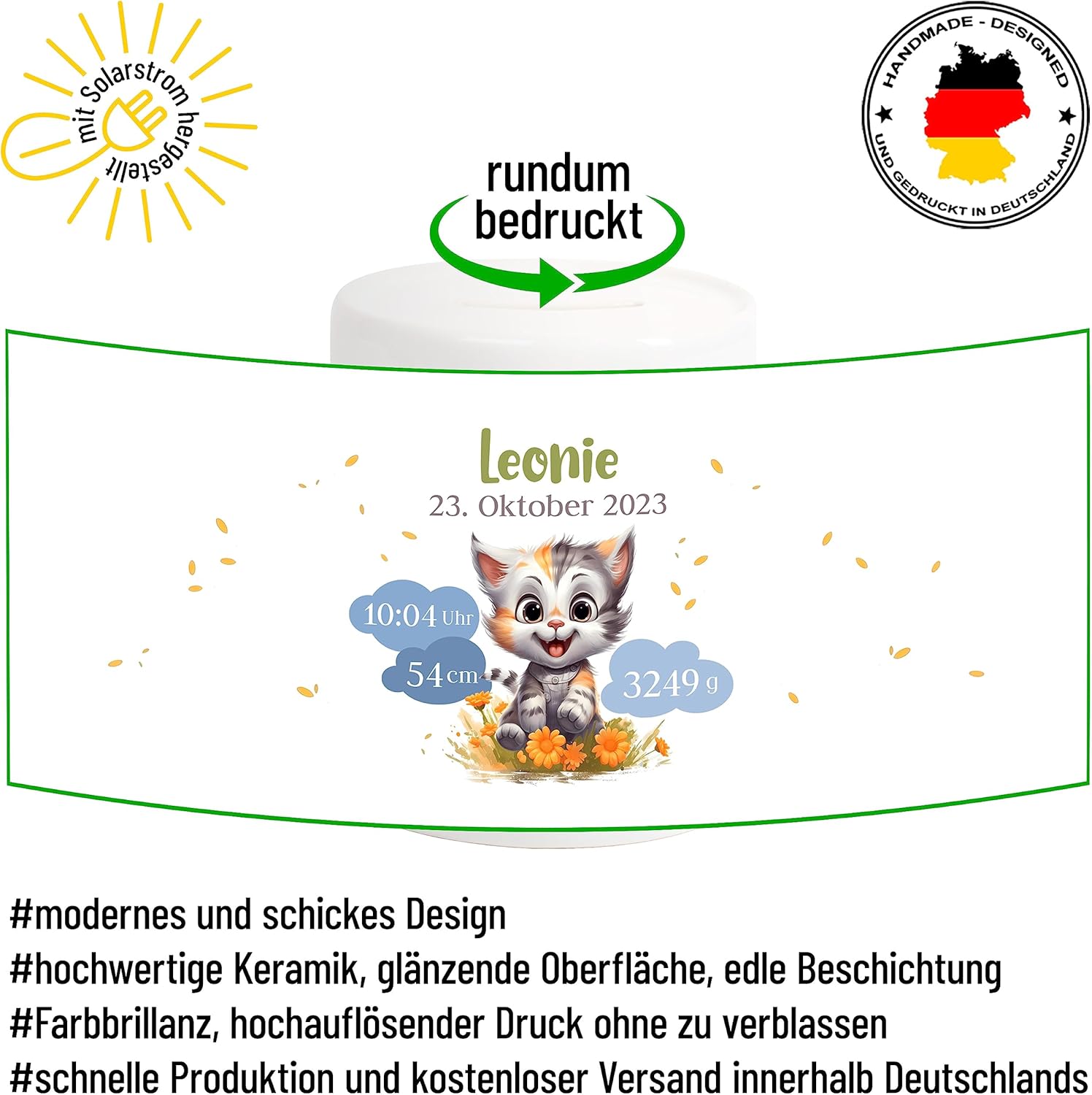 ✅ Il salvadanaio personalizzato per bambini con simpatici motivi di animali (unicorno, gatto, cane, giraffa, scimmia, zebra, tigre, pecora, vitello, pulcino) è ideale sia per ragazze che per ragazzi. Puoi personalizzare il salvadanaio con il tuo compleanno. Il salvadanaio per bambini può essere stampato con il peso, le dimensioni, l'ora e la data di nascita per conservarlo per sempre come un bel ricordo😊 ✅ Basta fare clic su "PERSONALIZZA ORA", inserire il nome del bambino e le date di nascita e ordinare questo salvadanaio per bambini unico! Il salvadanaio per bambini è ideale per regalare soldi in occasione di nascite e battesimi, compleanni, iscrizioni scolastiche o anche come regalo di Natale! ✅ Diametro ca. 8 cm, altezza ca. 10 cm - richiudibile - motivo stampato tutt'intorno. La ceramica di alta qualità e la stampa ad alta risoluzione garantiscono elevata durata e brillantezza dei colori! ✅ REGALO DI Natale PERFETTO per figlia, figlio, nipoti e nipoti - salvadanaio individuale con bellissimo motivo per bambini e nome personale. I regali in contanti per i più piccoli della famiglia possono essere misteriosamente regalati con alcune monete da nonna e nonno o da mamma e papà. I più piccoli non vedranno l'ora di scuotere il salvadanaio e di puzzle sul suo contenuto in base al suono😊 ✅ Un salvadanaio stampato individualmente: il tuo nuovo salvadanaio moderno preferito. Un'idea regalo personale e originale come regalo di Natale per bambini e adulti, un regalo di ringraziamento nel periodo che precede il Natale o semplicemente per dire grazie ogni tanto! Un regalo che lascia a bocca aperta il contenuto quando si apre il salvadanaio! ✅ Progettato e stampato in Germania - Progettato con amore in Germania e stampato a mano in modo equo, sociale e amorevole nella Foresta Nera. Per il nostro processo di stampa (sublimazione) utilizziamo inchiostro ecologico e stampiamo in modo sostenibile utilizzando solo l'energia solare.