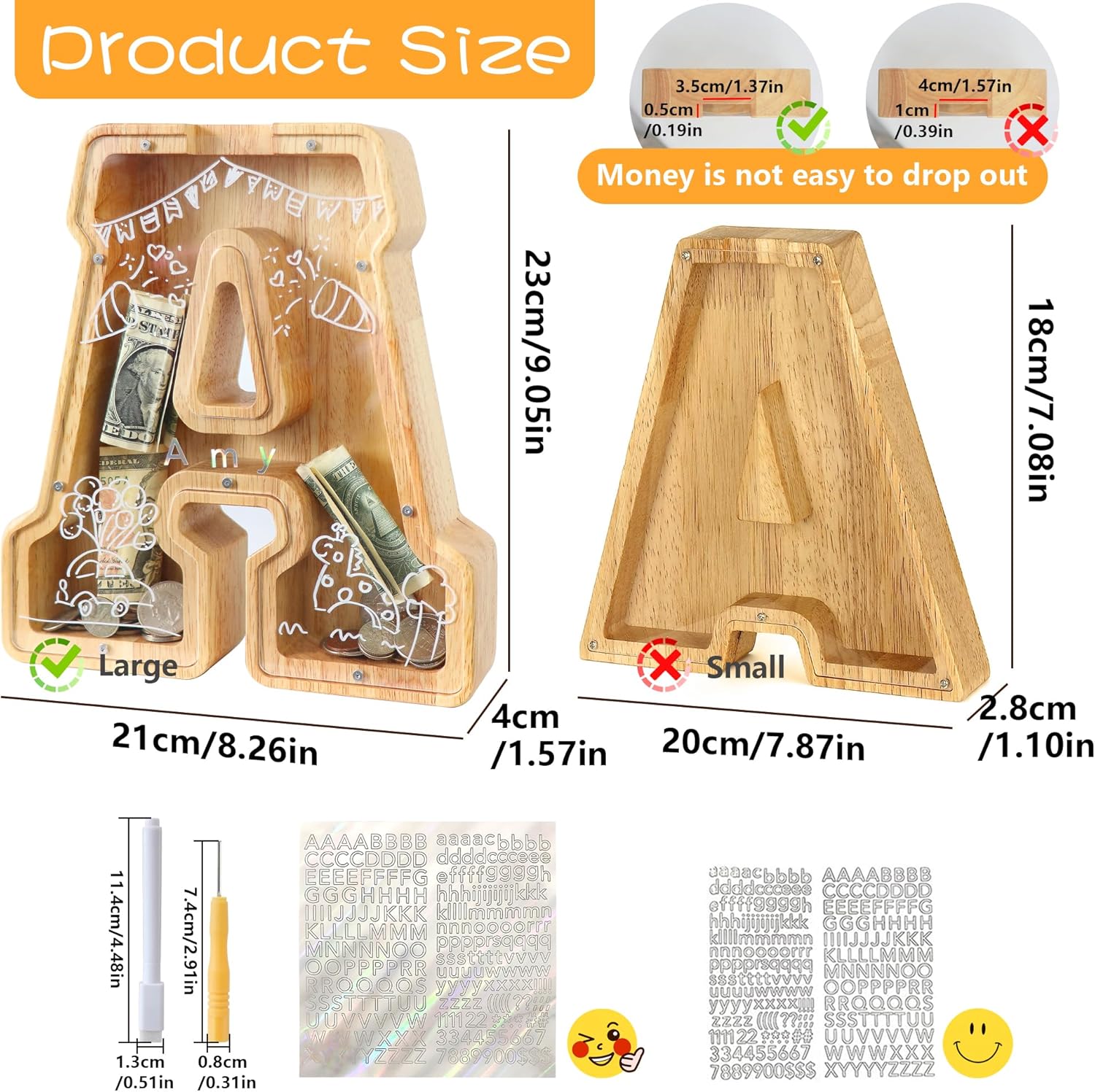 Nuovissimo salvadanaio in legno: Lakpopya porta un salvadanaio personalizzato di nuova concezione che aiuta i bambini a raggiungere un obiettivo di risparmio alla volta. Il pannello acrilico trasparente consente ai bambini di vedere chiaramente l'andamento dei loro risparmi e li incoraggia a partecipare attivamente al risparmio e a sviluppare buone abitudini di risparmio e capacità di gestione finanziaria. Dimensioni: A: 18 cm, L: 3 cm Nuovo design: Quattro nuovi design: 1. due nuovi salvadanai per bambini a forma di cuore e "&"; 2. Ogni angolo è progettato con angoli arrotondati, che sono più belli ed evitano gli urti dei bambini; 3. un'area target sul retro per annotare gli obiettivi di risparmio; 4. Viti su misura, che sono più belle e resistenti delle normali viti e non possono essere aperte a piacimento da altri cacciaviti, riducendo il rigore del risparmio. Accessori arricchiti: Lakpopya ha dotato il salvadanaio dei bambini di una vasta gamma di accessori: penna riutilizzabile e cancellabile*1 e adesivi*1 - I bambini possono creare salvadanai unici scrivendo fai da te (nome, obiettivo di risparmio, anniversario, ecc.) e scarabocchiando sulla lavagna trasparente. La scrittura sulla penna cancellabile può essere cancellata; Cacciavite esclusivo*1 - Questo cacciavite corrisponde alla chiave del salvadanaio e può allentare le nostre singole viti. Imballaggio raffinato e protezione a 360°: Il nostro salvadanaio in legno è ideale anche come regalo: abbiamo pensato al fatto che vuoi fare un regalo a un bambino o a un amico, quindi il salvadanaio in legno viene fornito con un imballaggio raffinato e all'interno c'è cotone perlato extra spesso per proteggere completamente il salvadanaio dai danni causati dagli urti. Questo è il regalo per compleanni e festività, dignitoso e sorprendente per chi lo riceve. ADATTO A TUTTE LE ETÀ: Questo salvadanaio in legno con lettere è adatto a tutte le età e può essere utilizzato per i risparmi quotidiani o per sviluppare le capacità finanziarie dei bambini e insegnare loro l'importanza di gestire i propri soldi. Questo salvadanaio è realizzato in legno massello di alta qualità, con linee morbide, aspetto bello ed elegante, pratico e resistente o una decorazione domestica semplice ma unica.