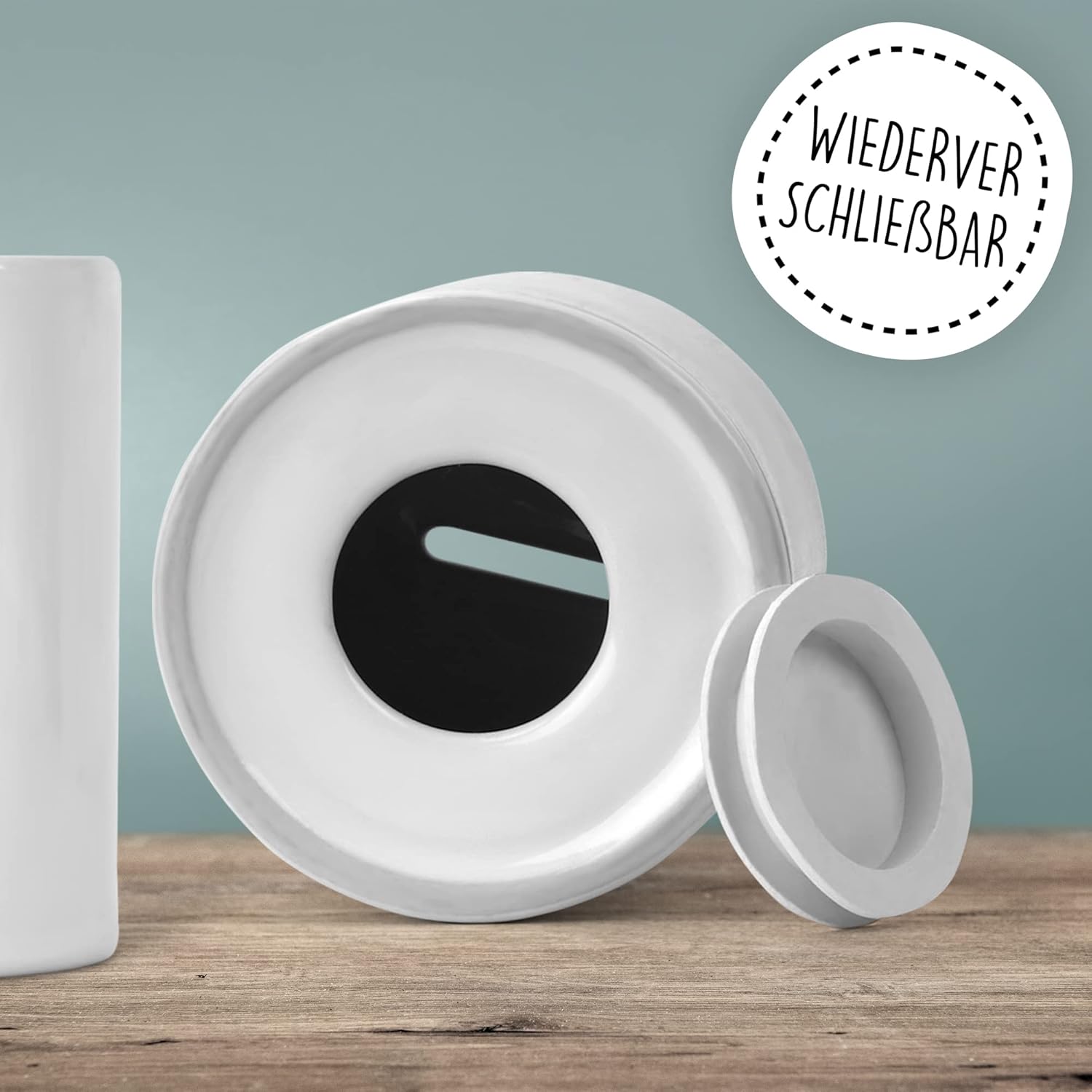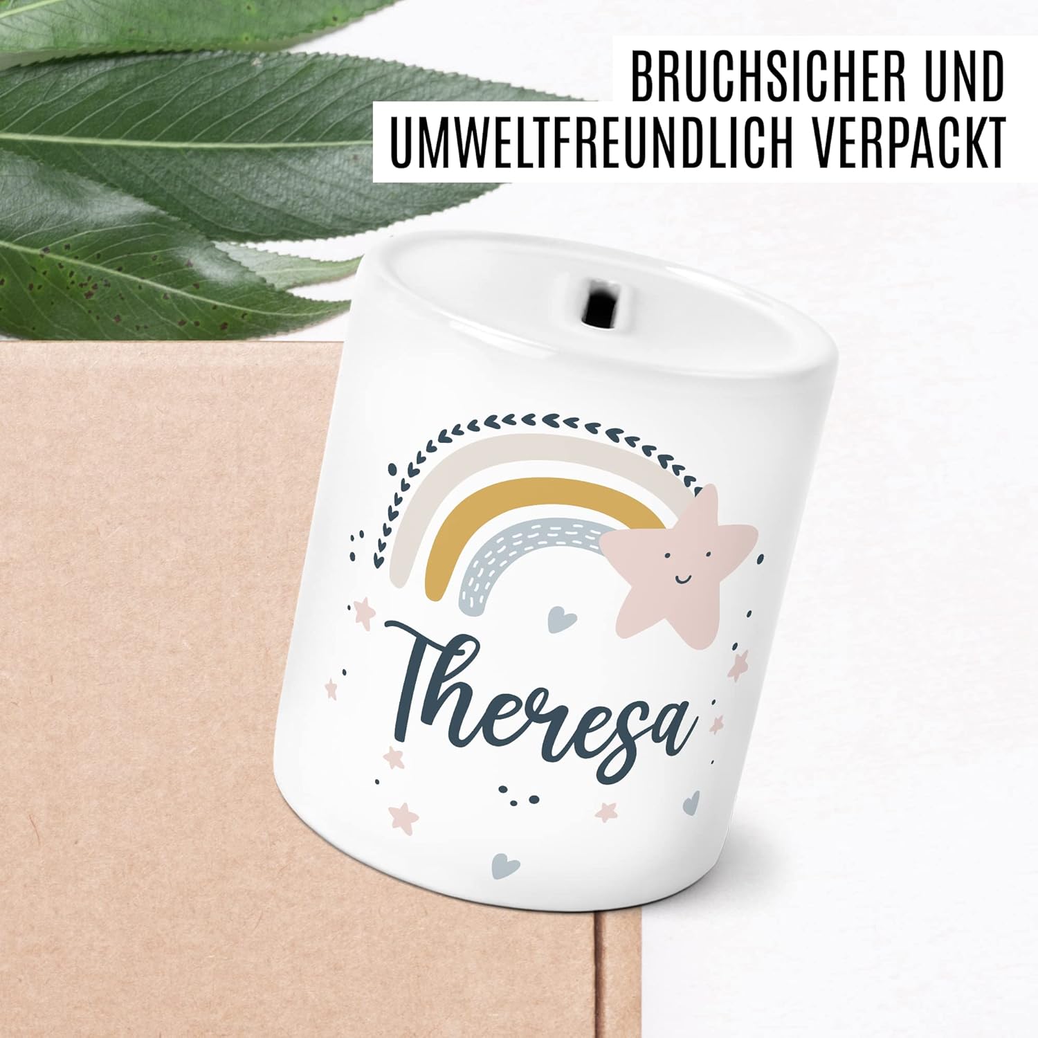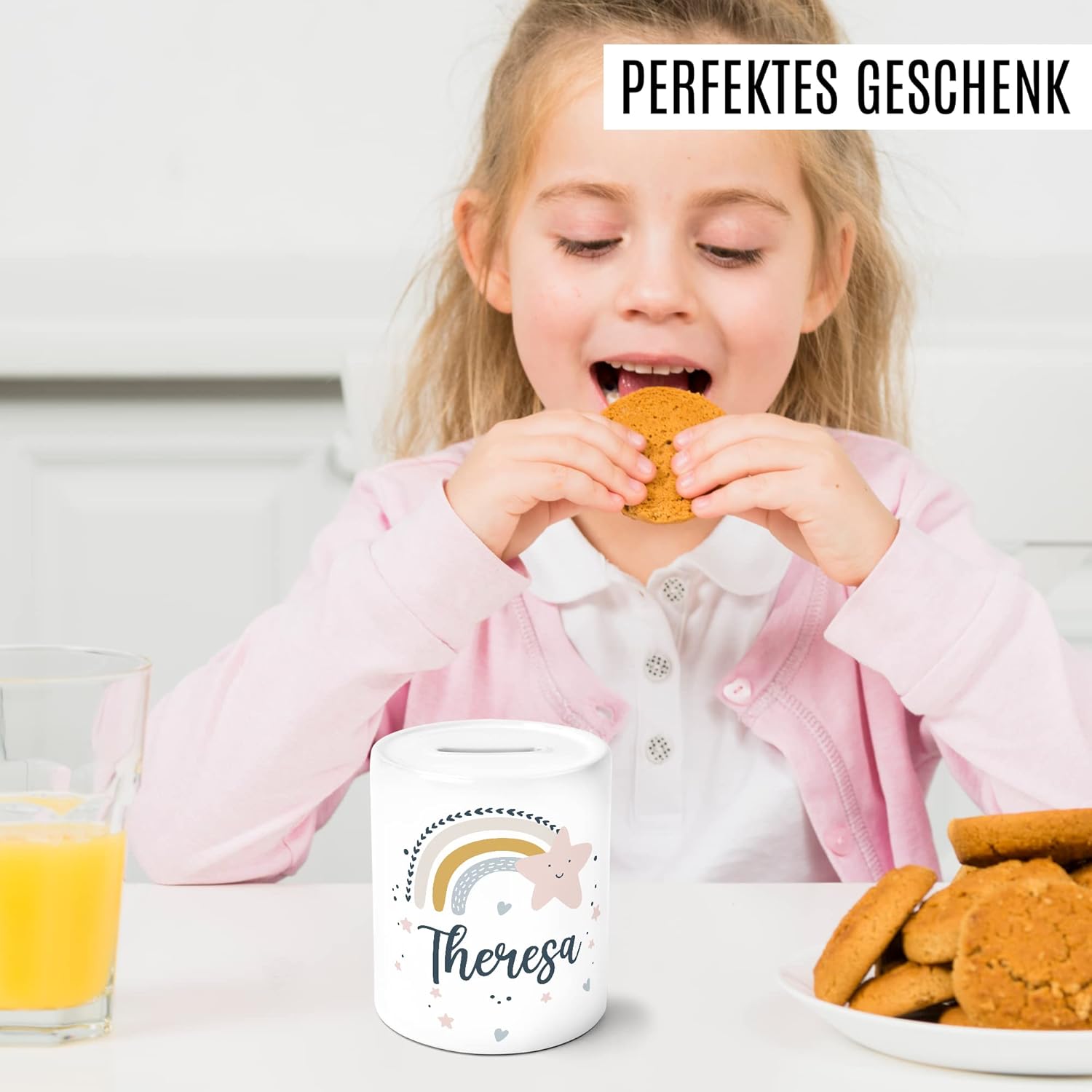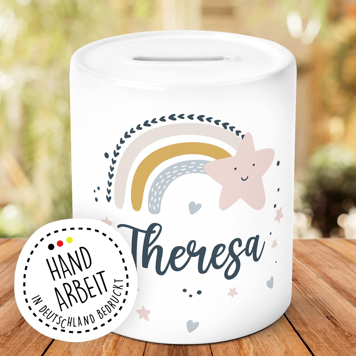 🌈 SALVADANAIO ARCOBALENO: simpatico salvadanaio personalizzabile con motivo ad acquerello. Un bel regalo per la prima paghetta, per l'inizio della scuola o come regalo di compleanno per i bambini. 🌈 PERSONALIZZATA con il proprio nome, questa idea regalo per tua figlia, nipote o conoscente è unica. Questo fantastico salvadanaio/buono di risparmio con disegno a colori arriva sempre in modo affascinante. 🌈 ALTA QUALITÀ: superficie premium in ceramica al 100%. Richiudibile con pratico tappo in gomma sul fondo. Lavabile in lavastoviglie. Altezza: 10 cm, diametro: 8 cm, peso: 300 g. 🌈 STAMPATO SU PIÙ LATI e quindi bello da più lati. Un fantastico regalo di Natale o di compleanno. Tutti i salvadanai sono imballati con cura e stabilità. 🌈 FATTO A MANO: rifinito, stampato, confezionato e spedito in Germania. Ogni salvadanaio con stampa Pagma è progettato con attenzione ai dettagli. La stampa robusta garantisce un piacere duraturo.