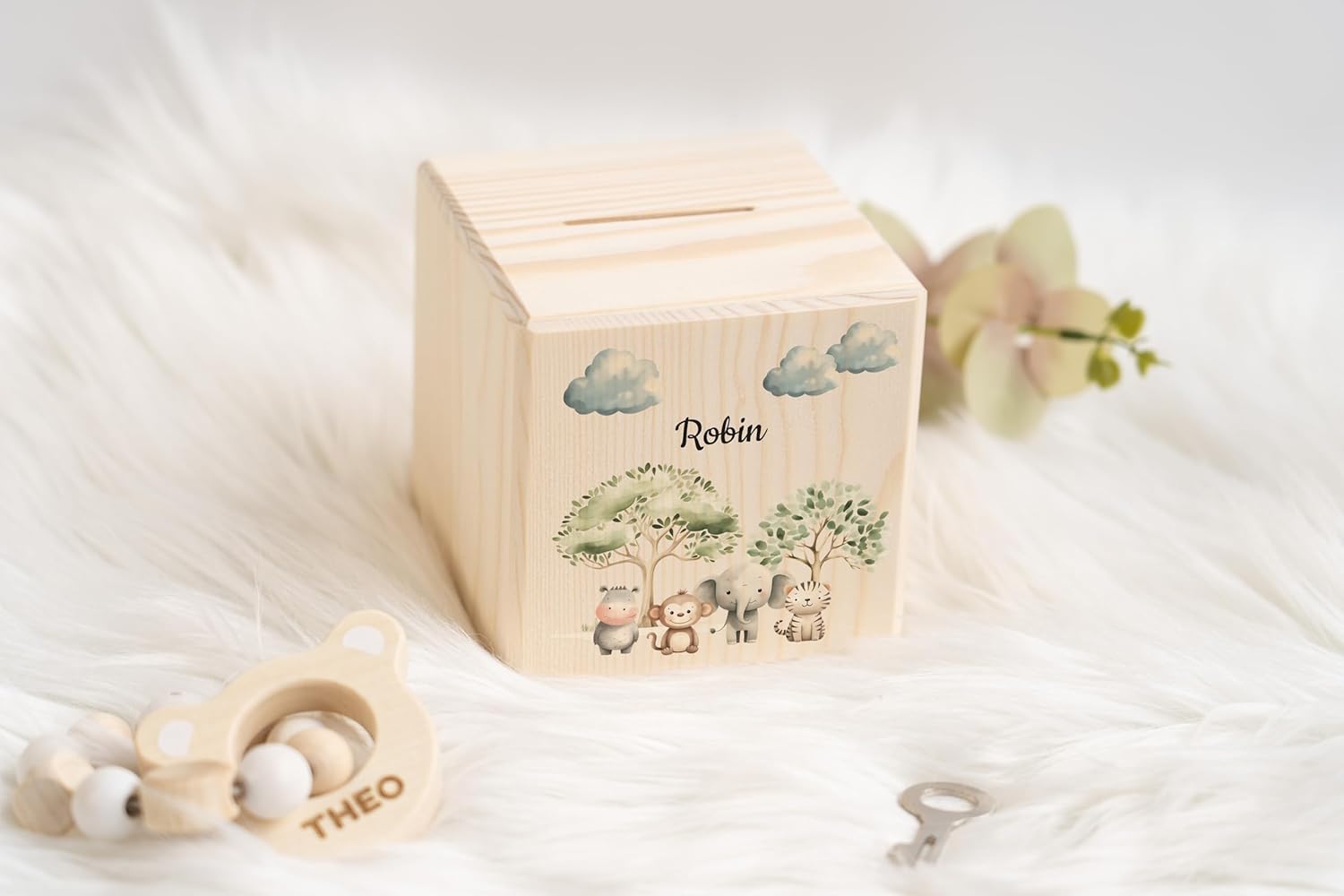 SALVADANAIO PER BAMBINI CON NOME: Il nostro salvadanaio in legno di alta qualità con serratura e chiave offre il modo perfetto per risparmiare denaro. Con dimensioni di 10 x 10 cm c'è abbastanza spazio per monete e appunti. Progetta il tuo salvadanaio in legno in "Personalizza ora". Scegli tra una varietà di simpatici motivi di animali e crea un pezzo unico per la cameretta del tuo bambino. REGALI PER LA NASCITA: Il salvadanaio in legno con un motivo personalizzato è adatto come bellissimo regalo per la nascita per tutti i neonati. Il modo ideale per conservare in sicurezza tutti i regali di nascita. REGALI DI NATALE PER BAMBINI: Cerchi un regalo di Natale originale o un regalo di Babbo Natale per bambine e bambini? Allora hai trovato il regalo perfetto. Un salvadanaio speciale che si distingue tra tutti i regali. SALVADANAIO PER L'INGRESSO A SCUOLA: Il nostro salvadanaio personalizzato è il regalo ideale per l'inizio della scuola. Adatto a ragazzi o ragazze, il regalo per il rientro a scuola può essere liberamente progettato con diversi motivi e animali. TROVATO: Probabilmente hai cercato "salvadanaio per bambini", "regalo di Natale per bambini", "regali di compleanno", "regali di Natale per ragazze", "salvadanaio per bambini con serratura", "salvadanaio per bambini con chiave", "salvadanaio per bambini", "salvadanaio con nome" o "regali significativi per una nascita". Allora abbiamo il regalo giusto per la nascita, Babbo Natale o Natale per bambini di 2 o 3 anni.