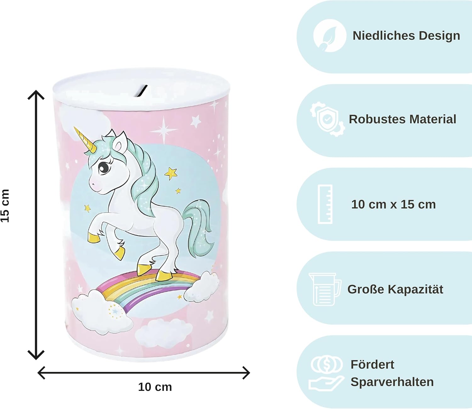 🐴Grazioso design di unicorno su arcobaleno: questo salvadanaio colpisce per il suo simpatico motivo di unicorno. l'unicorno si trova su un arcobaleno colorato. Perfetto per i piccoli fan degli unicorni per risparmiare giocosamente con questa cassa di risparmio per bambini con unicorno e allo stesso tempo decorare la cameretta dei bambini. 💪 Robusta cassa di risparmio in metallo con unicorno per la longevità: il registratore di cassa da viaggio con unicorno è realizzato in robusto metallo, che lo rende particolarmente durevole e resistente. Ideale per bambini e adulti che vogliono collezionare e conservare monete e banconote. 📦 Dimensioni generose per molte monete e banconote: con abbastanza spazio per i soldi, questa scatola salva felicità con unicorno glitterato offre molto spazio per raggiungere obiettivi di risparmio a lungo termine. Perfetto per obiettivi di risparmio come piccoli e grandi esauditori di desideri, regali, per le prossime vacanze o semplicemente come raccoglitore di paghette. 🎁 Salvadanaio regalo XXL per ragazze cavallo: questo salvadanaio cavallo è ideale come regalo per compleanno, Natale o come souvenir per gli amanti degli unicorni piccoli e grandi. Non è solo pratico, ma anche un bellissimo oggetto decorativo per la cameretta o la cucina di ogni bambino. 🔒 Facile da usare: il salvadanaio è dotato di una pratica fessura nella parte superiore attraverso la quale è possibile inserire facilmente monete e banconote. Allo stesso tempo, è sicuro e protegge i risparmi dalle perdite. Poiché il salvadanaio può essere aperto solo tagliandolo, è perfetto per bambini e adulti che vogliono impegnarsi in un obiettivo di risparmio a lungo termine. Risparmiare diventa un vero impegno: nessuna tentazione di spendere i soldi troppo presto!