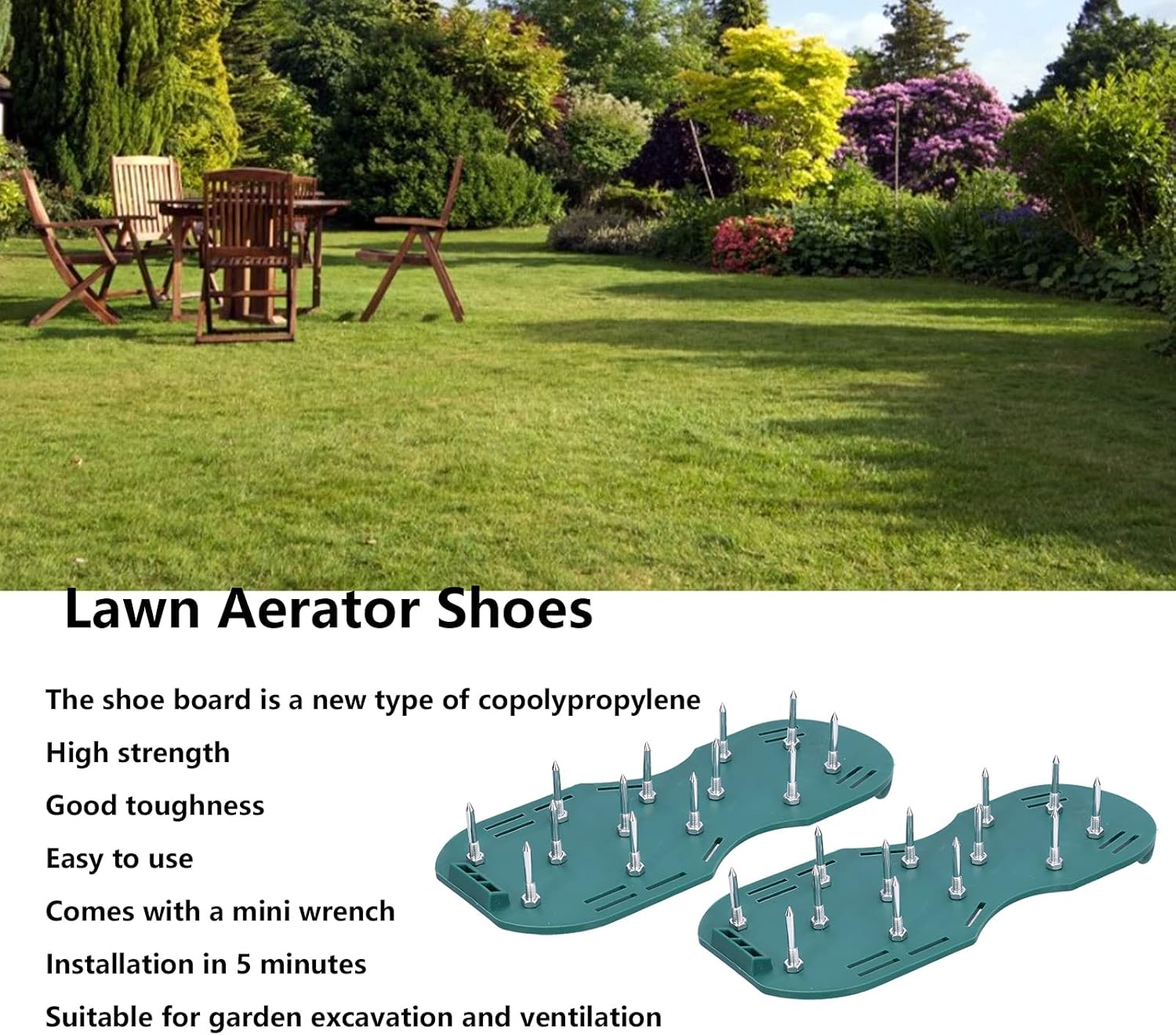 [MATERIALE AD ALTA RESISTENZA] La tavola per scarpe è realizzata in resistente copolipropilene, garantendo un uso e una robustezza duraturi. [FACILE INSTALLAZIONE] Viene fornito con una mini chiave per un'installazione rapida e semplice, risparmiando tempo e fatica. [DESIGN EFFICIENTE] Basta fissare i chiodi con le viti e fissare le cinghie, consentendo di aerare il terreno in soli 5 minuti. [UTILIZZO VERSATILE] Ideale per scavi in giardini, verniciatura di pavimenti, lavori di costruzione e progetti speciali di pavimentazioni in cemento. [UTILIZZO SEMPLICE] Indossa questi sandali per camminare sul prato e allenta efficacemente il terreno compattato per una crescita più sana dell'.