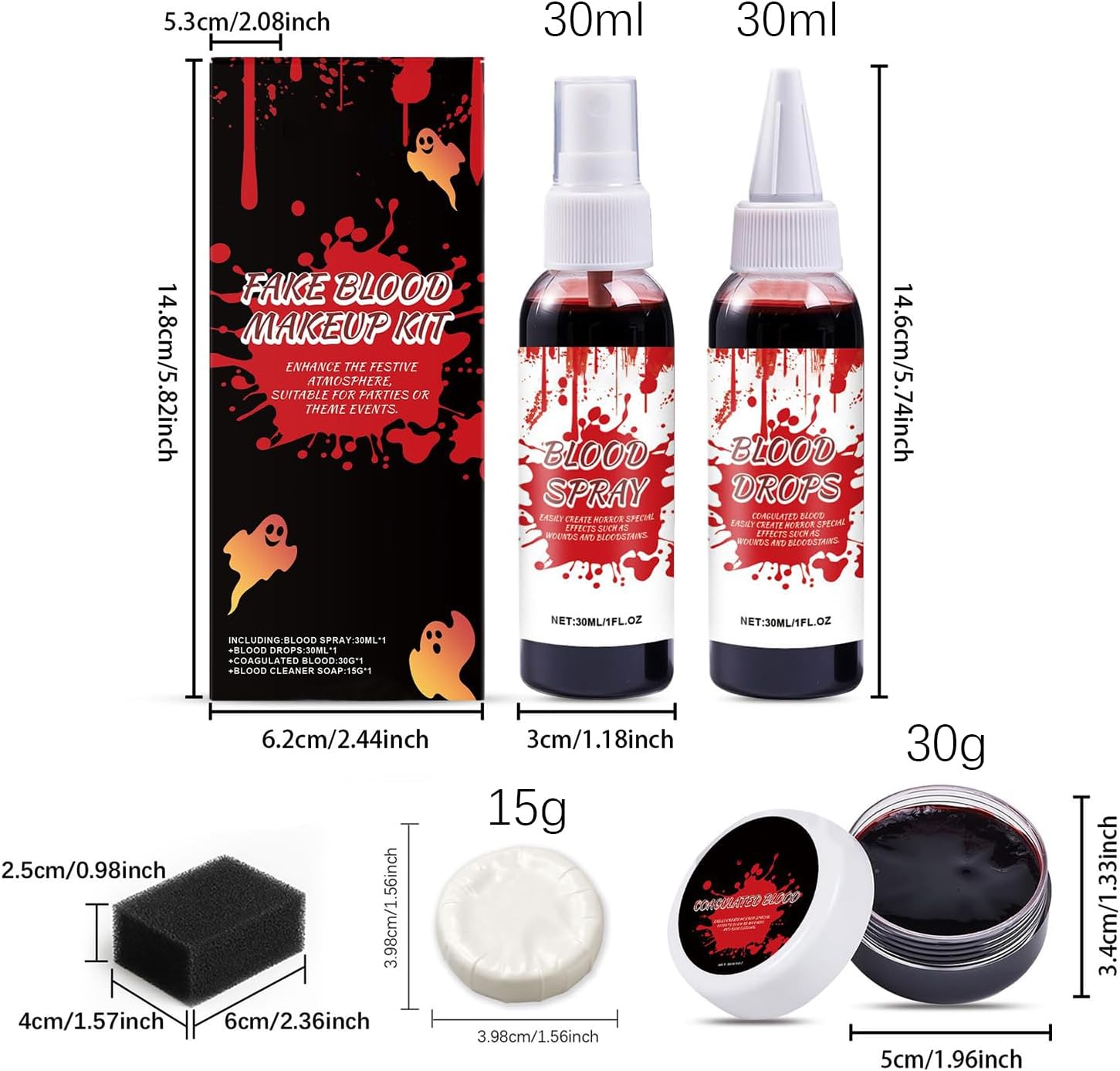Effetti visivi realistici: crea un aspetto autentico con sovrapposizione tridimensionale, simulazione di flusso naturale e copertura fine uniforme per risultati di trucco sanguinante Halloween realistici Uso versatile: perfetto per il trucco di Halloween e le feste a tema, questo kit di sangue finto trasforma i look con realismo. Ideale per esigenze di effetti speciali cinematografici e scenici grazie alla sua applicazione facile e creativa. Pulizia semplificata: speciale formula morbida per rimuovere il trucco senza striature, evita problemi di colorazione persistente e facilita la pulizia dopo festa di Halloween. Sovrapposizione di effetti: grazie al sapone detergente incluso, la pulizia è semplificata, mentre i contagocce al plasma offrono effetti orrifici complessi e sovrapposti, ideali per il trucco di Halloween. Modelli complessi di successo: progettato per principianti e appassionati, consente una modellazione precisa di effetti sanguigni complessi senza grumi, garantendo una facile manipolazione e risultati coerenti in ogni creazione.