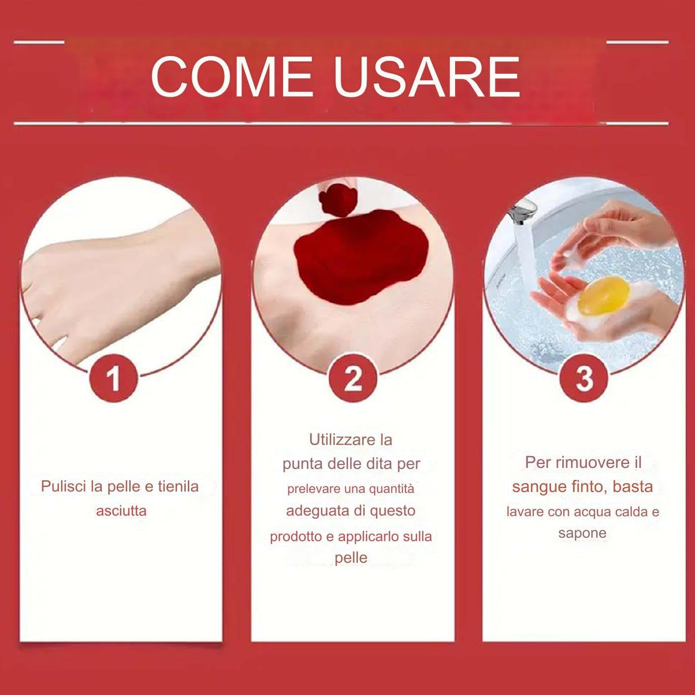 Fattore inquietante: un'esperienza realistica con il nostro sangue finto di Halloween, realizzato con consistenza e fluidità meravigliose, garantendo colori realistici ed effetti reali per le tue scene spettrali Esperienza realistica: crea effetti agghiaccianti ad Halloween con il nostro sangue finto. Fornisce una perfetta simulazione del sangue reale, migliorando l'atmosfera festosa e utilizzato per qualsiasi effetto di scena cruenta Pulizia rapida: non è necessario dedicare ore alla rimozione delle macchie; immergi semplicemente il sangue sui vestiti per 20 minuti, quindi lavali con sapone e un po' di acqua calda per riprenderli facilmente dopo la festa Aumenta la tua notte di paura: interpretare personaggi feriti ad Halloween ti consentirà di aumentare con sicurezza e gioia il divertimento e l'eccitazione con le persone amate grazie alle sostanze sicure impiegate. Un capo indispensabile per questo inquietante carnevale Ampia gamma di usi: il nostro sangue finto di Halloween è per insegnare il trucco, film, drammi e Halloween. Crea effetti realistici, mostrando stili diversi per ogni scena