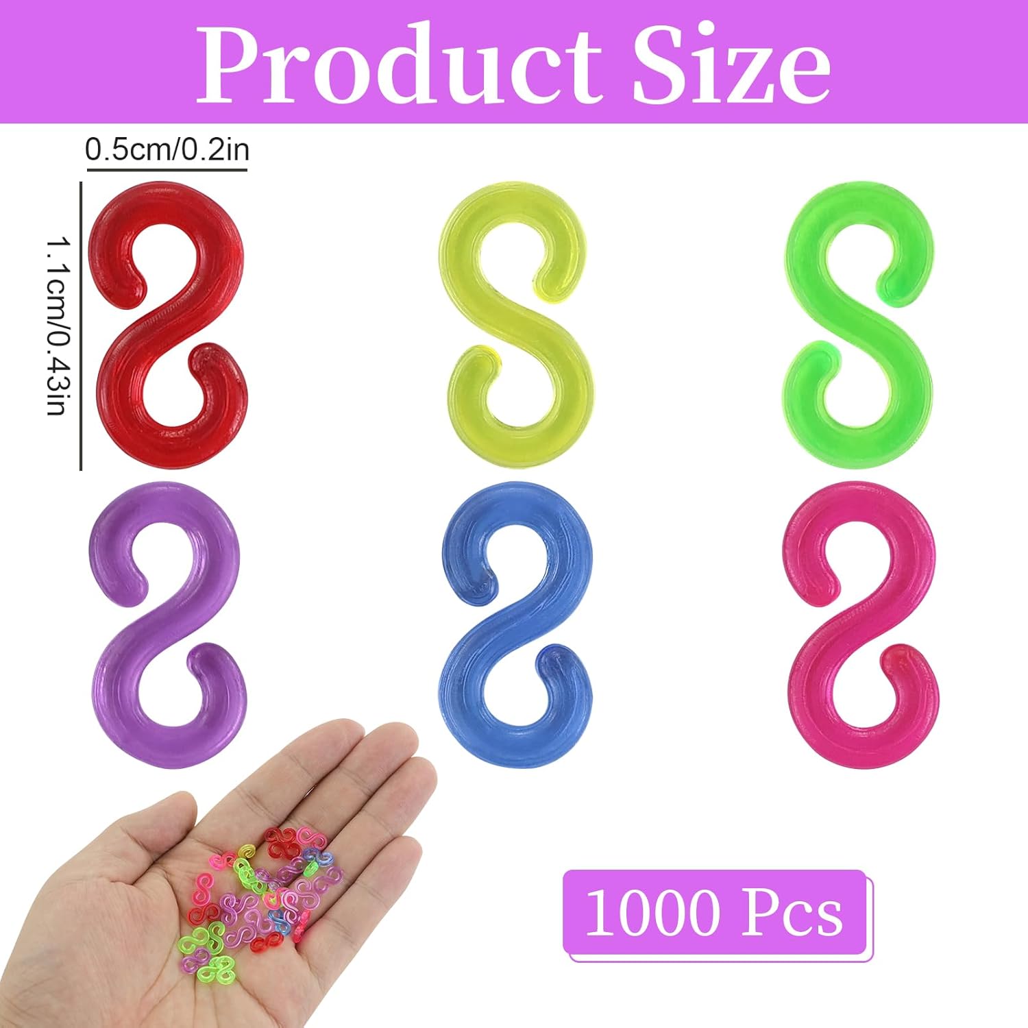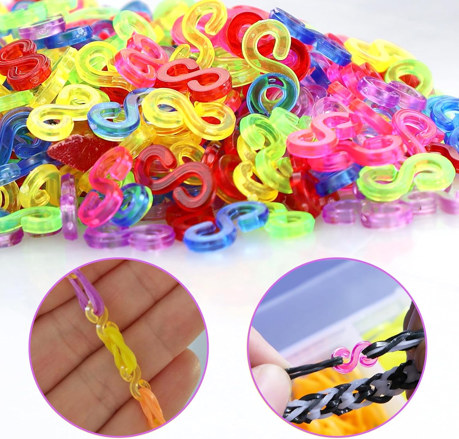 Kit completo di 1000 clip: il pacchetto include 1000 clip colorate a S in 6 colori e 4 piccoli uncinetti e 2 strumenti per tessitura a forma di Y. Il set di chiusure a nastro Loom perfetto per tutti i progetti di bricolage. Plastica resistente per una lunga durata: queste chiusure Loom sono realizzate in plastica di alta qualità, mantengono saldamente i nastri del telaio e impediscono che si allentino o si rompano – durevoli e affidabili. Colori vivaci per la creatività: le clip colorate a S aggiungono colore alle tue creazioni, offrono infinite possibilità di personalizzare bracciali, collane e molto altro ancora, ideali per sviluppare la creatività tra bambini e adulti. Facile da usare per tutte le età: le chiusure a nastro Loom sono facili da applicare e rimuovere, senza attrezzi complicati. Perfetto per bambini e adulti per creare creazioni personalizzate. Versatile per vari progetti: non solo per collegare nastri per telai per accessori, ma anche per ciondoli per borse, portachiavi e piccole decorazioni, le clip colorate a S ampliano le tue possibilità di bricolage.