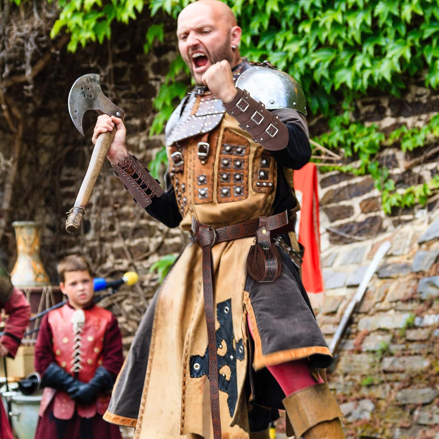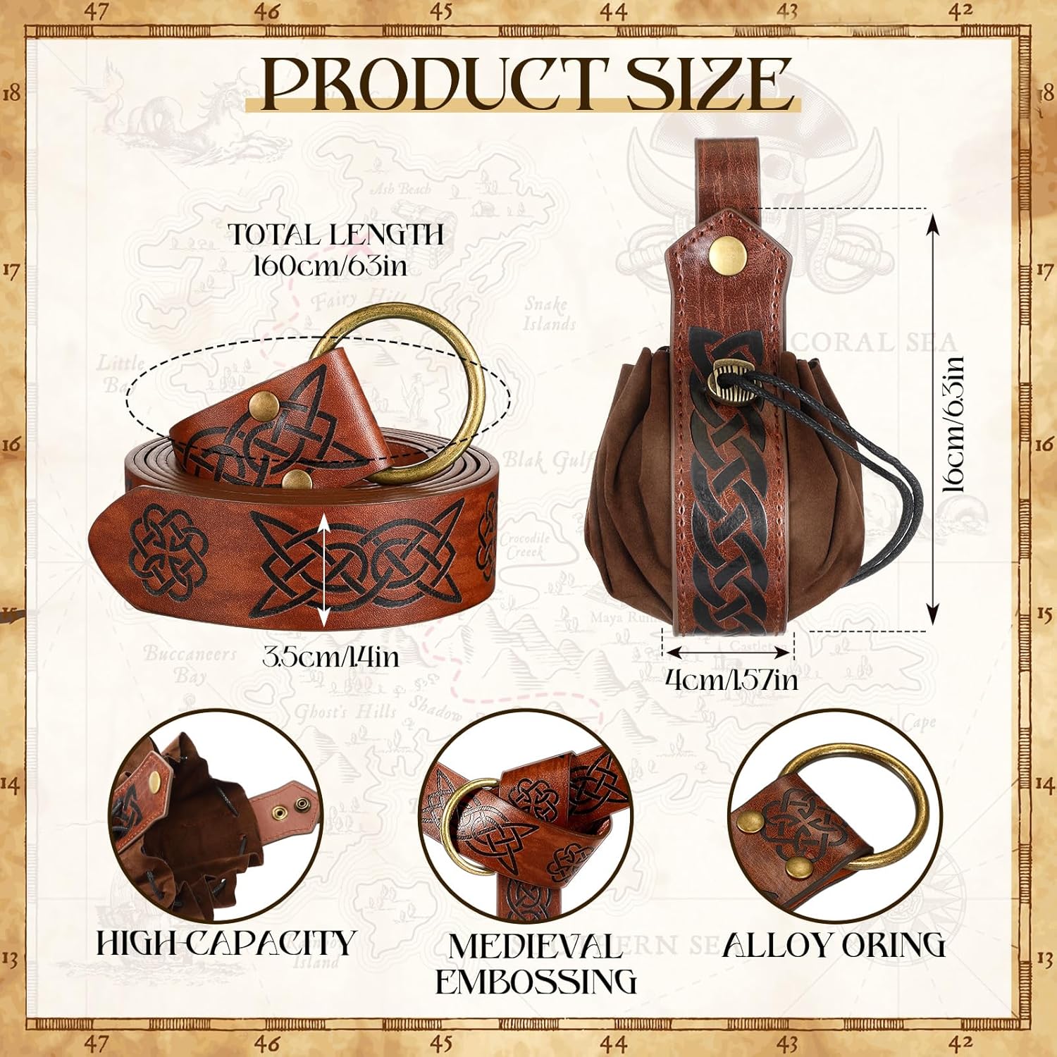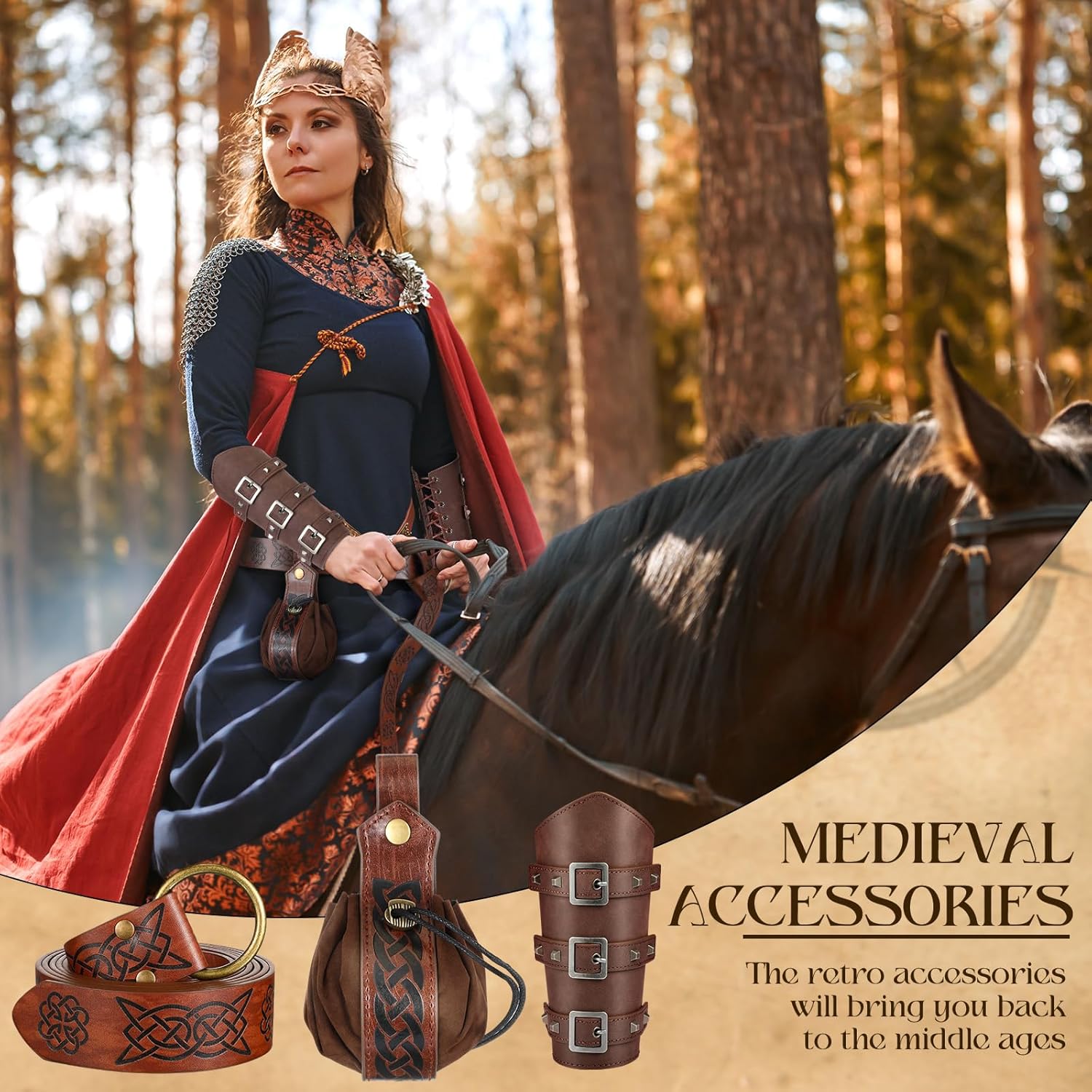 Contenuto della confezione: il nostro set di accessori per costumi medievali contiene 1 paio di bracciali, 1 cintura e 1 custodia da cintura per regalarti un'autentica esperienza medievale Misura regolabile: la cintura è lunga, quindi puoi tagliarla tu stesso in base alla misura della tua vita individuale; I nostri bracciali medievali in pelle possono essere facilmente adattati alle tue braccia con una corda; Questo abito da negromante di Halloween può essere facilmente adattato a diverse taglie ed è adatto sia a uomini, donne Materiale di alta qualità: i nostri accessori per costumi medievali sono realizzati in finta pelle, un materiale comodo e resistente; Promette longevità e si inserisce perfettamente nell'atmosfera del Medioevo Versatile: gli accessori per costumi da vichingo sono ideali per feste di Halloween, feste a tema, giochi di ruolo, cosplay, ecc.; Il suo design autentico aggiunge atmosfera a qualsiasi festa e ti rende al centro dell'attenzione in ogni evento Design medievale: la cintura medievale in rilievo è dotata di un o-ring in ottone, mentre la custodia da cintura ha un cordoncino per una facile apertura e chiusura; Sia il marsupio che la cintura sono decorati con motivi vintage in rilievo, mentre il parabraccio medievale è rifinito con rivetti e fibbie; L'intero set emana il fascino del Medioevo attraverso il suo design rustico e dettagliato