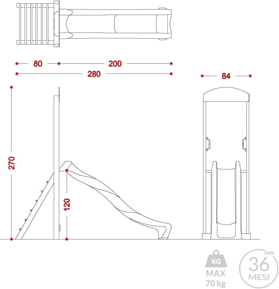 FUNZIONALITÀ : Scivolo con risalita a pioli in acciaio verniciato; ETÀ : da 36 mesi; PORTATA SCIVOLO : Kg 70; MATERIALE STRUTTURA : Legno di pino nordico impregnato - MATERIALE SCIVOLO : polietilene rotazionale 100% MADE IN ITALY