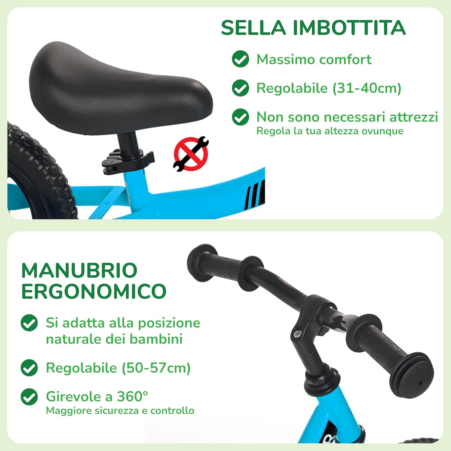 🚲 MONTAGGIO SEMPLICE: basta far scorrere il manubrio e la sella sul telaio della bici, posizionare entrambe le ruote in posizione e stringere il tutto per renderlo saldo (attrezzi necessari inclusi). In 5 minuti sarà pronto per essere utilizzato. 👶 PER I PIÙ PICCOLI: Il design unico della bicicletta senza pedali Sawyer consente di regolare la sella in una posizione molto bassa, in modo che i bambini possano iniziare a usarla fin dalla più tenera età (a partire da 85 cm di altezza). 💨 ULTRALEGGERO: il suo peso ridotto (2,9 kg) fa sì che i bambini godano di un'ottima sensazione di controllo fin dal primo momento. Questa caratteristica, insieme al suo caratteristico design ergonomico che si adatta perfettamente al corpo dei bambini, rende facile per loro imparare a usarlo in tempi record. 🐈 PADRONEGGIA IL TUO EQUILIBRIO: ti permette di potenziarlo in modo intuitivo e senza sforzo per garantire che il passaggio alla bici a pedali sia un successo anche senza bisogno di rotelle. 🐈 PADRONEGGIA IL TUO EQUILIBRIO: ti permette di potenziarlo in modo intuitivo e senza sforzo per garantire che il passaggio alla bici a pedali sia un successo anche senza la necessità di rotelle 💪 DUREVOLE: costruzione solida, componenti di qualità e ruote antiforatura (valido per tutti i tipi di superficie). La bici senza pedali Sawyer è progettata per durare per molti anni. Inoltre, offriamo una garanzia a vita su tutti i nostri prodotti. 🌈 VARIETÀ DI COLORI: è disponibile in 8 colori in modo da poter scegliere quello che ti piace di più. Puoi acquistare il casco Sawyer abbinato per guidare sempre combinato e ben protetto. 💬 SODDISFAZIONE GARANTITA: siamo un'azienda europea. Risolviamo qualsiasi dubbio o problema quasi immediatamente. Siamo a vostra disposizione dal lunedì alla domenica attraverso diversi mezzi (WhatsApp, email, Amazon, web, Instagram, Facebook).