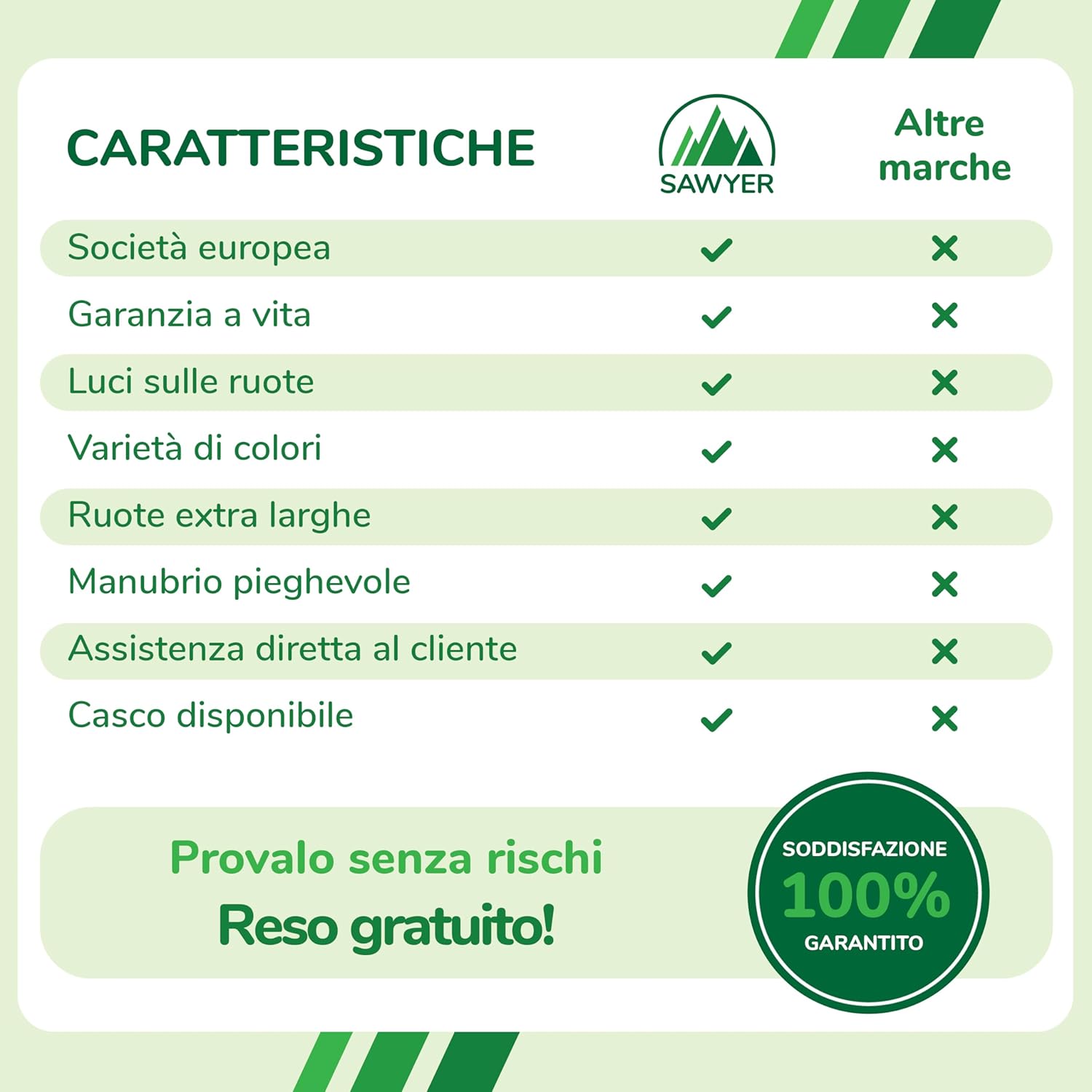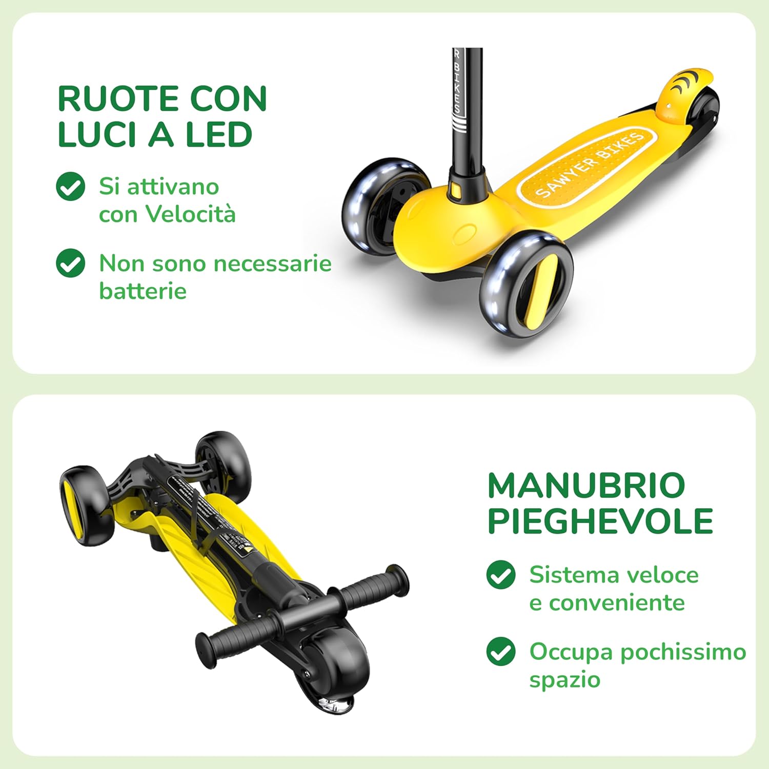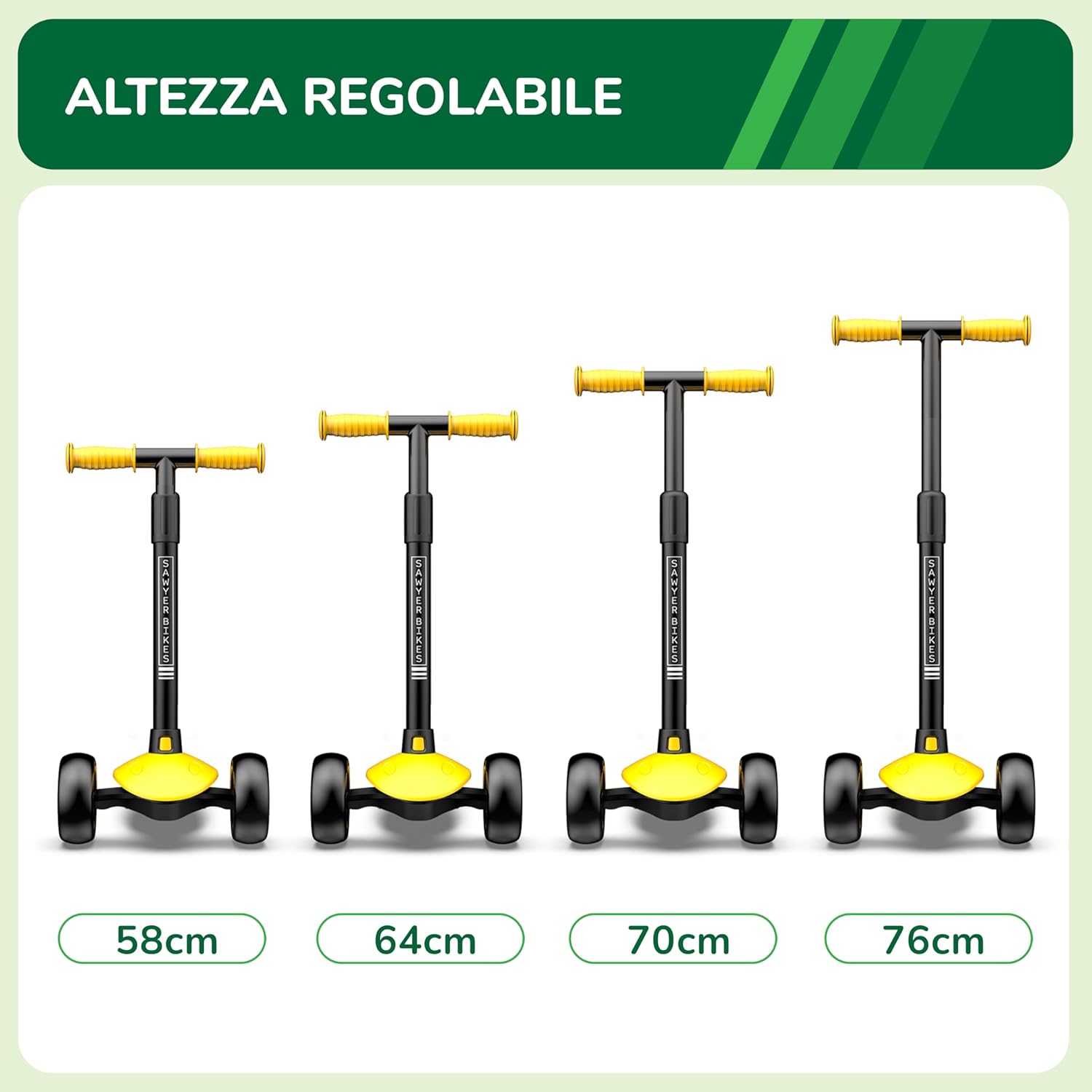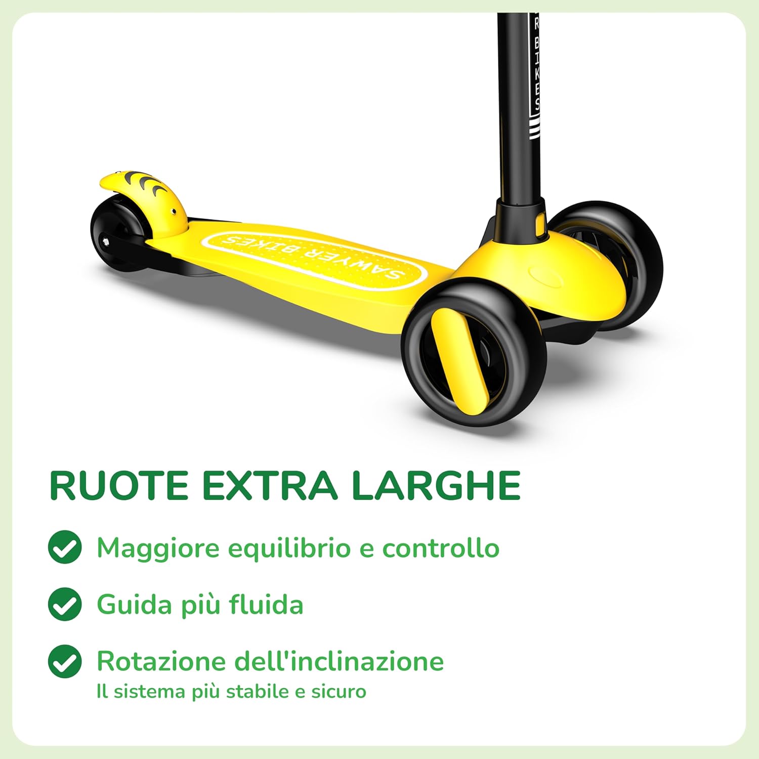 🛴 MONTAGGIO SEMPLICE: questo monopattino per bambini non richiede alcun tipo di attrezzo o installazione aggiuntiva. Fai scorrere il manubrio senza sforzo lungo la base del monopattino e sarà pronto per l'uso. 📏 ALTEZZA REGOLABILE: il manubrio può essere regolato in 4 posizioni (58 cm, 64 cm, 70 cm e 76 cm) per adattarlo facilmente alla crescita del bambino. È il regalo ideale per i bambini dai 2 anni in su per iniziare a esplorare il mondo su ruote. ↔️ FACILE DA GIRARE: ha un sistema di inclinazione, che è il più stabile e sicuro da girare. Consiste nello spostare il peso del corpo da un lato o dall'altro per dirigere la direzione dello scooter in modo fluido e preciso. 🔒 DISPOSITIVO DI APPRENDIMENTO ASSISTITO: Il nostro dispositivo unico consente di bloccare opzionalmente lo sterzo (facilmente attivabile e disattivabile da una linguetta) in modo che lo scooter vada solo dritto, in modo che i più piccoli acquisiscano sicurezza e pratichino l'equilibrio. 💨 ULTRALEGGERO: il suo peso ridotto (2,2 kg) fa godere i bambini di una grande sensazione di controllo fin dal primo momento. Questa funzione, insieme al suddetto dispositivo di apprendimento assistito, rende più facile per loro imparare a usarlo in tempi record. 🐘 RUOTE EXTRA LARGHE: forniscono allo scooter una stabilità superiore, permettendogli di rotolare su qualsiasi tipo di superficie in modo comodo e sicuro. Hanno anche luci a LED che si accendono quando si prende velocità (senza bisogno di batterie o batterie). 💪 DUREVOLE: costruzione solida, componenti di qualità e struttura rinforzata che supporta fino a 50 kg. Lo scooter Sawyer è progettato per durare per molti anni. Inoltre, offriamo una garanzia a vita su tutti i nostri prodotti.