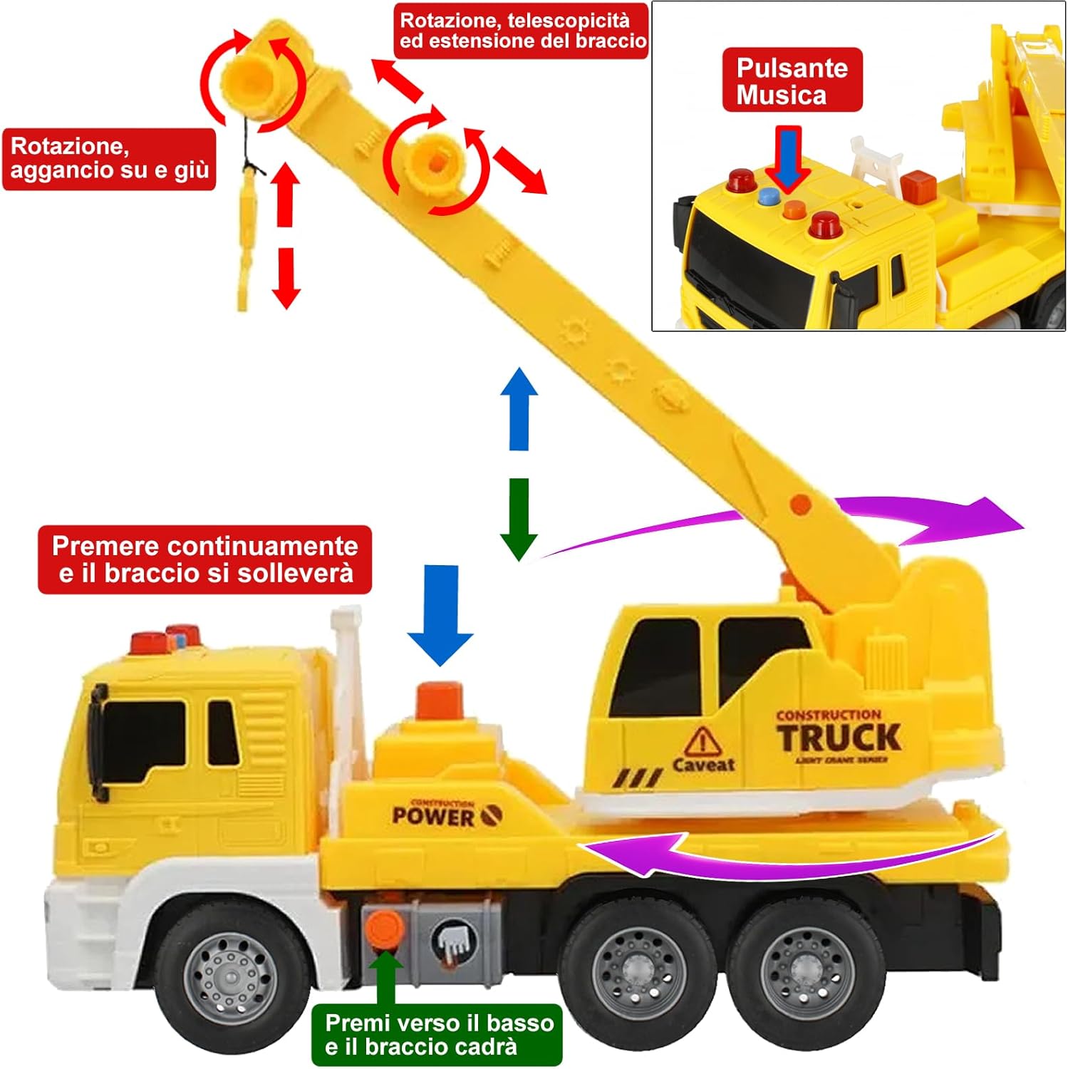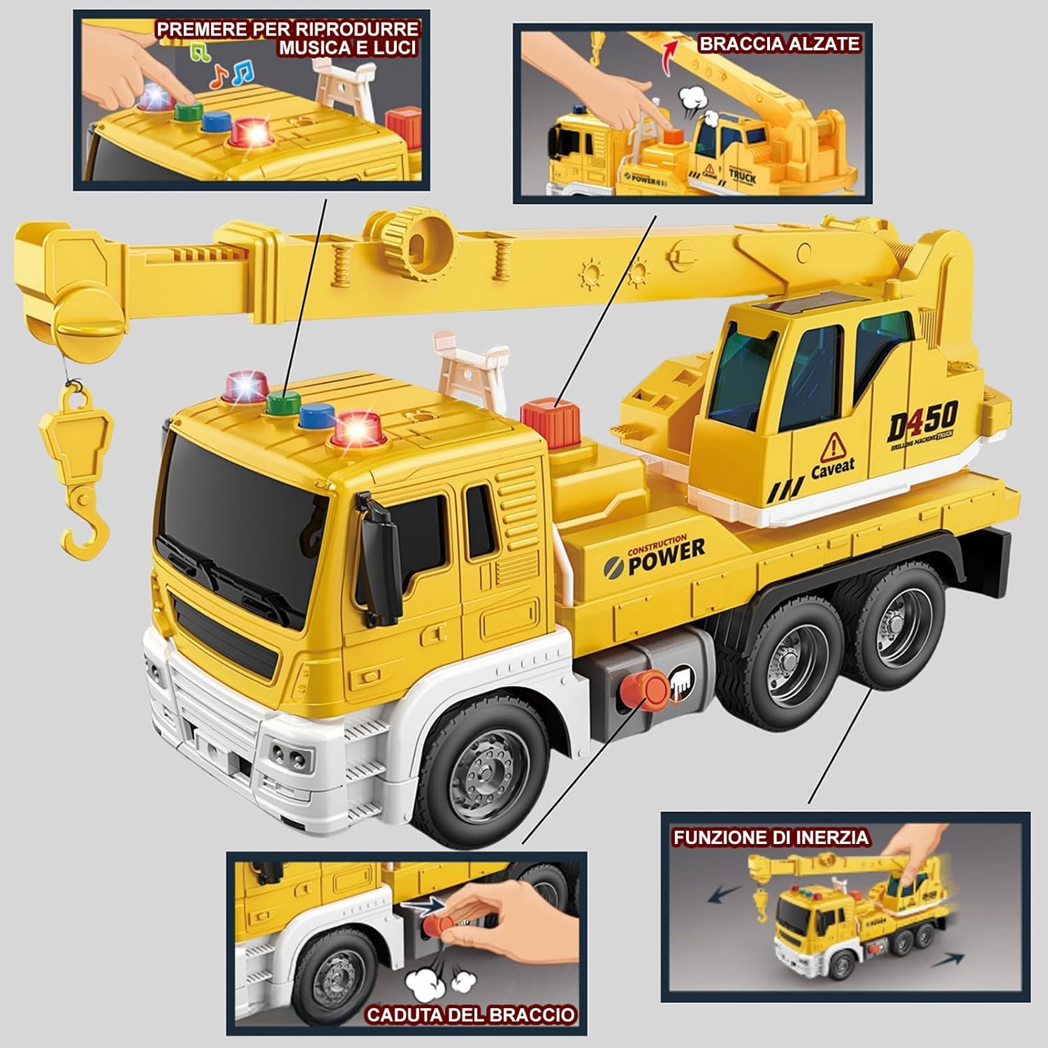 🏗️【Introduzione al prodotto】Gru pneumatica a inerzia per bambini 1:16. Veicolo: lunghezza 25 cm, larghezza 10 cm, altezza 12,5 cm. Con funzioni di luce e musica. La carrozzeria del veicolo è gialla e presenta scale simulate, serbatoio di carburante, cabina di pilotaggio, piattaforma di azionamento del braccio, braccio e gancio. 🏗️【Sicuro e durevole】Realizzate in plastica PVC sicura e durevole, lisce e senza sbavature, le ruote sono in gomma con dettagli realistici. Questo prodotto non può essere lavato con acqua. Se è sporco, puoi pulirlo con un panno umido. 🏗️【Divertimento dinamico】La gru ha 4 diversi tipi di suoni: accensione, clacson, retromarcia e attività. Il sollevamento del braccio avviene tramite un pulsante a gas e l'abbassamento tramite un pulsante laterale. Il braccio e il gancio possono essere retratti manualmente e il tavolo operatorio può essere ruotato manualmente di quasi 300 gradi. Le ruote sono azionate dall'inerzia: spingendo in avanti o indietro con la mano si ottiene un movimento continuo. 🏗️【Batterie incluse】Il veicolo è alimentato da 3 batterie LR44 incluse nella confezione e può essere utilizzato subito. Non è necessario acquistare le batterie separatamente. L'interruttore della batteria è dotato di un distanziatore isolante per la batteria nella parte anteriore dell'auto. Basta tirare su il distanziatore. 🏗️【Regalo ideale】Questa gru è un regalo perfetto per gli appassionati di veicoli da costruzione. Stimola la creatività e garantisce ore di divertimento educativo, sviluppando al contempo molteplici competenze e favorendone la crescita. Sono ottimi regali di compleanno, di Natale, di Capodanno e per la festa dei bambini. Dimensioni della scatola: 26,7 x 14,6 x 10,5 cm