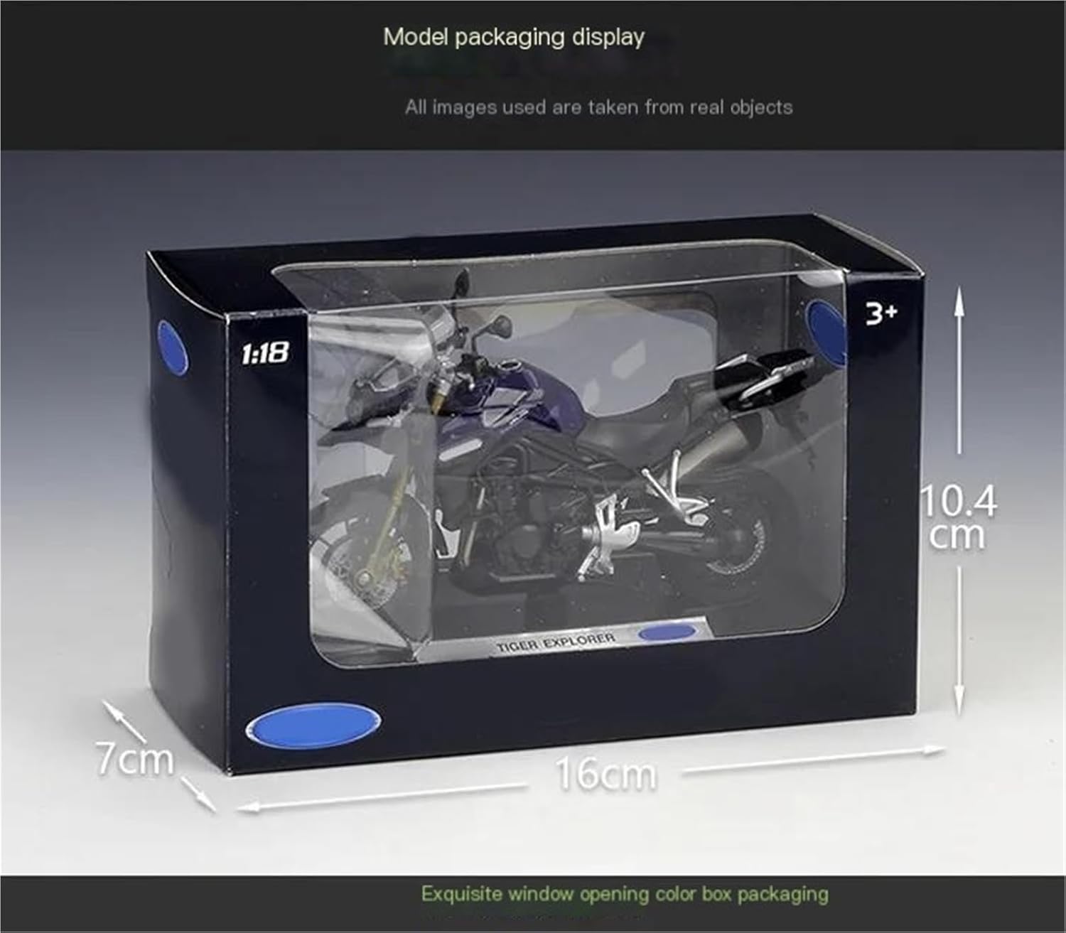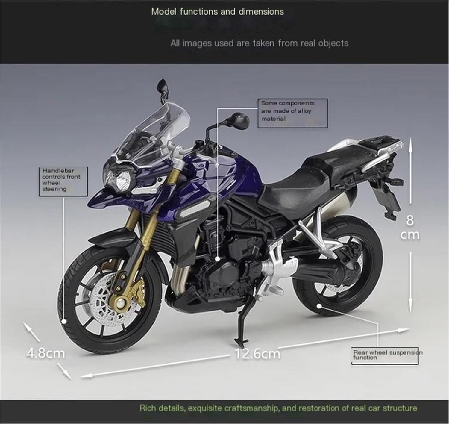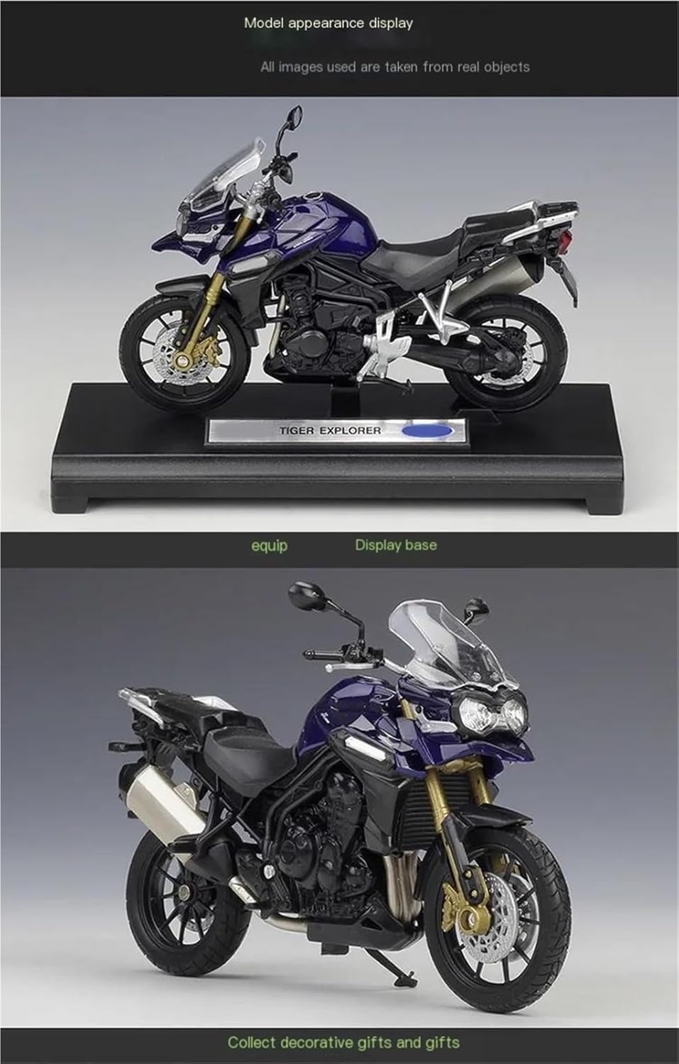 Modello di motocicletta per Tiger Explorer 1200 800 Touring Modelli di motociclette giocattolo in scala 1:18, la ruota anteriore e il manubrio possono oscillare da un lato all'altro, sospensioni posteriori a molla Il modello di motocicletta è un modello squisito realizzato in stretta conformità con la forma, la struttura, il colore, gli interni e altre proporzioni del veicolo originale. È un modello in miniatura del veicolo originale ed è progettato per riprodurre l'aspetto del veicolo originale. La finitura liscia e senza sbavature e la vernice lucida e uniforme dimostrano una maestria artigianale eccezionale. Questo modello incarna lo stile di una motocicletta, soddisfacendo l'amore degli appassionati per i modelli nostalgici.