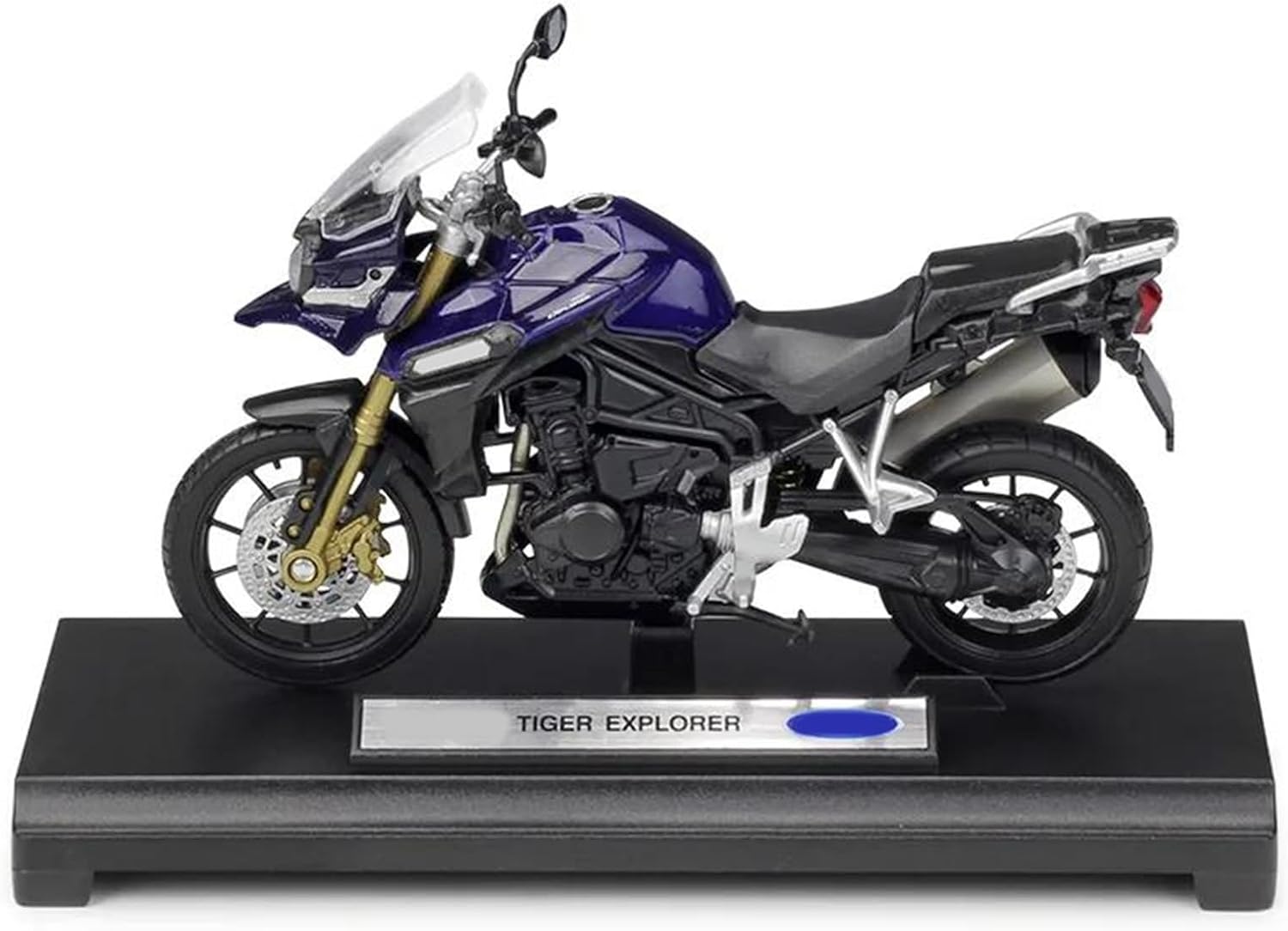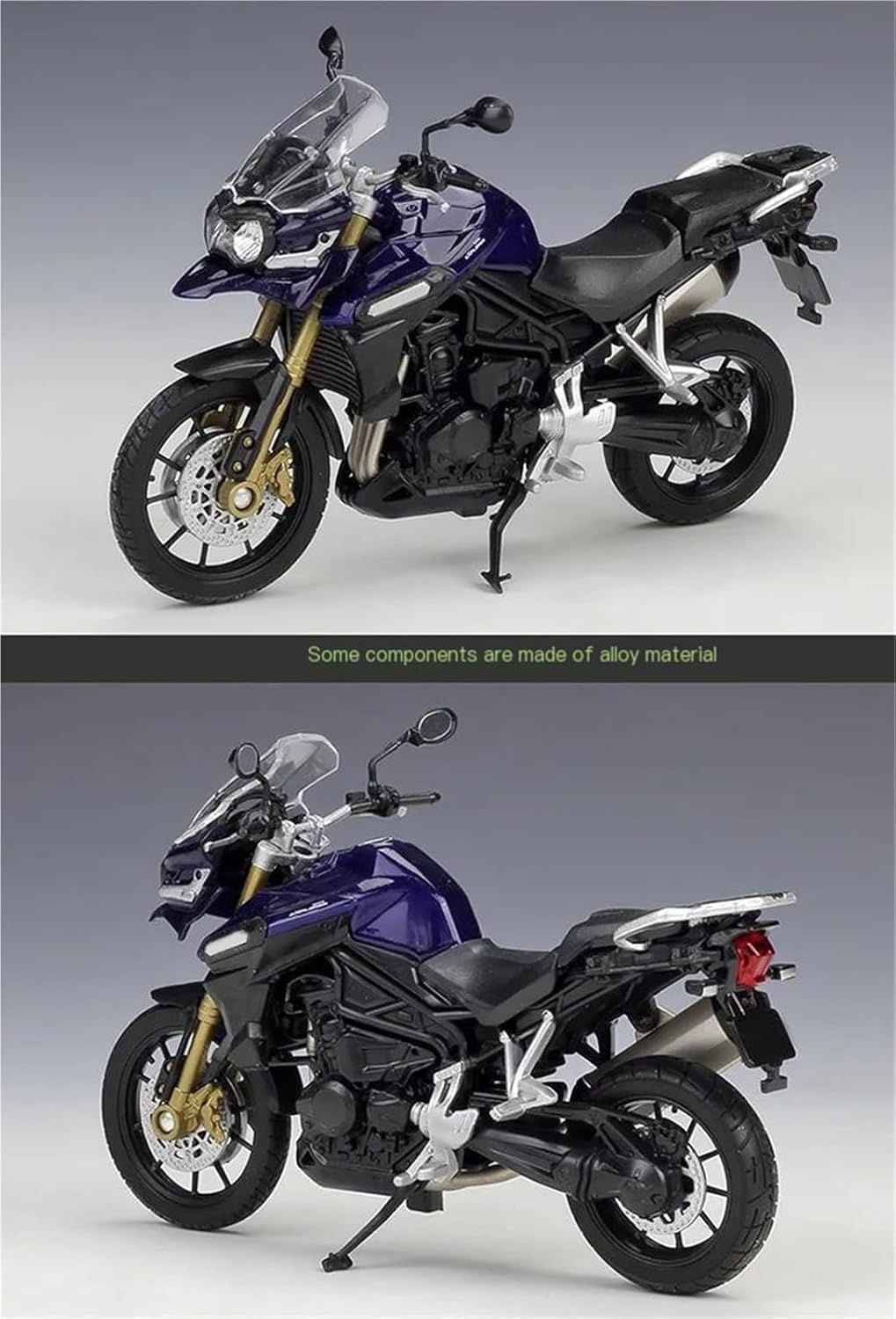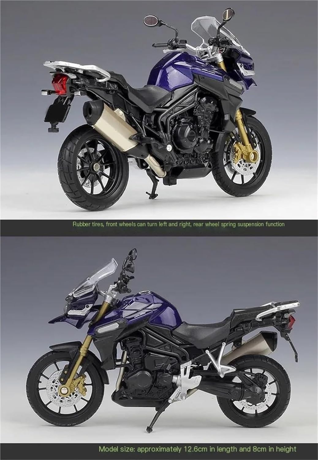 Modello di motocicletta per Tiger Explorer 1200 800 Touring Modelli di motociclette giocattolo in scala 1:18, la ruota anteriore e il manubrio possono oscillare da un lato all'altro, sospensioni posteriori a molla Il modello di motocicletta è un modello squisito realizzato in stretta conformità con la forma, la struttura, il colore, gli interni e altre proporzioni del veicolo originale. È un modello in miniatura del veicolo originale ed è progettato per riprodurre l'aspetto del veicolo originale. Realizzato in resistente lega di zinco, è resistente alle cadute e all'usura, garantendo la durevolezza del modello e la sua lunga conservazione. La finitura della vernice è uniformemente liscia, con colori vivaci e duraturi che resistono allo sbiadimento e alle scheggiature, garantendo un aspetto costantemente brillante.