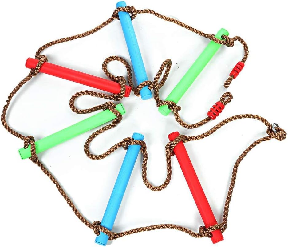 [Pioli robusti e in corda] - Realizzata in plastica di alta qualità, un forte supporto sostiene saldamente il tuo peso per la massima stabilità e sicurezza, una corda in nylon multistrato resistente all'usura attraversa ed è avvolta attorno al piolo per una maggiore durata e robustezza [Resistenza allo scivolamento e presa comoda] - Ogni piolo presenta una rientranza sulla superficie per fornire impugnature comode e impedire lo scivolamento delle mani, garantendo la massima sicurezza per bambini e adulti [Installazione semplice e [Ancore] - Con una chiusura in acciaio inossidabile sulla parte superiore, la scala ninja può essere facilmente attaccabile a un'altalena, una casa sull'albero, una linea ninja, un set da gioco, un ramo di un albero, una sala giochi per bambini e così via, o ancorato al terreno con due ancoraggi a terra per una migliore stabilità (punti di ancoraggio non inclusi) [Dimensioni perfette e supporto fino a 230 libbre] - La scala sospesa misura ca. 200 (L) x 30 (L) cm, che è la dimensione ideale per l'arrampicata di adulti o bambini. Arrampicati selvaggiamente quanto vuoi con pioli robusti e durevoli che possono sostenere un peso fino a 230 libbre senza rompersi [Grande divertimento e vantaggi] - Questa scala di corda da arrampicata arcobaleno a 6 pioli può essere utilizzata all'interno e all'esterno, consentendo ai bambini di godersi il divertimento dell'arrampicata migliorando al tempo stesso l'equilibrio, la coordinazione e la flessibilità, con benefici per la loro salute fisica e mentale
