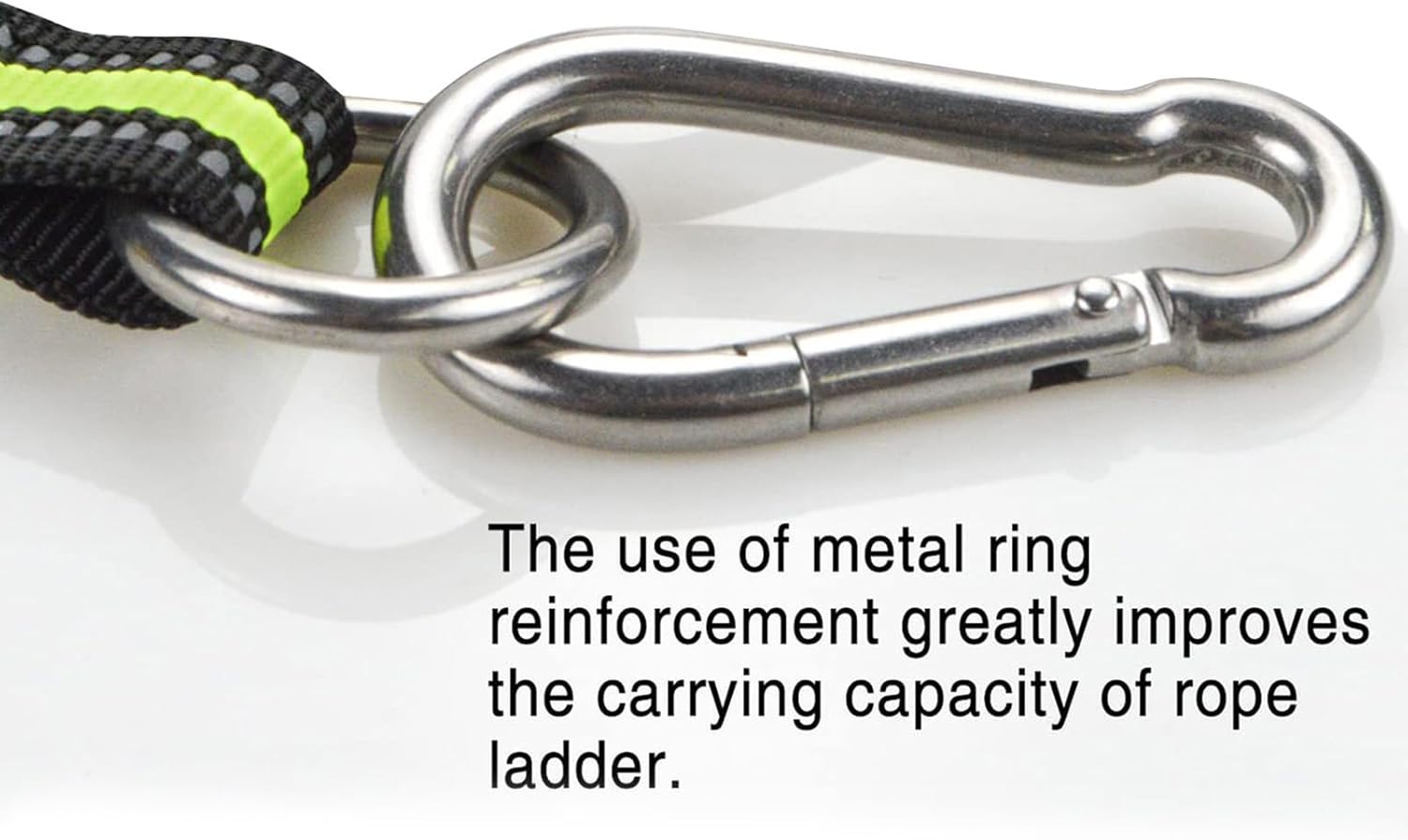 【Alta densità】 La scala da arrampicata ad alta densità è durevole, resistente ai raggi UV, durevole e può sopportare un carico di 100 kg. L'assistente per l'arrampicata è dotato di un gancio in acciaio inossidabile ad alta resistenza per un facile utilizzo. Comodo design del gancio: questo portiere viene fornito con 1 gancio, che lo rende facile da usare e rimuovere. Puoi installare le scale in corda su telai, alberi o soffitti. Durevole e affidabile: la scala in corda da arrampicata è realizzata in robusta corda di poliestere di alta qualità, durevole e resistente all'usura. Il design della striscia riflettente lo rende più sicuro da usare di notte. PERFETTO PER I BAMBINI: Ora hai la scelta perfetta per un regalo di vacanza per bambini: una scala di corda su cui i bambini possono arrampicarsi. Utilizzare sotto la supervisione di un adulto. Multiuso: il portiere da arrampicata può essere utilizzato come scala per barca o per aggiungere ulteriori gradini a qualsiasi esigenza di scala esistente, ideale anche per l'arrampicata all'aperto e l'arrampicata su roccia