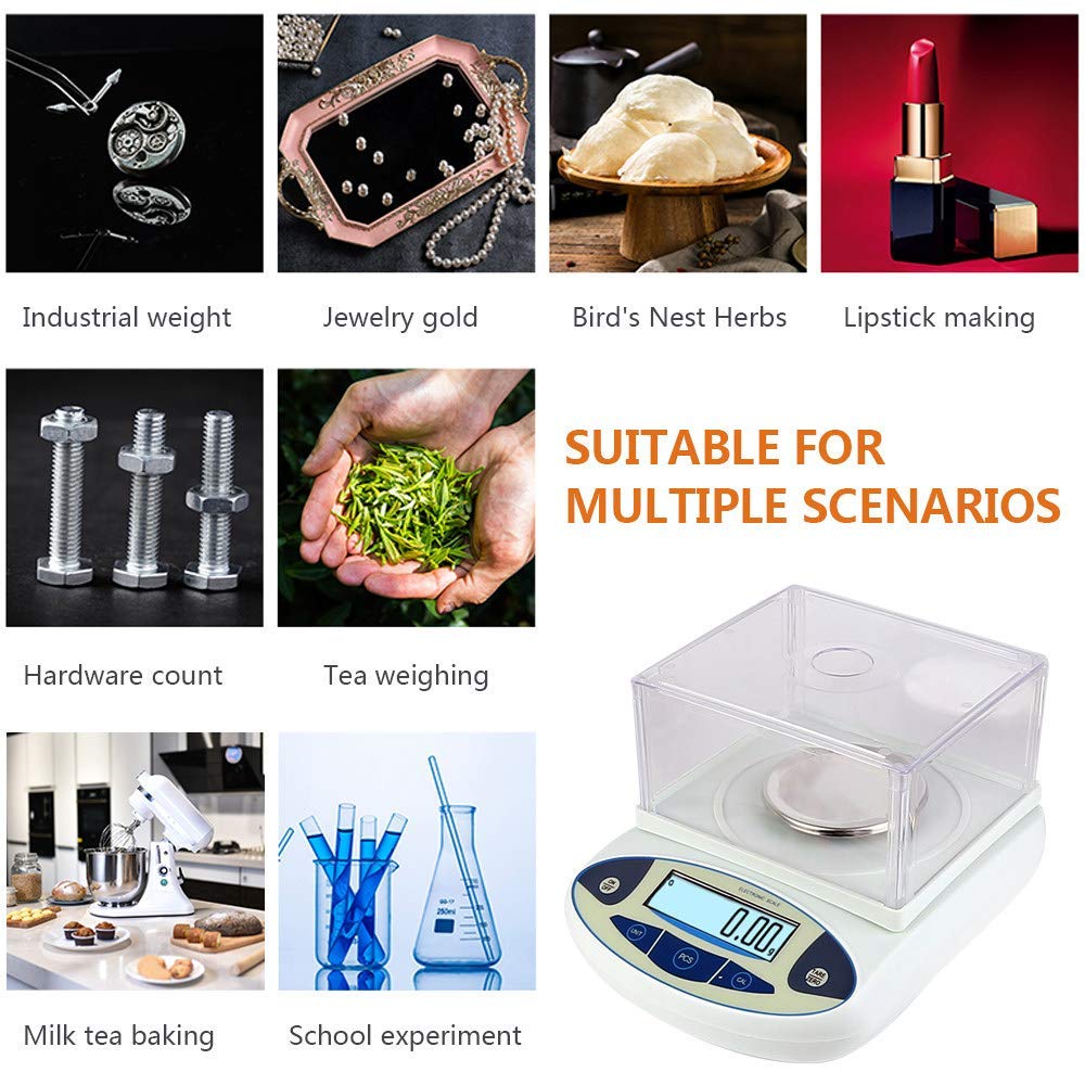[Alta precisione]: questo equilibrio analitico elettronico ha un sensore ad alta precisione integrato con una precisione di 0,001 g.È ideale per pesare gioielli, viti, ingredienti da cucina. [Multifunzione]: La bilancia elettronica dispone di funzioni quali sbucciatura, autocorrezione, memorizzazione, conteggio, visualizzazione degli errori, ecc. Ad esempio, è possibile pesare e calcolare il peso. [Stabilità]: il parabrezza è progettato per impedire all'ambiente esterno di influire sul valore preciso della misurazione.Vassoio in acciaio inossidabile, superficie spazzolata, resistente all'umidità, resistente alla corrosione, non facile da arrugginire. [Facile da usare]: schermo LCD e pulsanti intelligenti, funzionamento semplice, due metodi di alimentazione, uso della batteria o utilizzo dell'adattatore di alimentazione (non può essere caricato). [Uso ampio]: Utilizzato in spezie di cottura, cottura in cucina, gioielli, oro, parti industriali, laboratori chimici, ecc. Promemoria: assicurarsi di mantenere l'equilibrio stabile e regolare l'equilibrio regolando i quattro bulloni neri sul pulsante di bilanciamento.