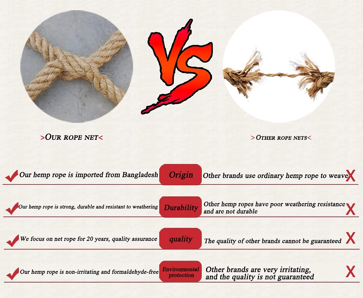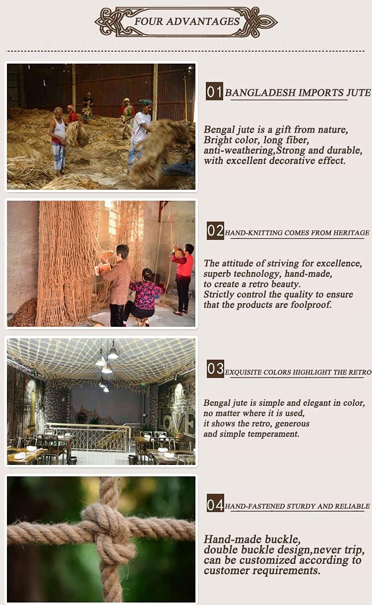 Servizio personalizzatoLe nostre reti in corda sono progettate per varie applicazioni, fornendo opzioni versatili sia per uso interno che esterno. Esplora la nostra gamma per trovare la soluzione perfetta per le tue esigenze. Il nostro team è qui per aiutarti a selezionare la specifica ideale, garantendo le migliori prestazioni per le tue esigenze specifiche. Rete di sicurezza su misura con diametro del filo di 8 mm e distanza tra le maglie di 10 cm. Personalizza la tua rete protettiva in base alle tue esigenze specifiche. Scegli la distanza e il colore della maglia desiderati per una vestibilità perfetta. Per richieste di personalizzazione, si prega di contattare via e-mail. Ideale per diverse applicazioni, garantendo sicurezza e affidabilità. Realizzata in iuta del Bangladesh di alta qualità, questa rete di sicurezza per bambini presenta colorazione naturale e fibre lunghe. Le sue proprietà resistenti alle intemperie garantiscono la massima facilità per un uso prolungato. Perfetto per migliorare l'arredamento, aggiunge un tocco di fascino vintage a qualsiasi spazio garantendo sicurezza ai tuoi piccoli. Ideale per ambienti interni ed esterni. Vi presentiamo le nostre versatili reti in corda di iuta, perfette per varie applicazioni. Ideale per porte e finestre, corridoi, scale, balconi, ringhiere, culle, recinti per animali domestici, asili, parchi giochi, strutture pubbliche, recinzioni paesaggistiche e pareti esterne. Migliora la sicurezza e l'estetica con questa soluzione ecologica Design a doppia fibbia: la nostra rete da arrampicata presenta un sistema rinforzato a doppia fibbia con corde sui bordi, utilizzando tecniche di annodamento sicure e tessitura a più fili per uno spessore uniforme e una maggiore ilità. Questa robusta costruzione promette sicurezza e versatilità affidabili, rendendolo una scelta ideale per avventure all'aperto, percorsi ad ostacoli e parchi giochi.