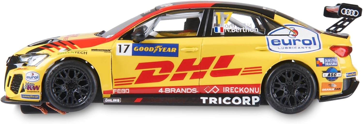 Auto Slot per circuiti Scalextric Originale: Auto scala 1:32 in finiture e disegni attraenti. Goditi la corsa con la tua auto preferita. Splendida Audi RS3 LMS TCR - DHL in scala 1/32: Riproduce in una finitura iper realistica per un'esperienza completa in ogni gara. Con luci, guida con sospensione, magnete regolabile e telaio dettagliato Aiuta a sviluppare le capacità psico-motorie, riflessi e capacità di concentrazione dei bambini È il giocattolo ideale per incoraggiare l'interattività tra genitori e figli, mentre questi ultimi imparano a giocare