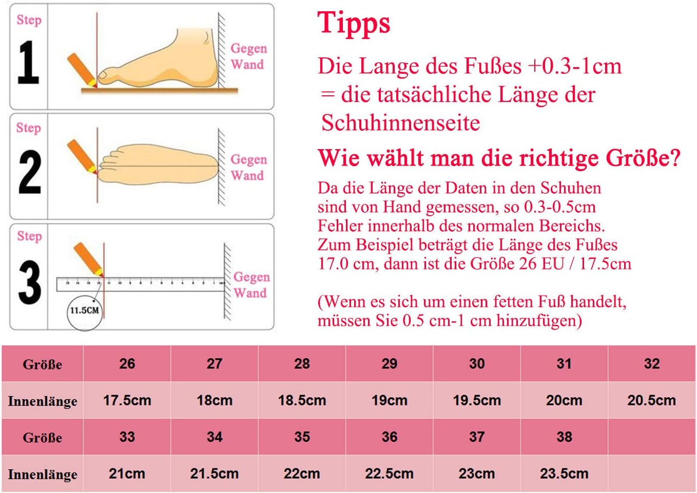 Ich habe zum Glück die Schuhe eine Nummer größer bestellt..... Und sie passen. Meine Tochter liebt diese Schuhe. Leider ist die Sohle nicht durchgängig bei den Zehansätze und rollt sich hoch. Jetzt haben wir diese feszgeklebt und eine Einlagen drin. Ganz ok aber nicht perfekt gelöst. Trotzdem ist Kind zufrieden
