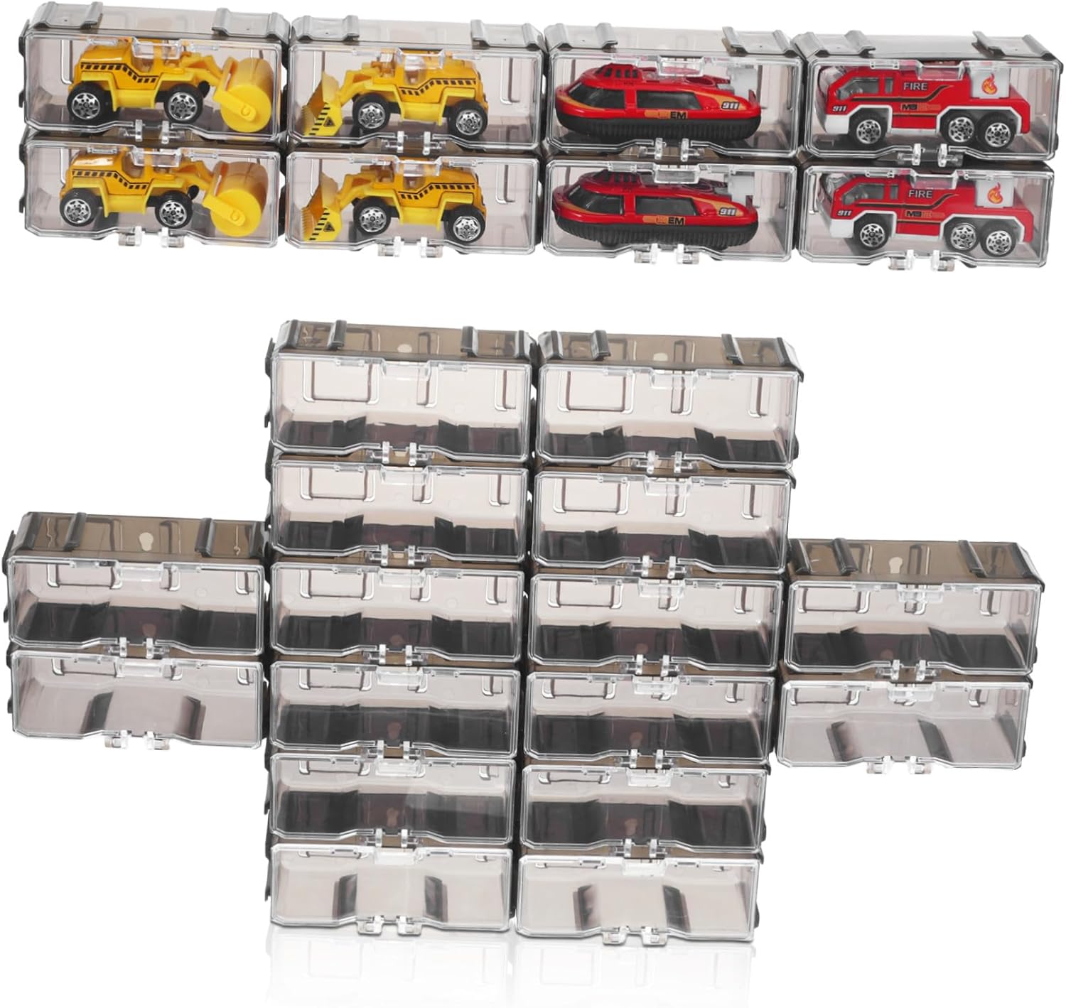 Lussuosa scatola impilabile per presentazione, esposizione e smistamento in plastica trasparente con coperchio incernierato per la raccolta protetta e la presentazione di ulteriori figure di uova a sorpresa, fossili, ecc. con 12 scomparti fissi. Dimensioni esterne: lunghezza 195 mm, larghezza: 100 mm, altezza: 30 mm. Dimensioni scomparto: lunghezza: 31 mm, larghezza 48 mm, altezza interna: ca. 28 mm. Materiale: plastica trasparente
