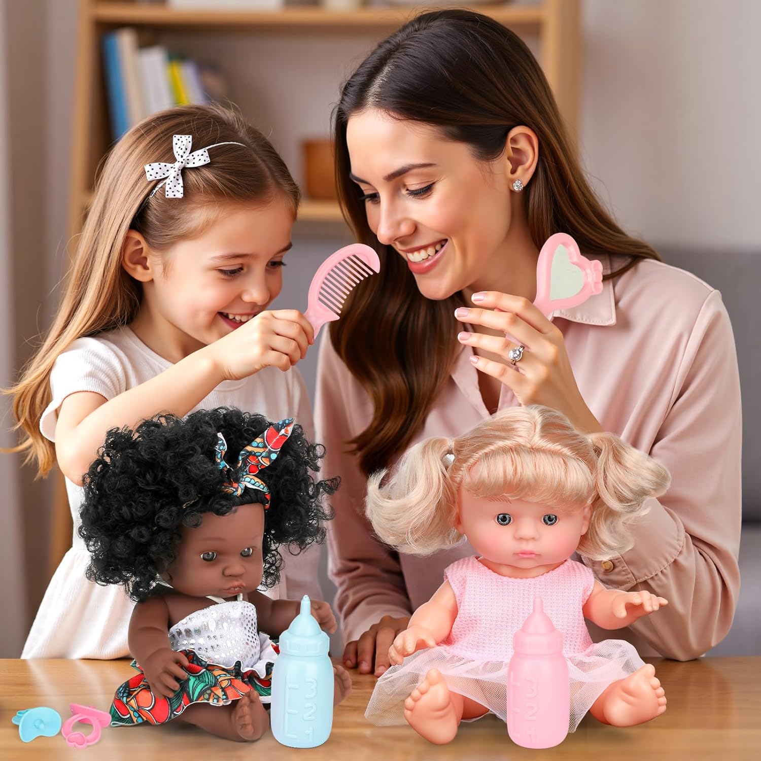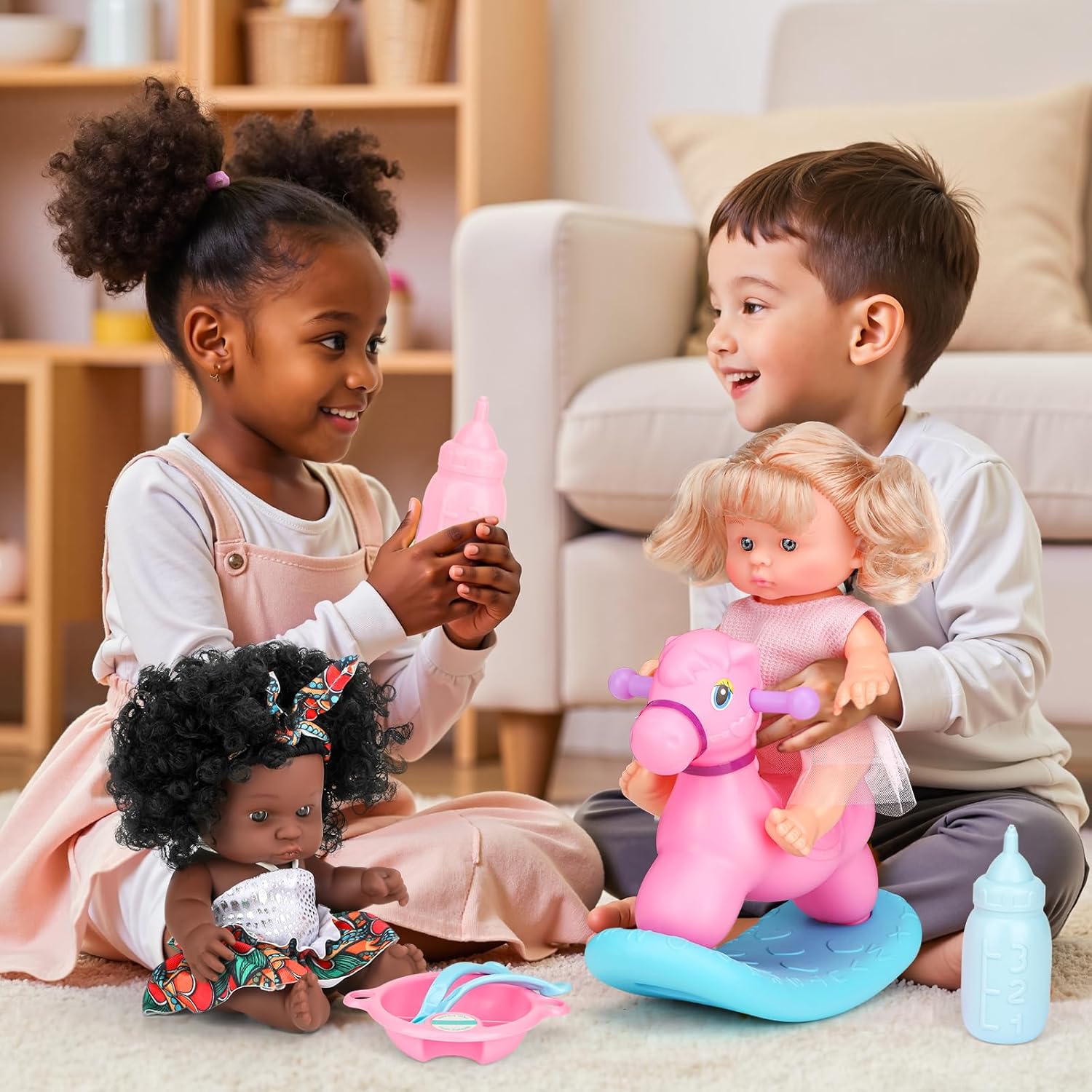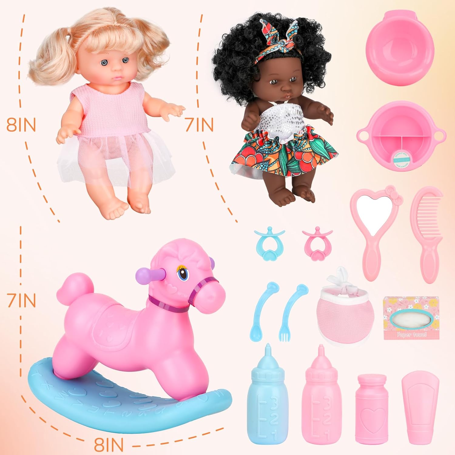 Bambole diverse per un gioco inclusivo - Include due bambole culturalmente ricche: una con trecce bionde e gonna in tulle, l'altra con capelli neri ricci, fascia stampata e gonna vivace. Le loro caratteristiche distinte e le varie tonalità della pelle promuovono l'inclusione e l'immaginazione, consentendo ai bambini di esplorare la diversità attraverso il gioco. Accessori interattivi tutto in uno: il set da 17 pezzi include un cavallo a dondolo rosa, strumenti per la toelettatura (pettine, specchio), elementi essenziali per la pappa (biberon, bavaglino, piatto, cucchiaio) e oggetti di gioco come una coppa per il seno e una "scatola di asciugamani di carta". Tutto per nutrire, curare e fornire assistenza è incluso! Vantaggi educativi e di sviluppo - Sviluppa capacità motorie con arti articolati e abbigliamento realistico. Stimola l'empatia, la responsabilità e le abilità sociali mentre i bambini si prendono cura delle loro bambole. Ideale per imitare scenari di vita reale (dare da mangiare, accudire, dondolare). Design sicuro, durevole e adatto ai bambini - Realizzato in plastica atossica e priva di BPA con bordi arrotondati per la sicurezza. Leggere e adatte alle mani dei più piccoli, le bambole (20 cm e 18 cm) e gli accessori resistono per ore di gioco. Dimensioni compatte da portare ovunque. Regalo perfetto per tutti: ideale per compleanni, Natale e OCC, per ragazzi, ragazze e bambini in età prescolare (3-8 anni). Perfetto per famiglie con più bambini, regala momenti di gioia e creatività.