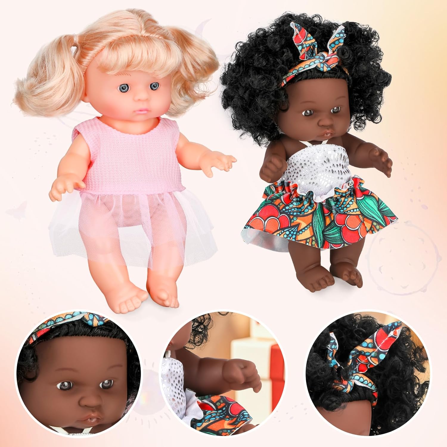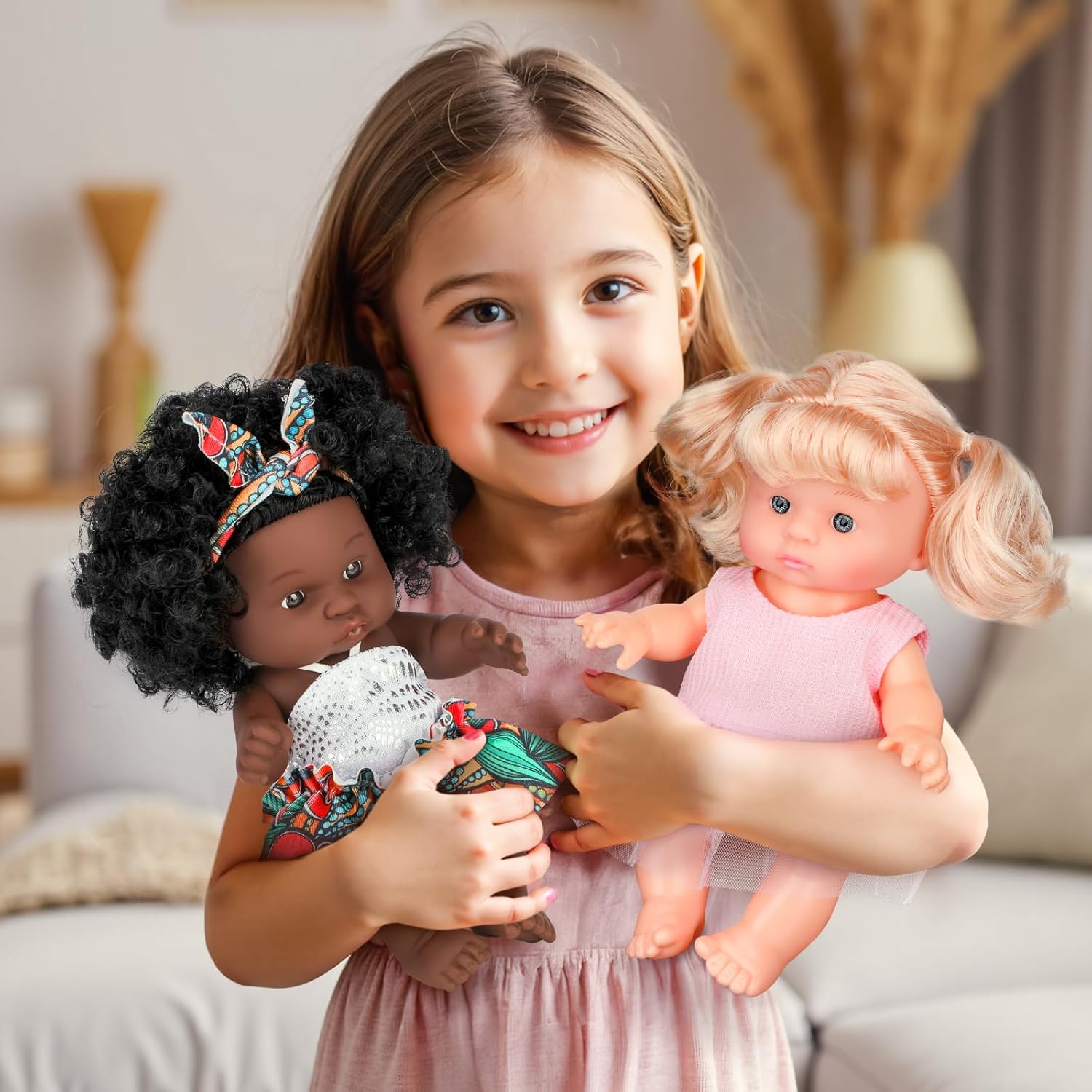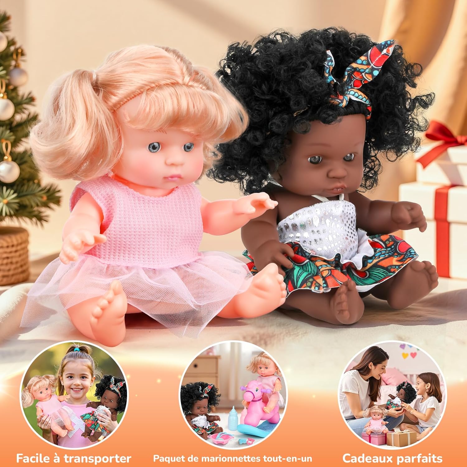 Bambole diverse per un gioco inclusivo - Include due bambole culturalmente ricche: una con trecce bionde e gonna in tulle, l'altra con capelli neri ricci, fascia stampata e gonna vivace. Le loro caratteristiche distinte e le varie tonalità della pelle promuovono l'inclusione e l'immaginazione, consentendo ai bambini di esplorare la diversità attraverso il gioco. Accessori interattivi tutto in uno: il set da 17 pezzi include un cavallo a dondolo rosa, strumenti per la toelettatura (pettine, specchio), elementi essenziali per la pappa (biberon, bavaglino, piatto, cucchiaio) e oggetti di gioco come una coppa per il seno e una "scatola di asciugamani di carta". Tutto per nutrire, curare e fornire assistenza è incluso! Vantaggi educativi e di sviluppo - Sviluppa capacità motorie con arti articolati e abbigliamento realistico. Stimola l'empatia, la responsabilità e le abilità sociali mentre i bambini si prendono cura delle loro bambole. Ideale per imitare scenari di vita reale (dare da mangiare, accudire, dondolare). Design sicuro, durevole e adatto ai bambini - Realizzato in plastica atossica e priva di BPA con bordi arrotondati per la sicurezza. Leggere e adatte alle mani dei più piccoli, le bambole (20 cm e 18 cm) e gli accessori resistono per ore di gioco. Dimensioni compatte da portare ovunque. Regalo perfetto per tutti: ideale per compleanni, Natale e OCC, per ragazzi, ragazze e bambini in età prescolare (3-8 anni). Perfetto per famiglie con più bambini, regala momenti di gioia e creatività.