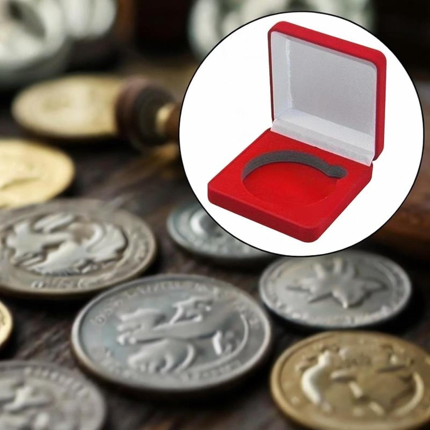 【Materiale】: Realizzata in velluto, questa scatola espositiva per monete è robusta, con rivestimento interno, che la protegge dai danni 【Caratteristica】: la scatola espositiva è dotata di una cerniera liscia e affidabile, può essere aperta a 90° per un facile posizionamento degli oggetti, aprendosi e chiudendosi senza problemi 【Compatto】: la scatola porta monete Challenge è compatta ma abbastanza spaziosa da contenere in modo sicuro vari piccoli oggetti da collezione. 【Protezione versatile per monete】: progettata per contenere monete con un diametro di 55 mm, questa scatola di presentazione in velluto offre un'ottima protezione per la tua importante moneta commemorativa 【Ampiamente utilizzato】: la vetrina in velluto per medaglie può essere elegantemente posizionata nella tua casa, nel tuo soggiorno o nella vetrina del negozio per migliorare l'arredamento mantenendo organizzati i tuoi oggetti preziosi