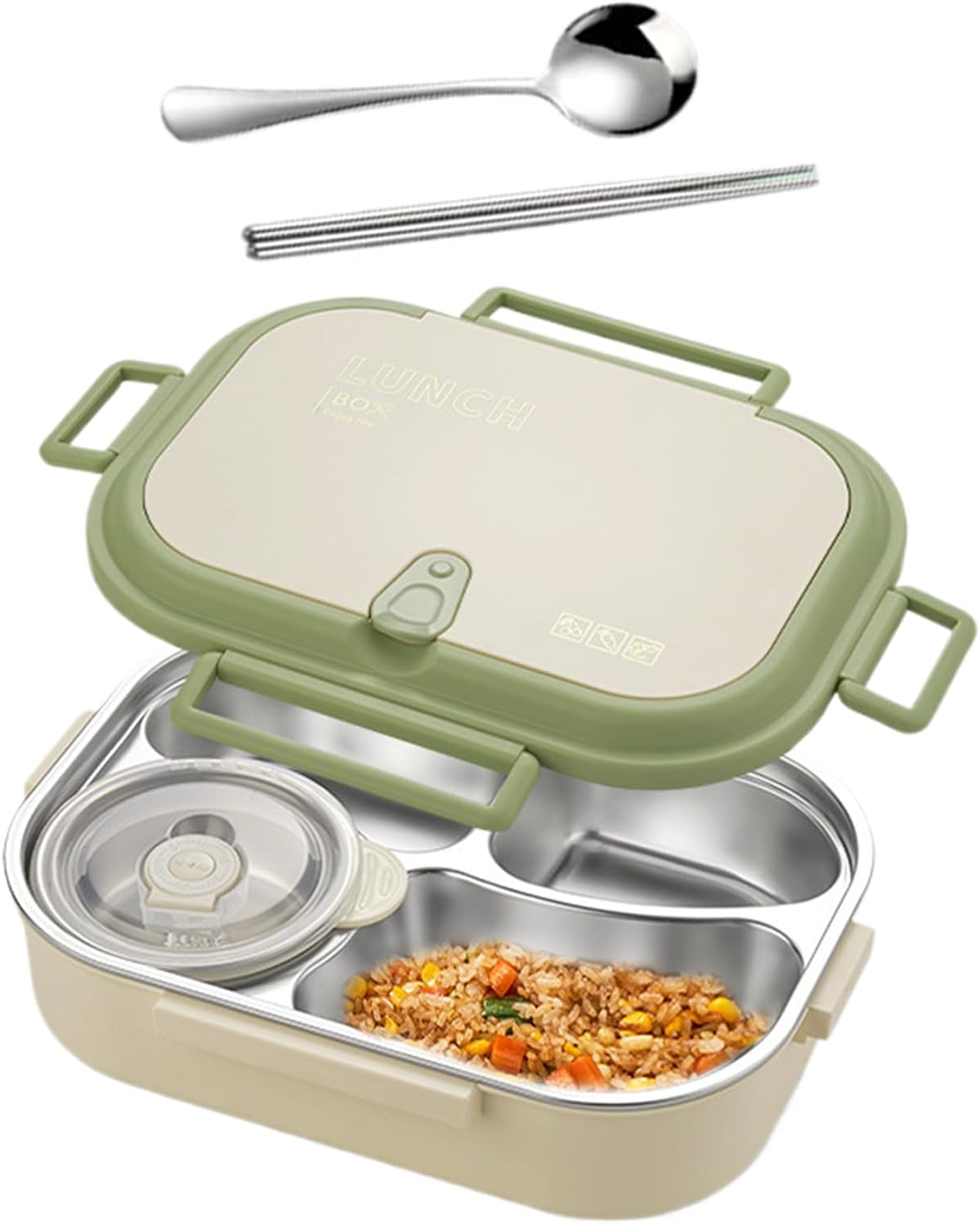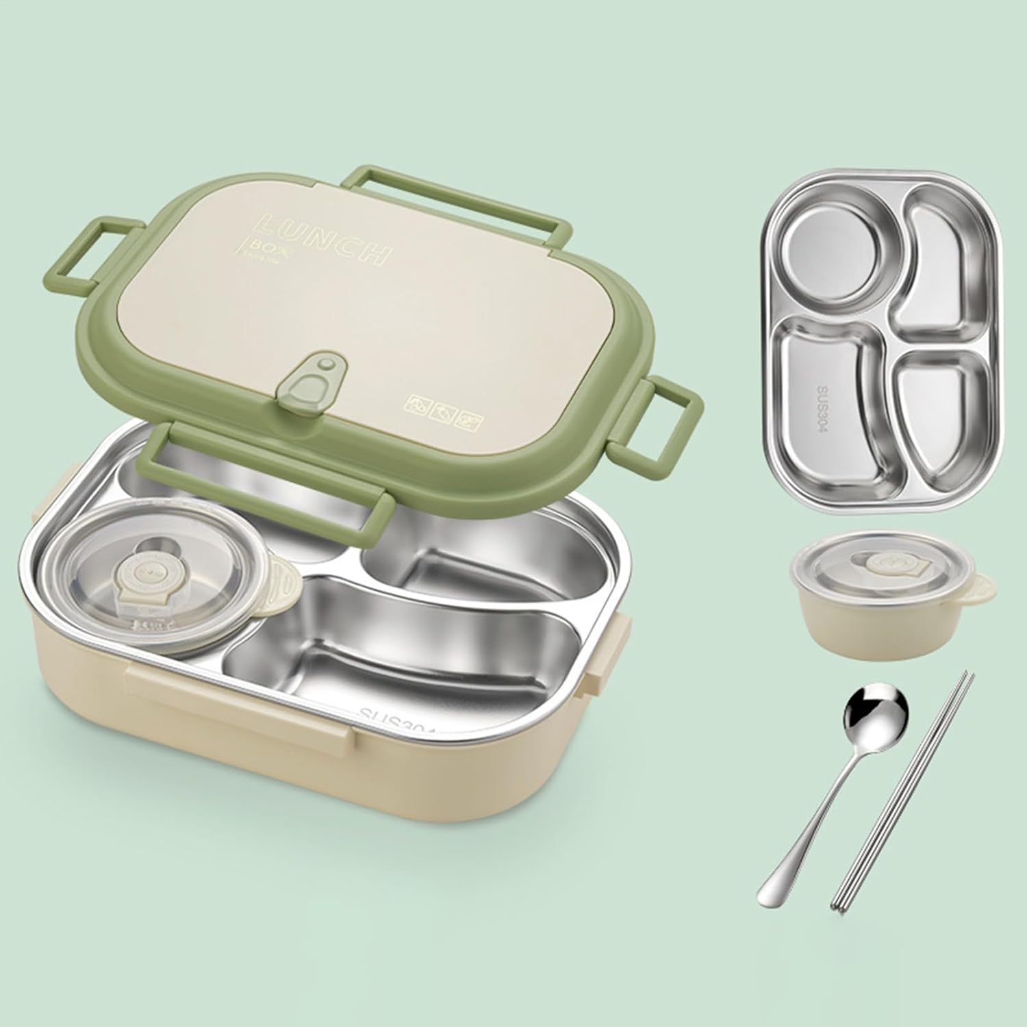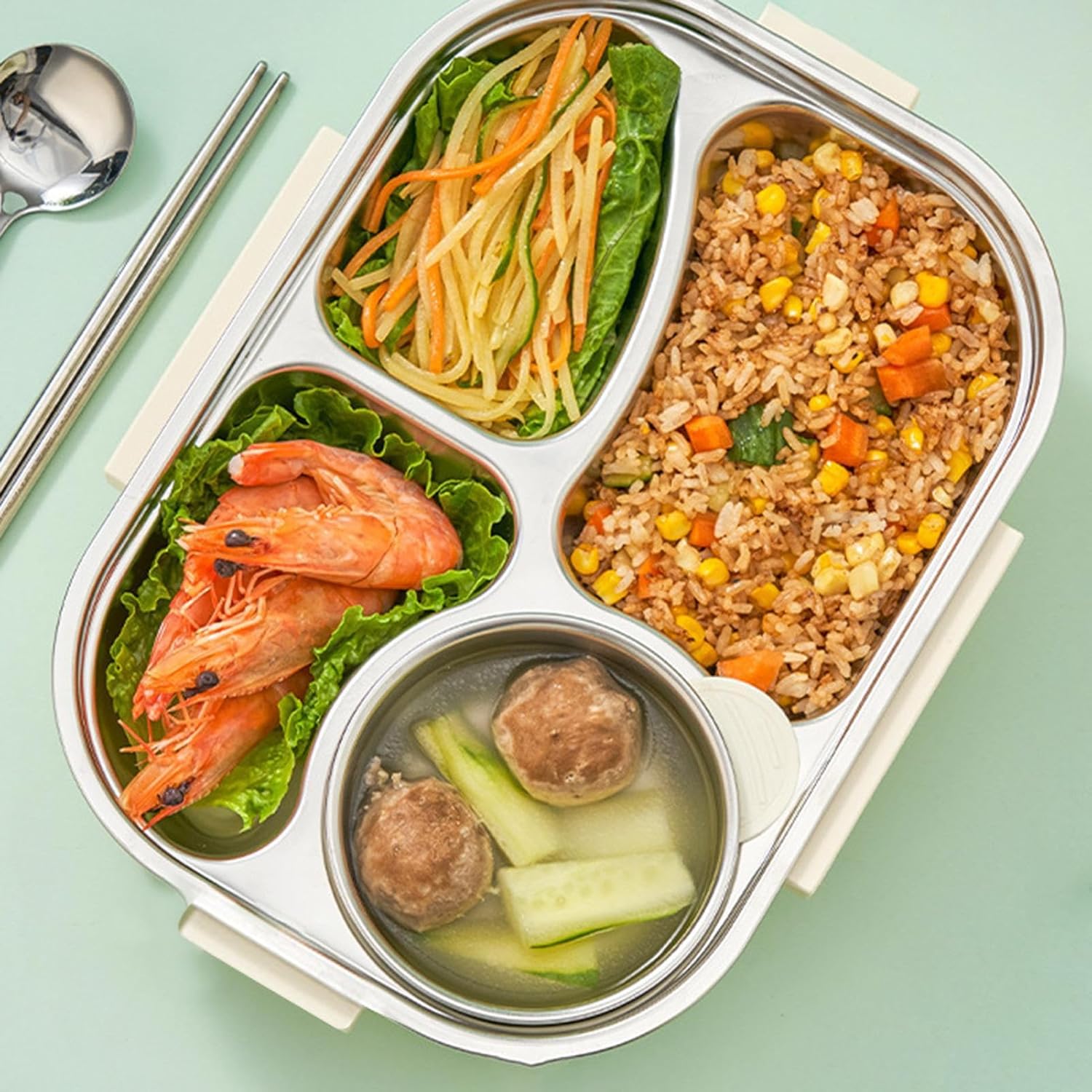 CostruziRobusta: Il portavivande è realizzato in acciaio inossidabile 304 e PP, assicurando sicurezza, salubrità e assenza di sostanze nocive. Le proprietà resistenti a ruggine e usura lo rendono durevole, ideale per conservare i pasti quotidianamente a lavoro o a scuola, supportando stile di vita ecologico. Tenuta ermetica affidabile: La combinazidi anello di silice robuste clip di blocco assicura prestazioni antiperdita, consentendo di trasportare yogurt o sughi in sicurezza durante pendolarismo, escursioni o piacevoli picnic all'aperto Assistenza Calore Pratica: Con riscaldamento a base calda e acqua calda sul fondo, questo porta pranzo in acciaio inossidabile assicura che i pasti dei bambini rimangano caldi senza sforzo. La compatibilità microonde migliora l'usabilità. Adatto per gite all'aperto e pranzi in classe con mantenimento temperatura ottimale Soluzi-: La lunch box in acciaio inossidabile include utili come chopsticks e cucchiaio, assicurando convenienza durante i pasti senza utensili aggiuntivi. La pulizia è effortless grazie agli angoli arrotondati, perfetta per uso quotidiano ovunque. Layout multiscomparto funzionale: I contenitori per alimenti in acciaio inossidabile offrono una disposiziintelligente con 4 o 5 sezioni per separare zuppe, insalate e spuntini, evitando la fusidegli aromi e facilitando la preparazidei pasti, specialmente per famiglie impegnate o attività all'aperto