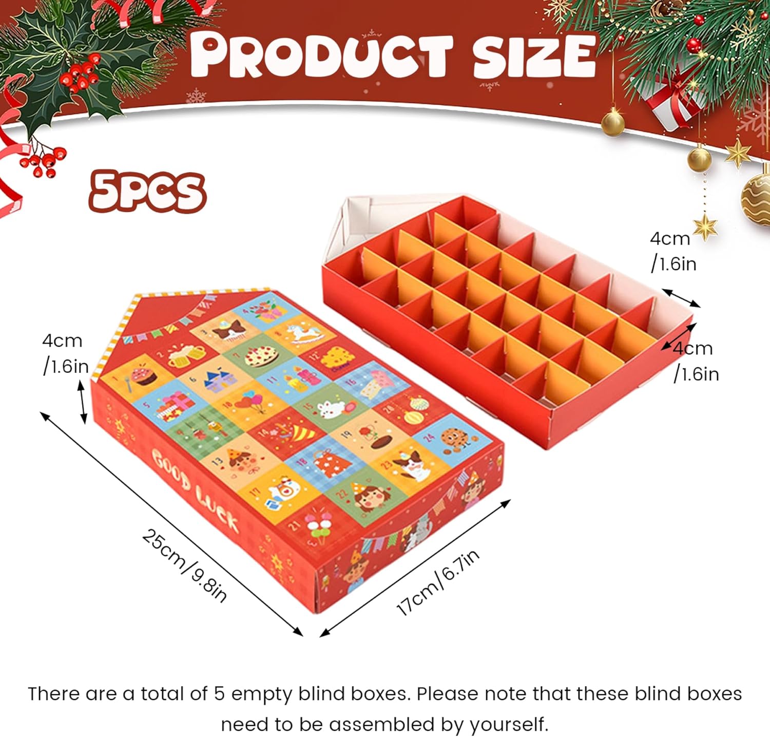 Esperienza coinvolgente: incoraggia il legame familiare e la creatività mentre gli utenti personalizzano ogni giorno, rendendo le festività natalizie indimenticabili con sorprese quotidiane uniche Uso multiuso: ideale per varie occasioni oltre il Natale, come compleanni o eventi speciali, fornendo una soluzione di calendario dell'avvento riutilizzabile e adattabile Divertimento con il conto alla rovescia: scatole per calendario dell'Avvento da 5 pezzi progettate per un conto alla rovescia di 24 giorni, perfette sia per bambini che per adulti per creare entusiasmo durante le festività natalizie Materiale di qualità: realizzato con materiali robusti per contenere in modo sicuro piccoli regali o dolcetti, garantendo durata durante tutto il periodo del conto alla rovescia senza danni o usura Design personalizzabile: queste scatole vuote del calendario dell'avvento ti consentono di riempire le tue sorprese, offrendo un'esperienza versatile di calendario dell'avvento fai-da-te su misura per le preferenze e i regali personali